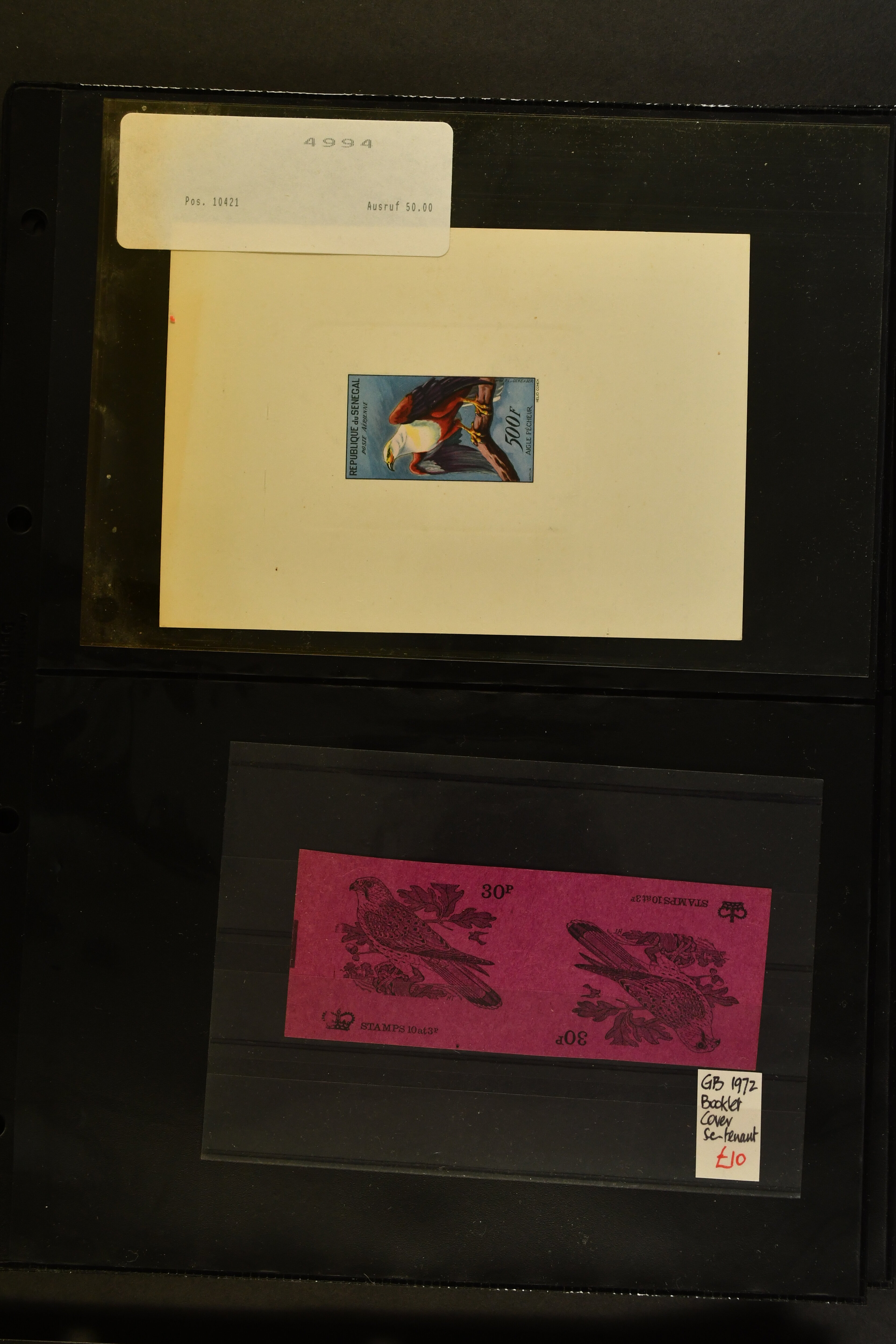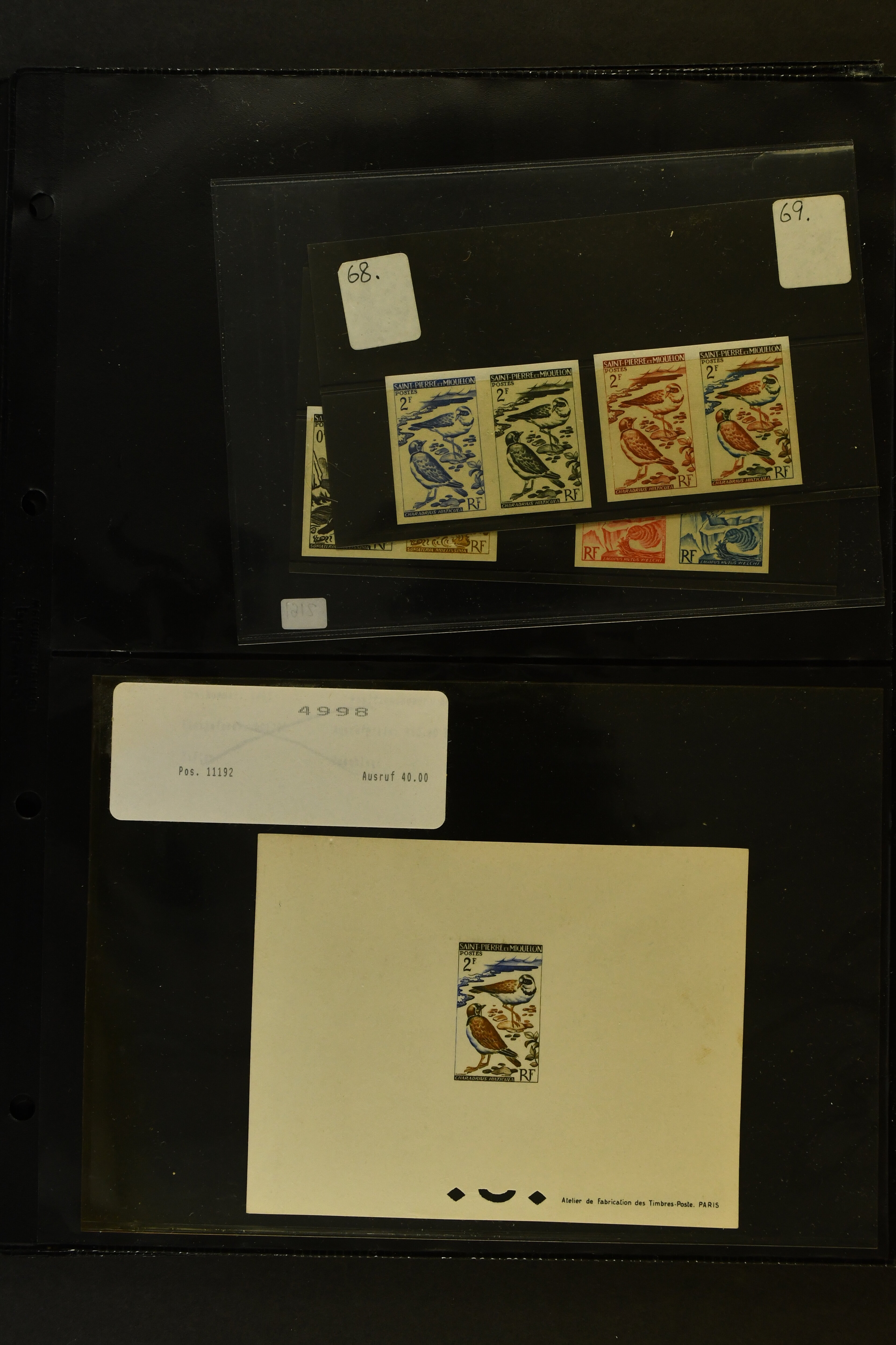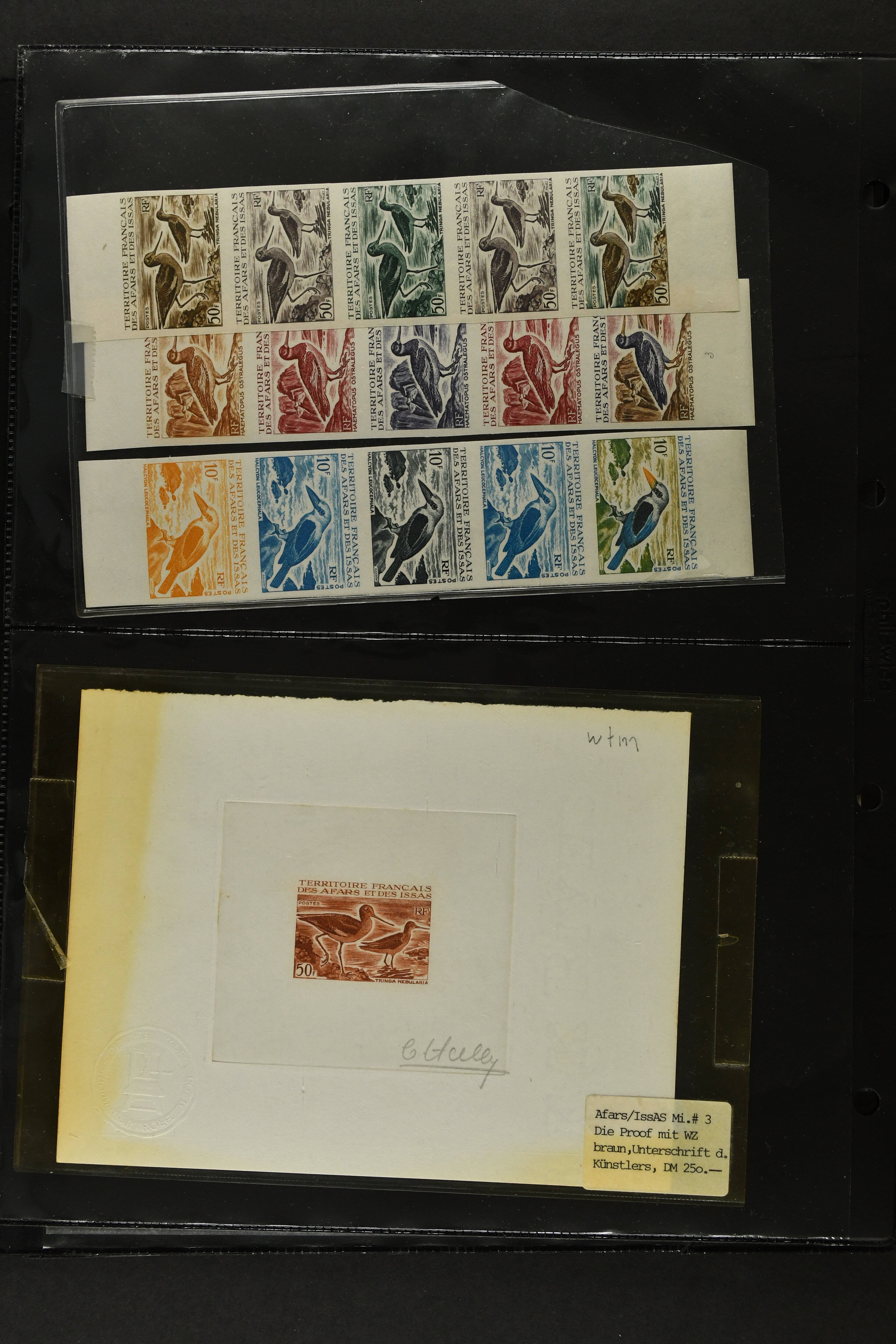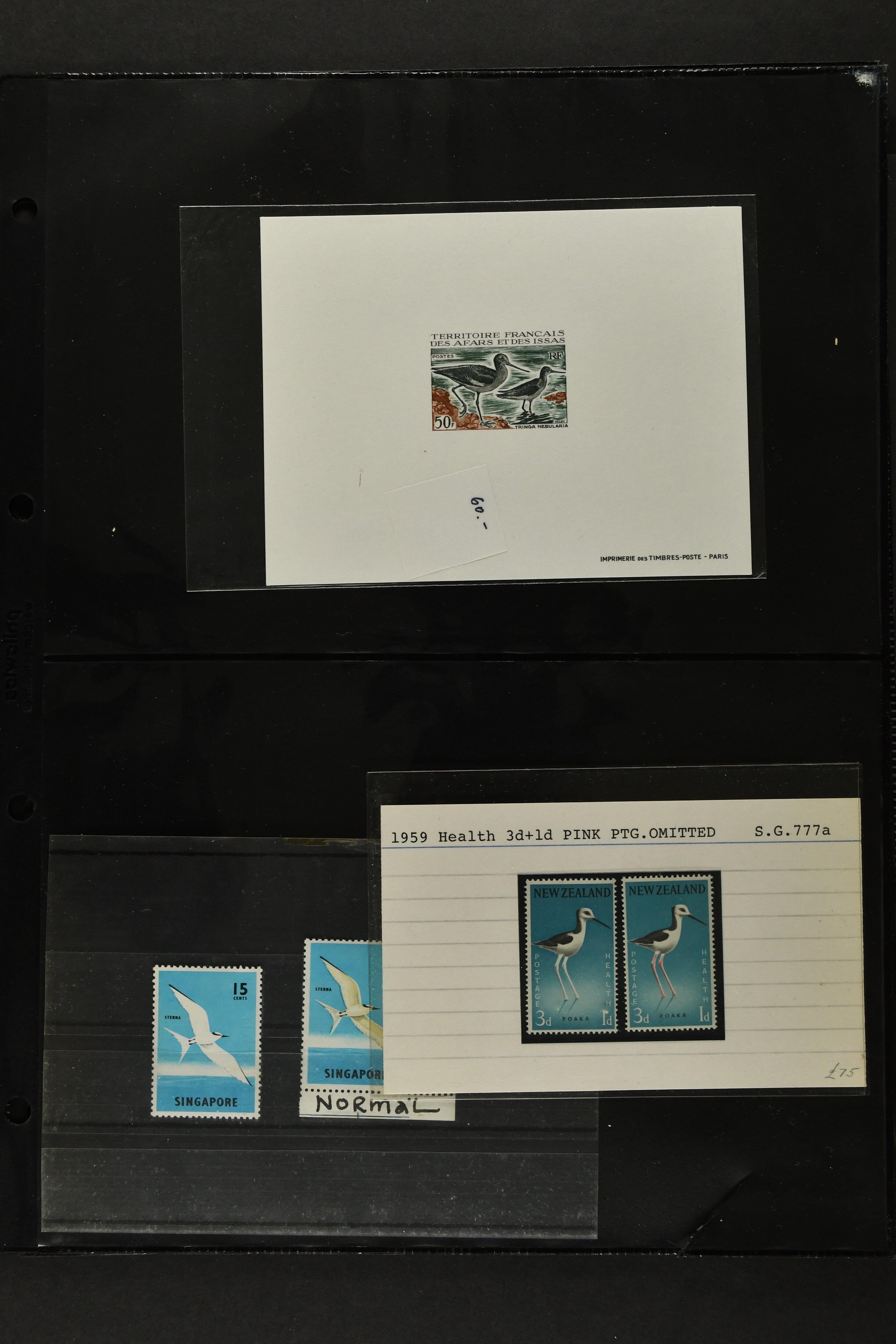 2757 imageTopical Selection Birds from Sweet and Salt Water, a special group of 16 primarily unused adhesives / multiples with varieties and proofs incl. UK 1988 Bewick's Swan in imperf. pair, UK 1989 Gannet with Silver flaw, Monaco 1955 Sea Birds, compl. set of four imperf., Pollution des Eaux de Mer Trial Colour proofs in a vertical strip of five, France 1960 Sarcelles / Teals in a strip of five colour proofs, St. Pierre et Miquelon Puffins Trial Colour plate proofs in a multicolour strip of five, Seabirds, three values 50 c., 1 f. and 2 f. in colours proofs and 2 f. as epreuve de luxe, Affars & Issas 1967 Sea Birds 10 f., 15 f. and 50 f. Trial Colour plate proofs in a multicolour strip of five, and two epreuves, one signed by the designer, two adhesives from New Zealand and Singapore with variety missing colour, Mauretania two multicolour proofs, one Audubon anniversary proof from Benin, a misfolded pair of miniature sheets from Uganda showing zebras and Cattle Egret; and finally Newfoundland, a sunk die proof depicting a Salmon - King of the Rivers (the describer knows that this is not a bird). (Image 1) (Image 2) (Image 3) (Image 4) (Image 5) (Image 6) (Image 7) (Image 8)