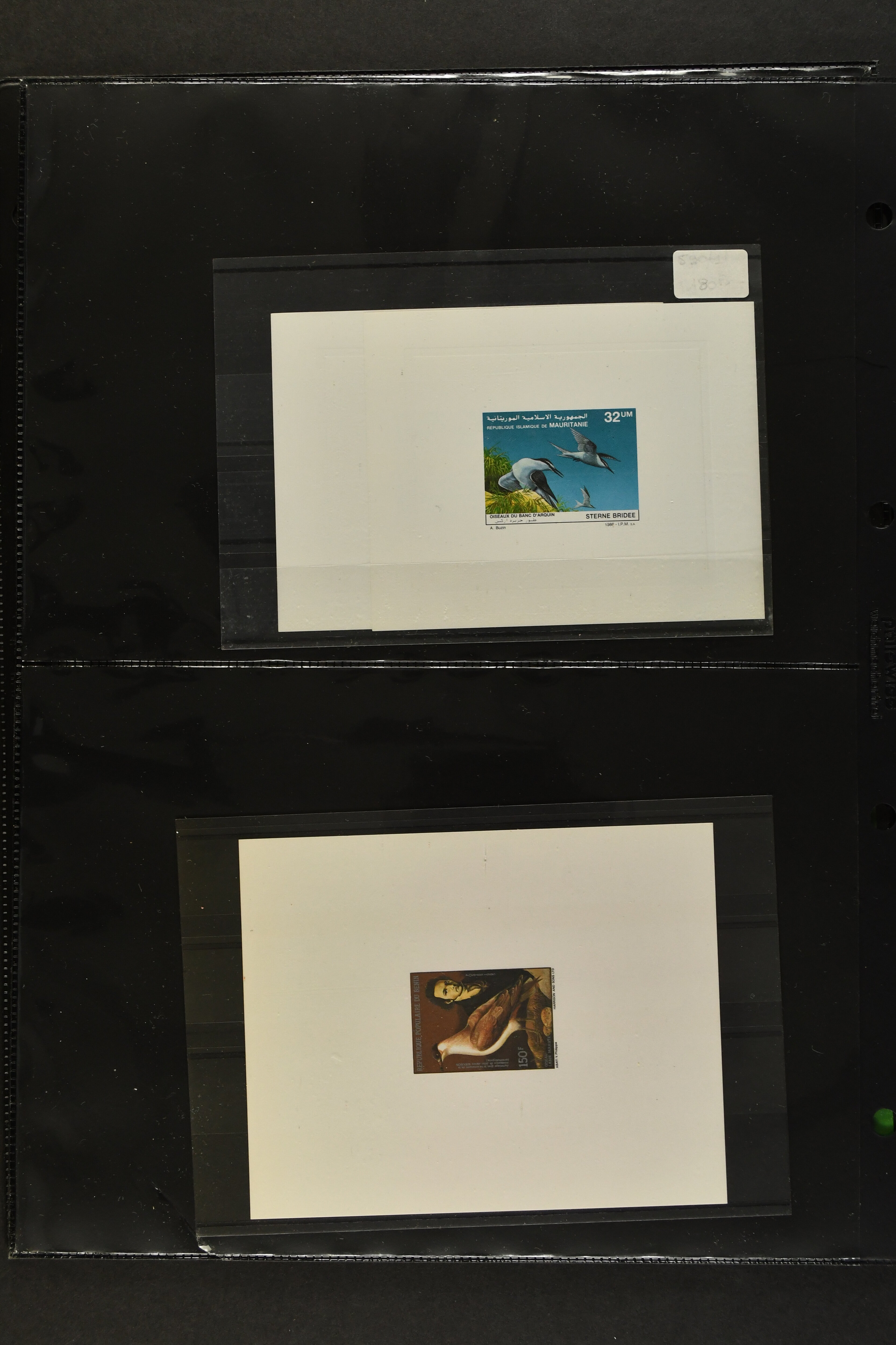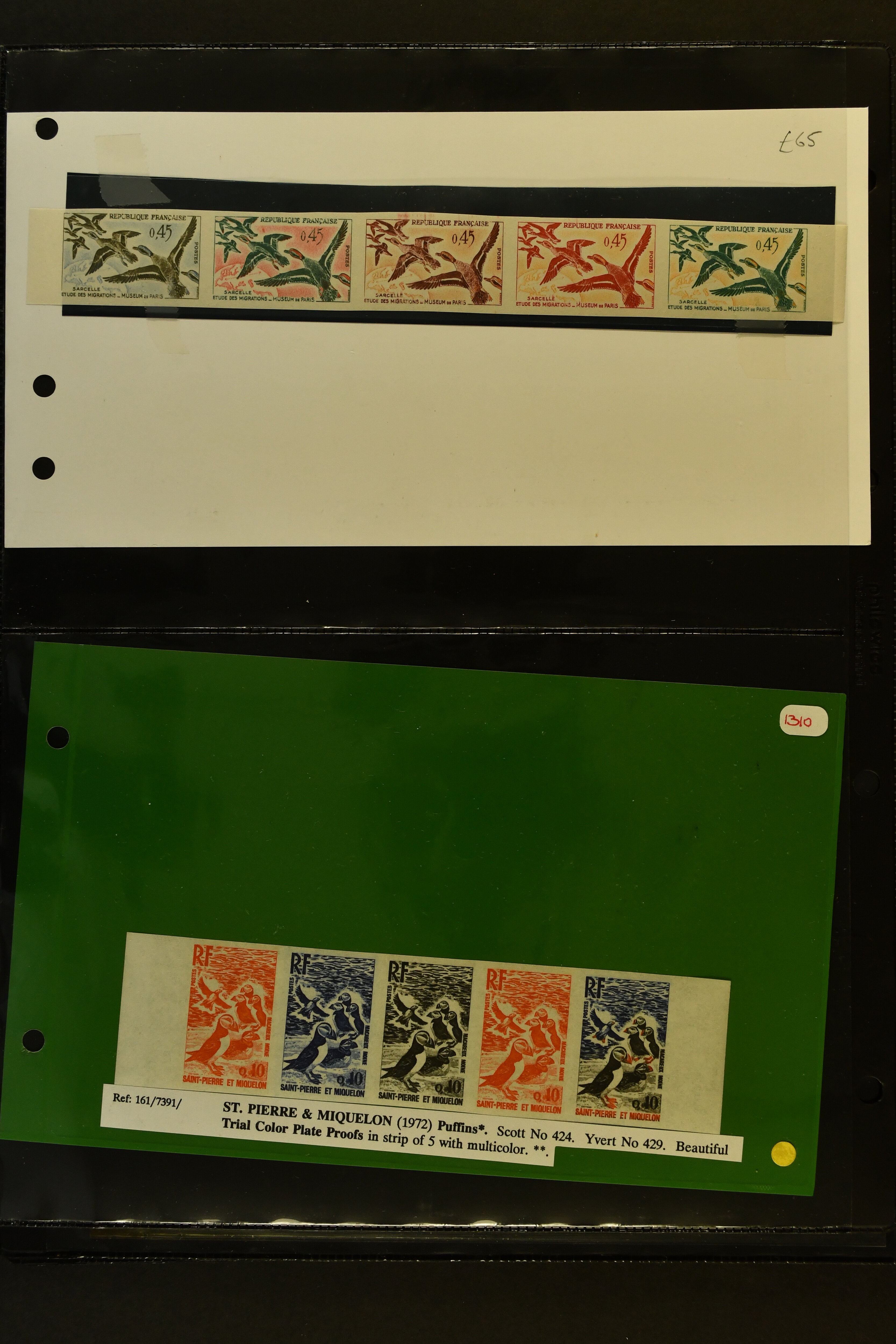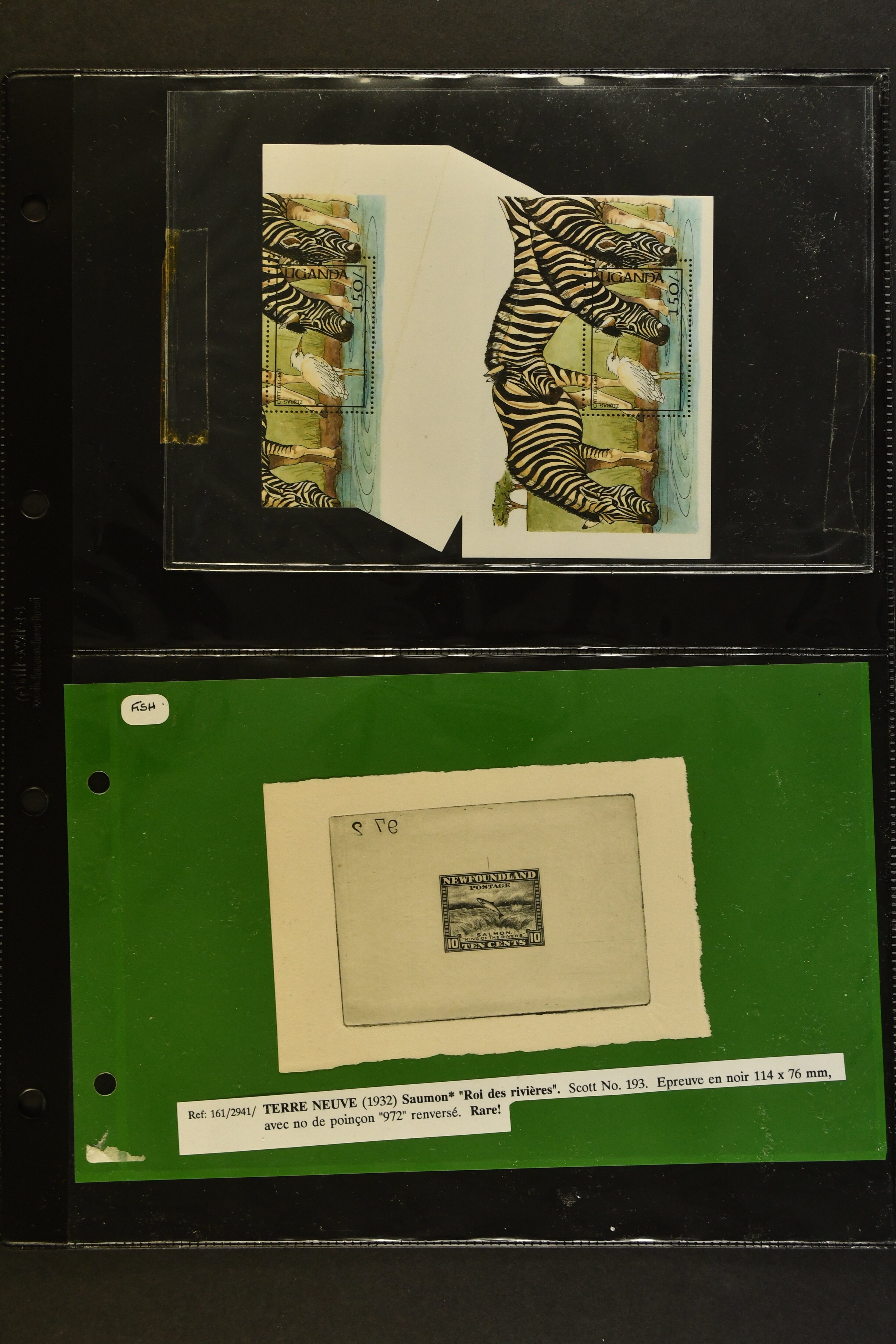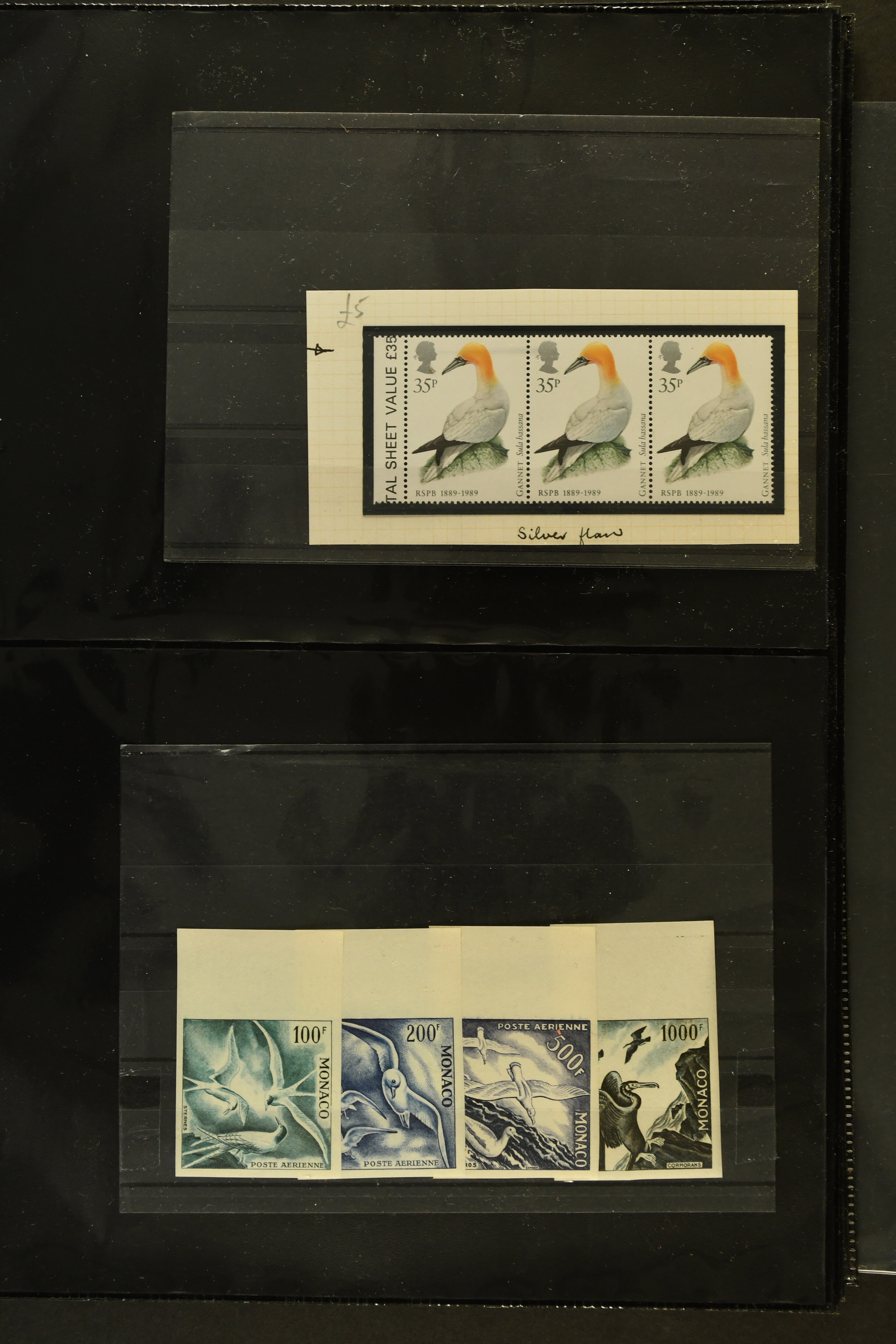 2757 imageTopical Selection Birds from Sweet and Salt Water, a special group of 16 primarily unused adhesives / multiples with varieties and proofs incl. UK 1988 Bewick's Swan in imperf. pair, UK 1989 Gannet with Silver flaw, Monaco 1955 Sea Birds, compl. set of four imperf., Pollution des Eaux de Mer Trial Colour proofs in a vertical strip of five, France 1960 Sarcelles / Teals in a strip of five colour proofs, St. Pierre et Miquelon Puffins Trial Colour plate proofs in a multicolour strip of five, Seabirds, three values 50 c., 1 f. and 2 f. in colours proofs and 2 f. as epreuve de luxe, Affars & Issas 1967 Sea Birds 10 f., 15 f. and 50 f. Trial Colour plate proofs in a multicolour strip of five, and two epreuves, one signed by the designer, two adhesives from New Zealand and Singapore with variety missing colour, Mauretania two multicolour proofs, one Audubon anniversary proof from Benin, a misfolded pair of miniature sheets from Uganda showing zebras and Cattle Egret; and finally Newfoundland, a sunk die proof depicting a Salmon - King of the Rivers (the describer knows that this is not a bird). (Image 1) (Image 2) (Image 3) (Image 4) (Image 5) (Image 6) (Image 7) (Image 8)