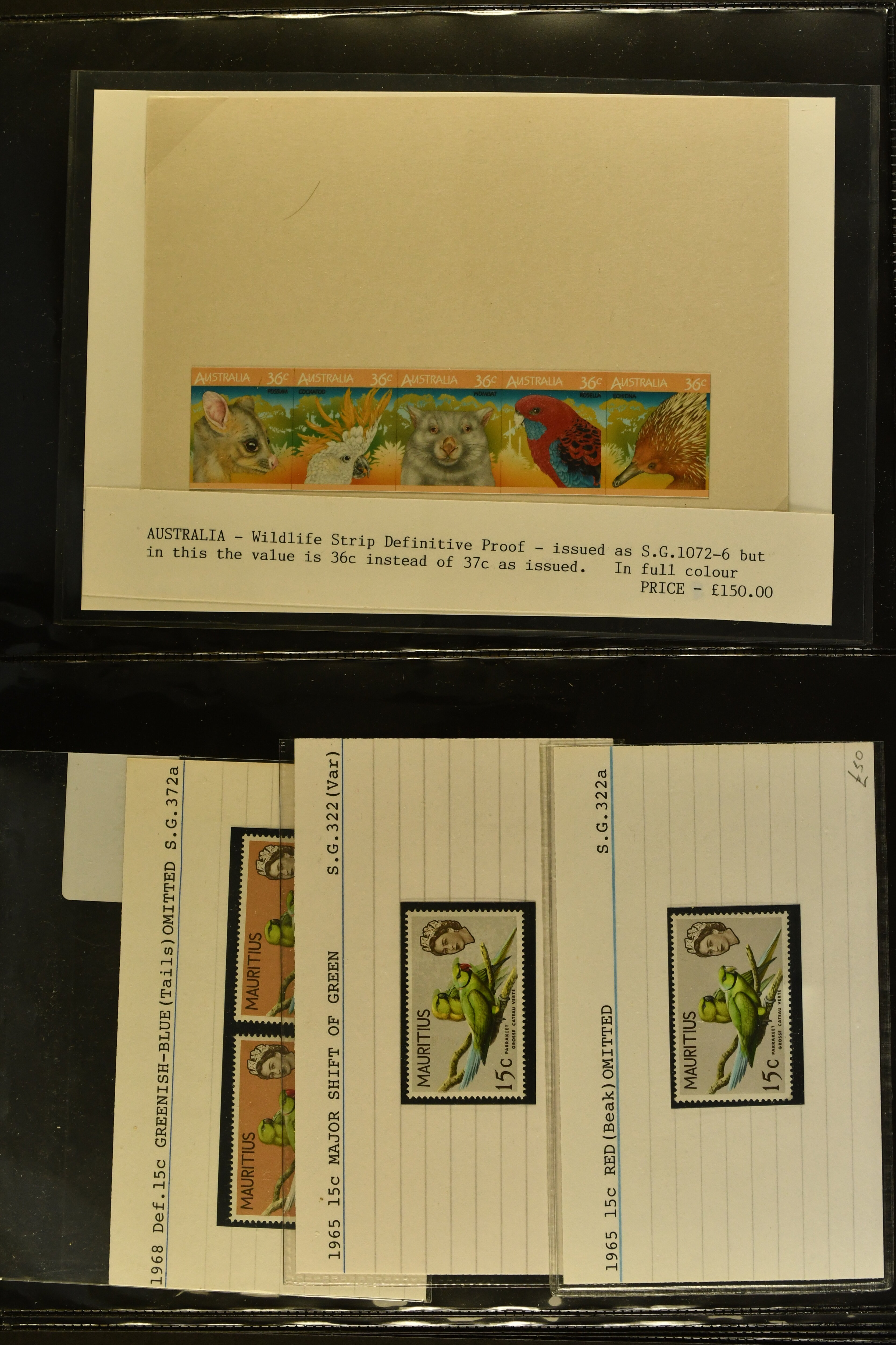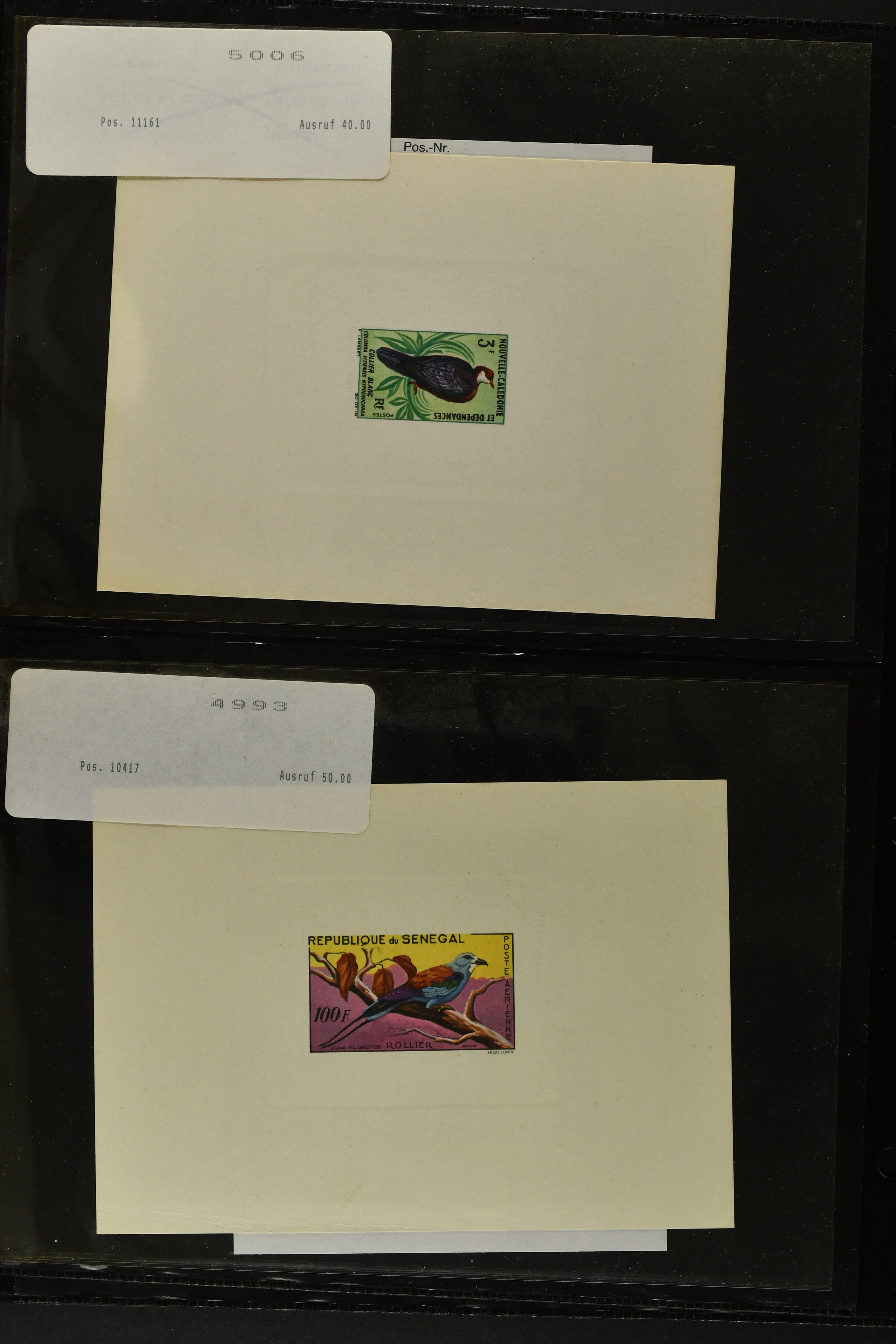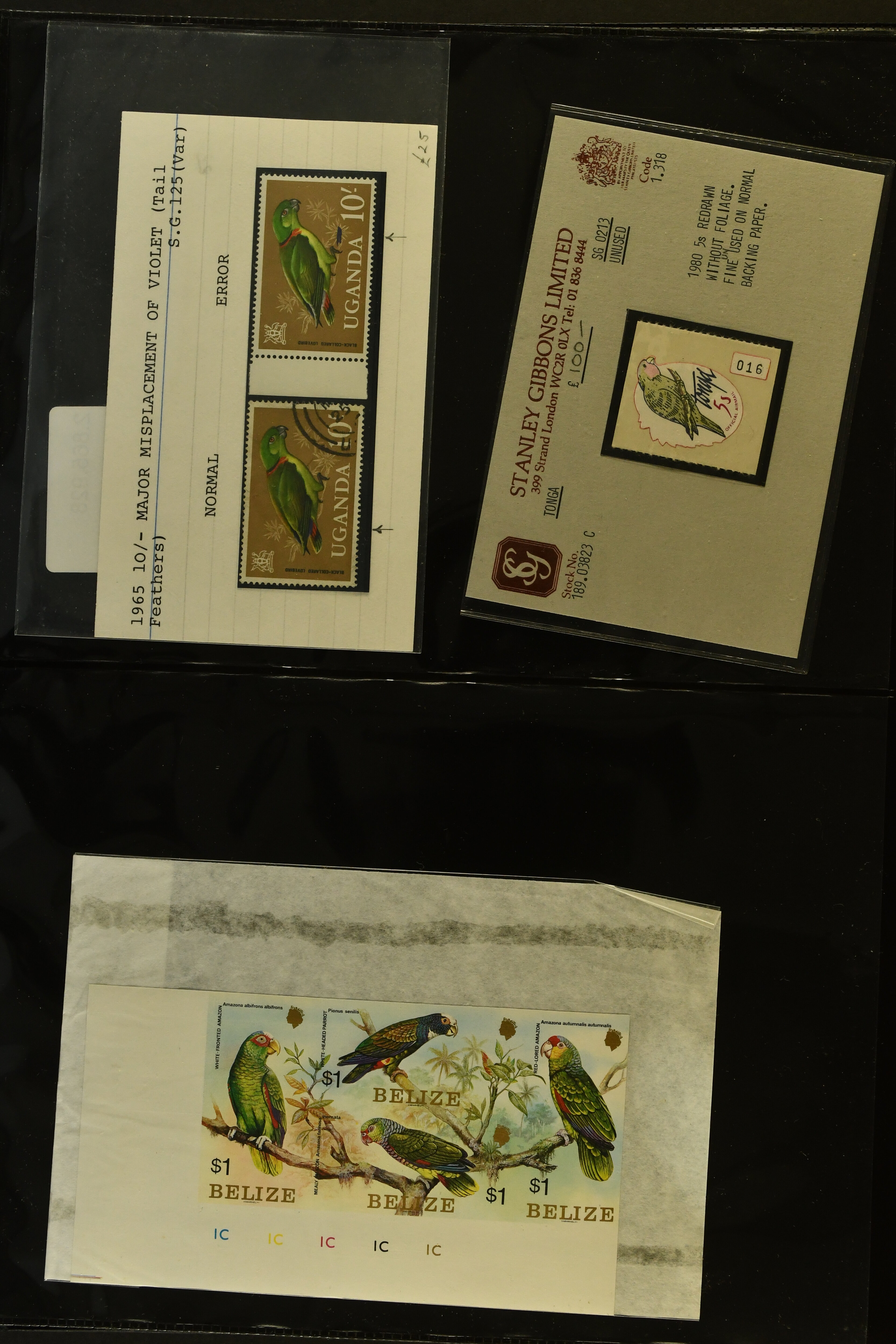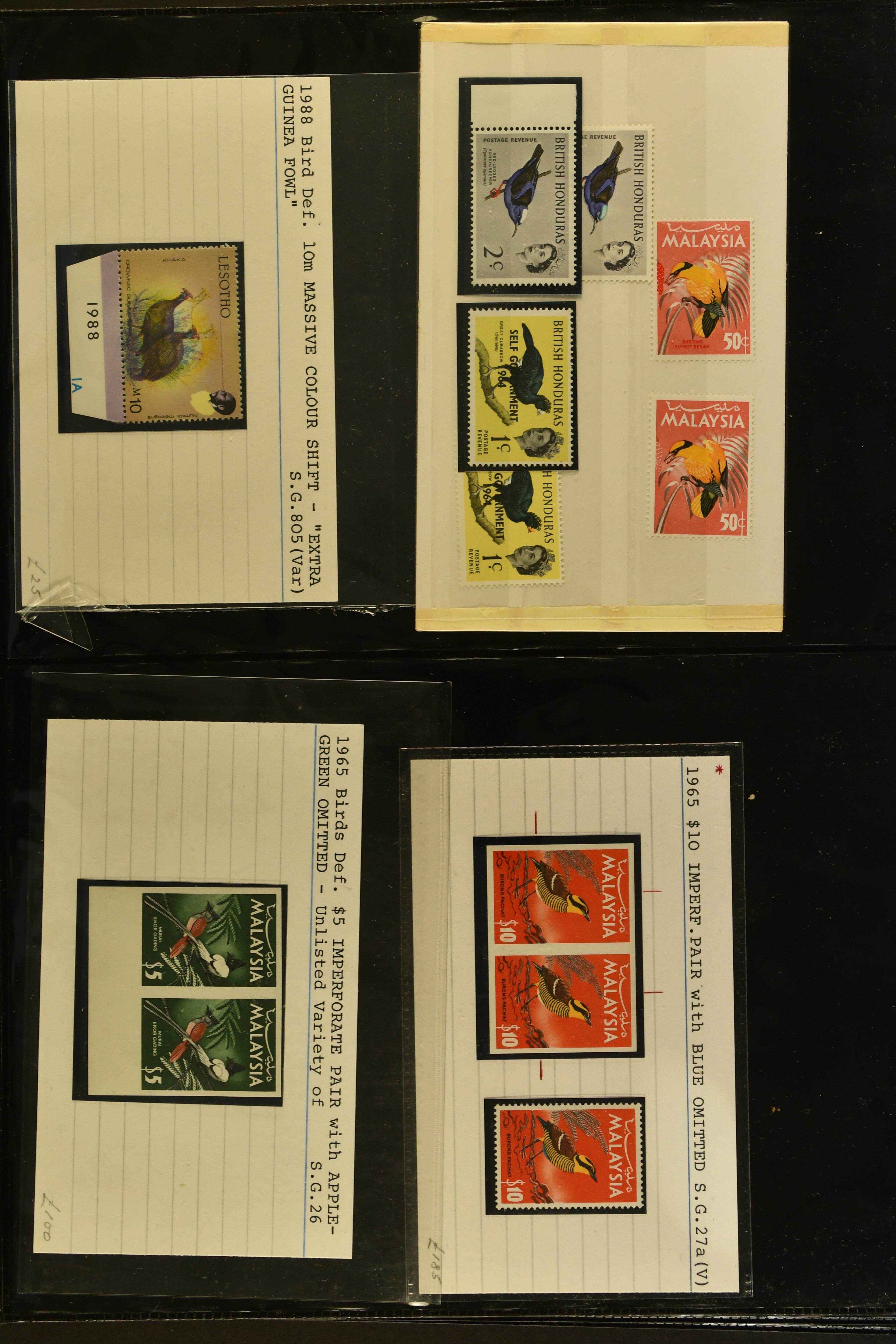 2759 imageTopical Selection Exotic Birds, a special group of 42 primarily unused adhesives / multiples with varieties and proofs incl. Parrots USA 1931 cover with fancy cancel of PARROTT Ohio to Cumberland, Mauritius 1965 with Red and Blue omitted or shift of green colour, Uganda 1965 shift of violet colour, Belize miniature sheet imperf., New Zealand 1898 imperf. proof pair, Tonga 1980 redrawn without foliage, then USA 1988 Faisan vertical pair imperf in between, Mauritius 1965 Pink omitted, Lesotho 1988 Guinea Fowl colour shift, Malaysia 1965 50 c. yellow omitted, $5 apple-green omitted in imperf pair, $10 blue omitted in imperf pair, Kenya-Uganda 1952 Frame only proof, India Heron 1975 perforation shift, Trinidad & Tobago 1969 Queen's Head misplaced, additional eight Commonwealth varieties with omitted colours or misplaced printing, Australia 1987 Wildlife Strip Definitive Proof with 36 c. value tablet instead of 37 c. as issued, also 15 epreuves from different French colonies. An attractive and interesting lot to be studied. (Image 1) (Image 2) (Image 3) (Image 4) (Image 5) (Image 6) (Image 7) (Image 8) (Image 9) (Image 10) (Image 11) (Image 12) (Image 13) (Image 14) (Image 15) (Image 16) (Image 17)