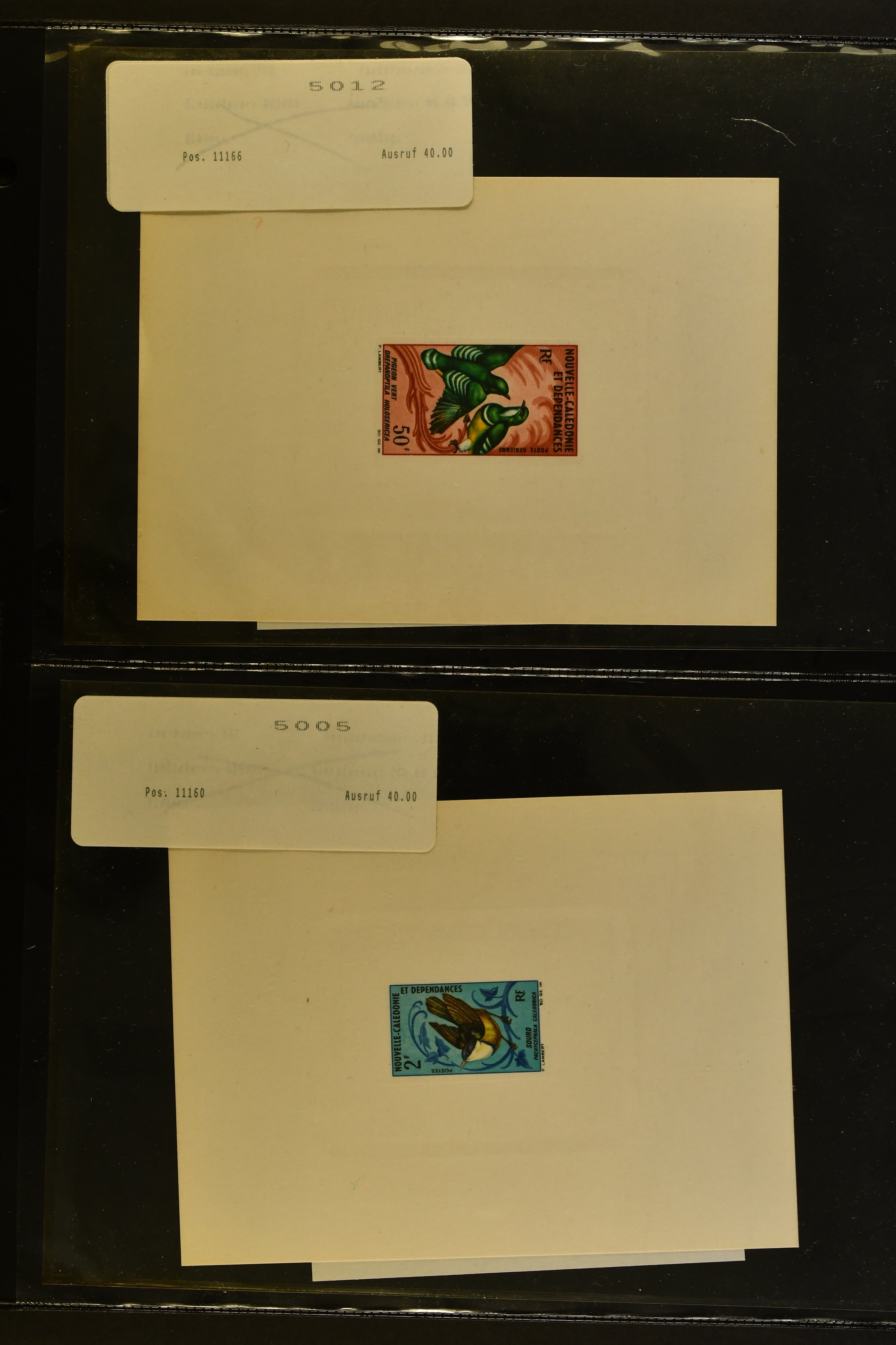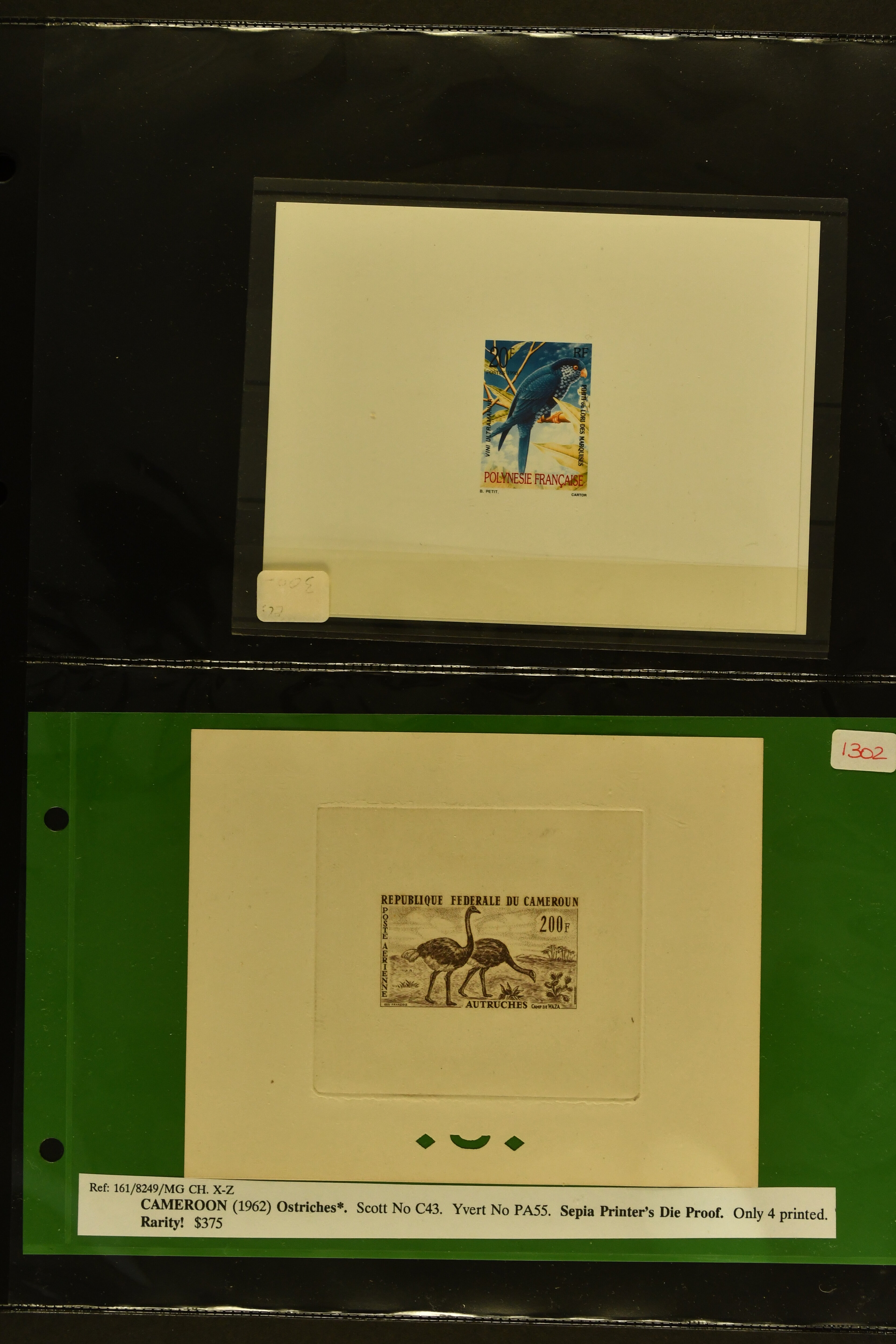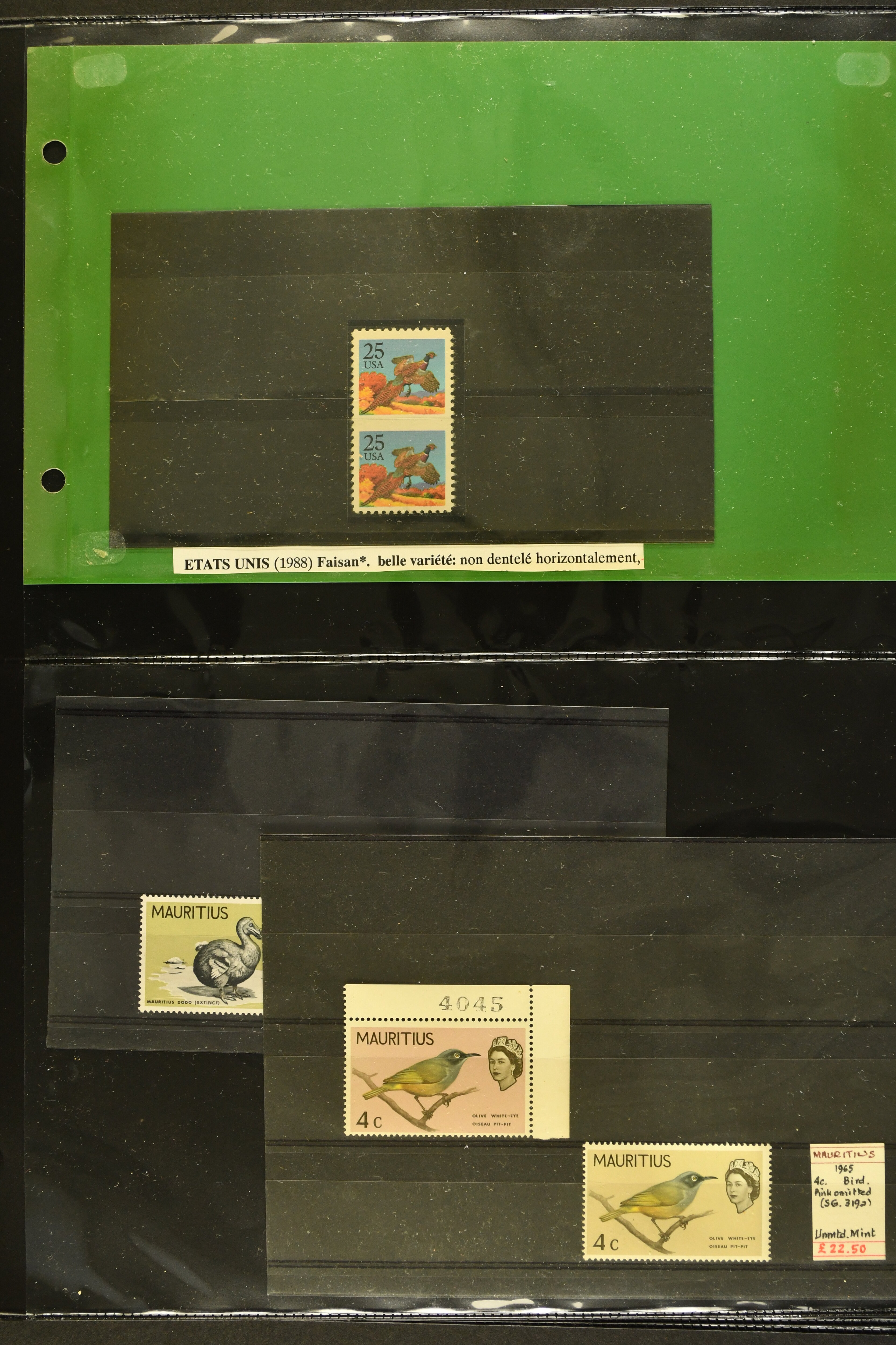 2759 imageTopical Selection Exotic Birds, a special group of 42 primarily unused adhesives / multiples with varieties and proofs incl. Parrots USA 1931 cover with fancy cancel of PARROTT Ohio to Cumberland, Mauritius 1965 with Red and Blue omitted or shift of green colour, Uganda 1965 shift of violet colour, Belize miniature sheet imperf., New Zealand 1898 imperf. proof pair, Tonga 1980 redrawn without foliage, then USA 1988 Faisan vertical pair imperf in between, Mauritius 1965 Pink omitted, Lesotho 1988 Guinea Fowl colour shift, Malaysia 1965 50 c. yellow omitted, $5 apple-green omitted in imperf pair, $10 blue omitted in imperf pair, Kenya-Uganda 1952 Frame only proof, India Heron 1975 perforation shift, Trinidad & Tobago 1969 Queen's Head misplaced, additional eight Commonwealth varieties with omitted colours or misplaced printing, Australia 1987 Wildlife Strip Definitive Proof with 36 c. value tablet instead of 37 c. as issued, also 15 epreuves from different French colonies. An attractive and interesting lot to be studied. (Image 1) (Image 2) (Image 3) (Image 4) (Image 5) (Image 6) (Image 7) (Image 8) (Image 9) (Image 10) (Image 11) (Image 12) (Image 13) (Image 14) (Image 15) (Image 16) (Image 17)