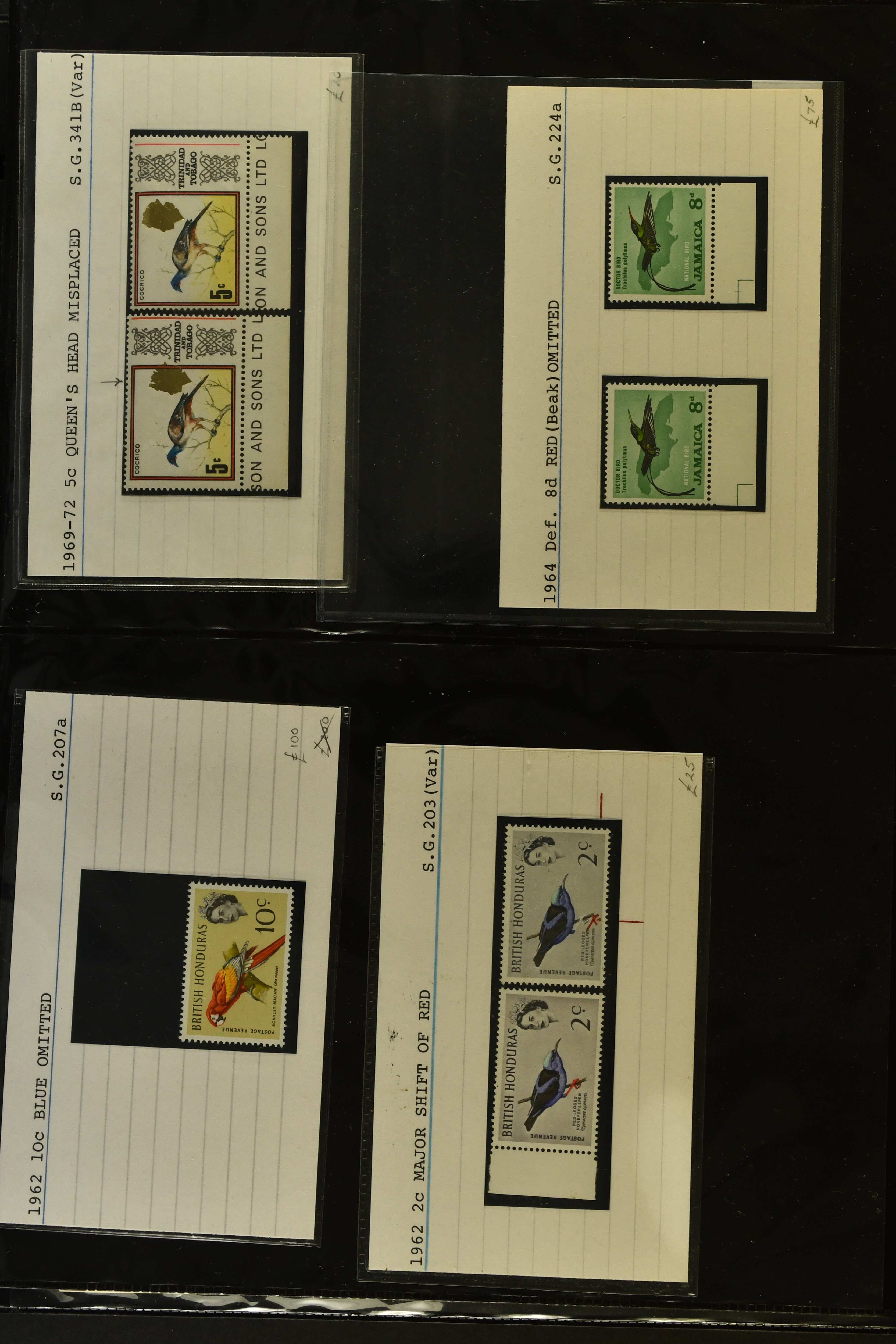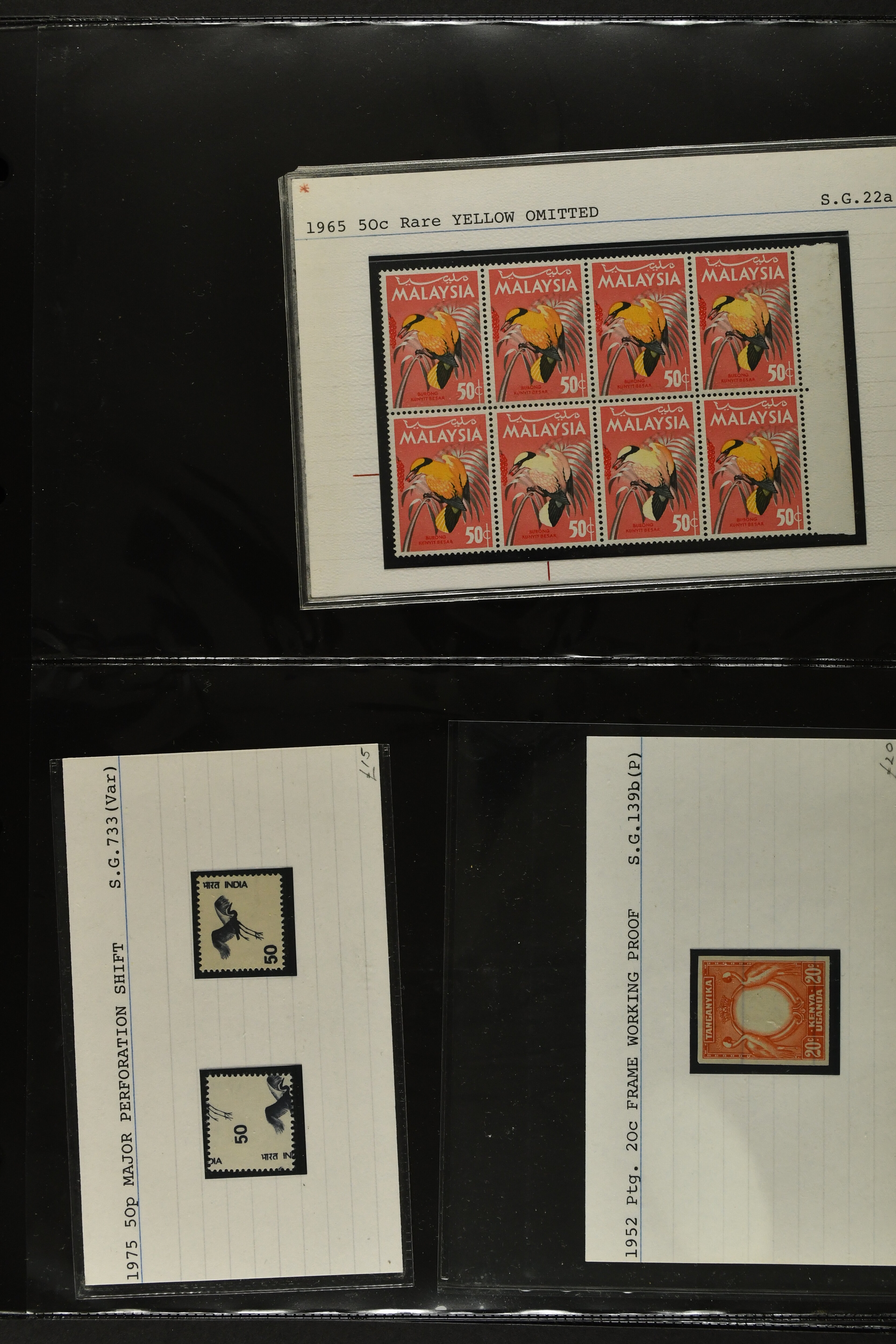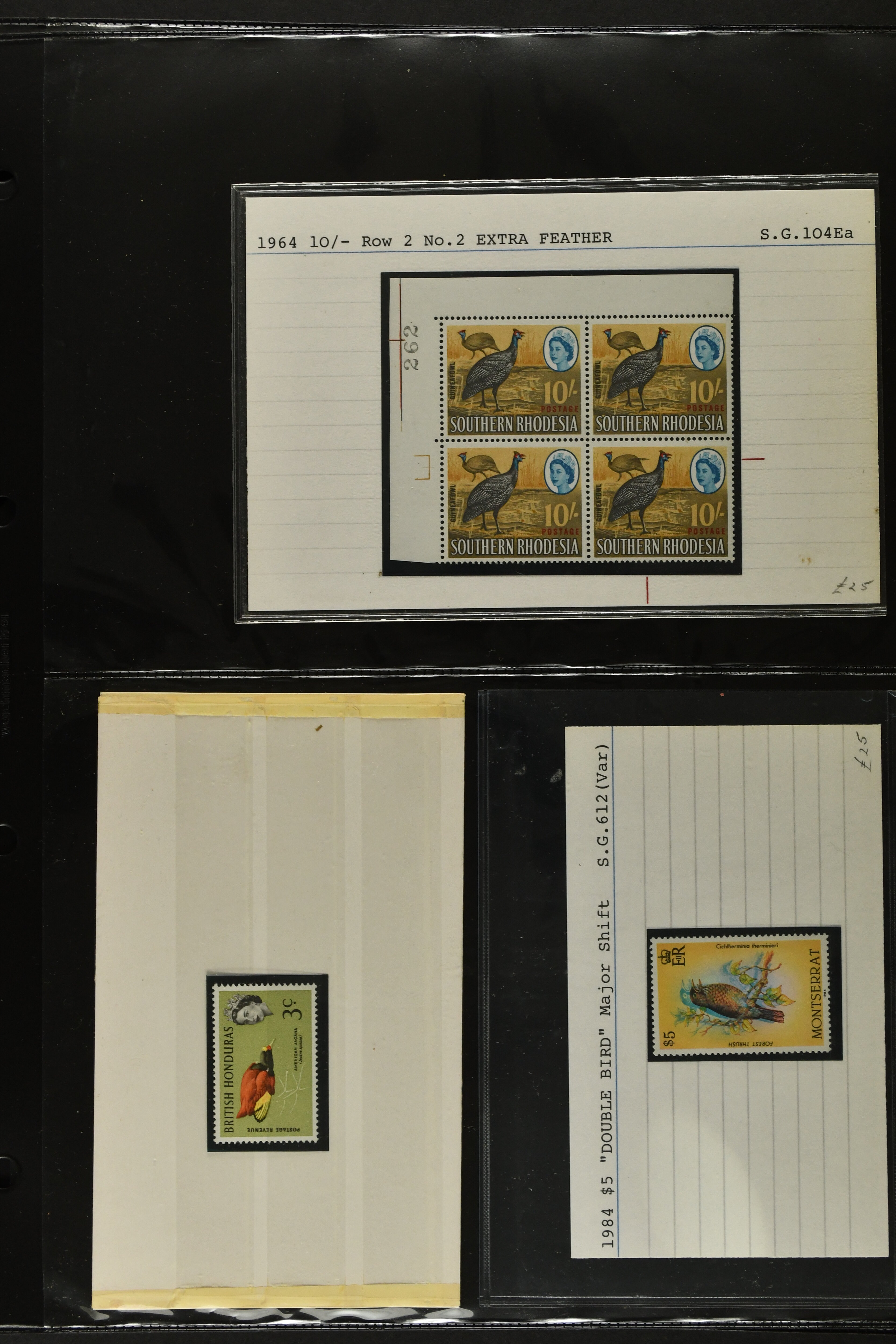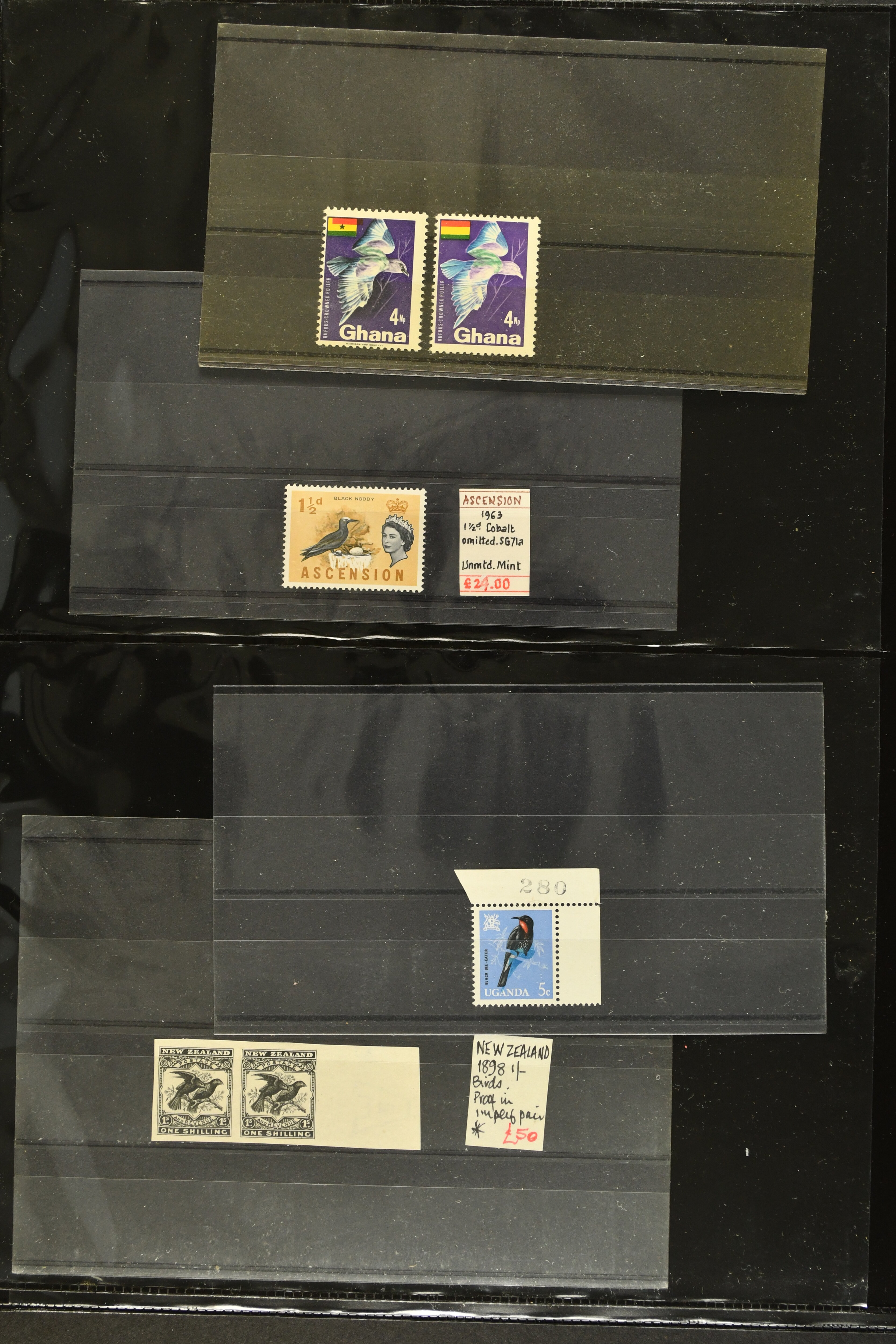 2759 imageTopical Selection Exotic Birds, a special group of 42 primarily unused adhesives / multiples with varieties and proofs incl. Parrots USA 1931 cover with fancy cancel of PARROTT Ohio to Cumberland, Mauritius 1965 with Red and Blue omitted or shift of green colour, Uganda 1965 shift of violet colour, Belize miniature sheet imperf., New Zealand 1898 imperf. proof pair, Tonga 1980 redrawn without foliage, then USA 1988 Faisan vertical pair imperf in between, Mauritius 1965 Pink omitted, Lesotho 1988 Guinea Fowl colour shift, Malaysia 1965 50 c. yellow omitted, $5 apple-green omitted in imperf pair, $10 blue omitted in imperf pair, Kenya-Uganda 1952 Frame only proof, India Heron 1975 perforation shift, Trinidad & Tobago 1969 Queen's Head misplaced, additional eight Commonwealth varieties with omitted colours or misplaced printing, Australia 1987 Wildlife Strip Definitive Proof with 36 c. value tablet instead of 37 c. as issued, also 15 epreuves from different French colonies. An attractive and interesting lot to be studied. (Image 1) (Image 2) (Image 3) (Image 4) (Image 5) (Image 6) (Image 7) (Image 8) (Image 9) (Image 10) (Image 11) (Image 12) (Image 13) (Image 14) (Image 15) (Image 16) (Image 17)