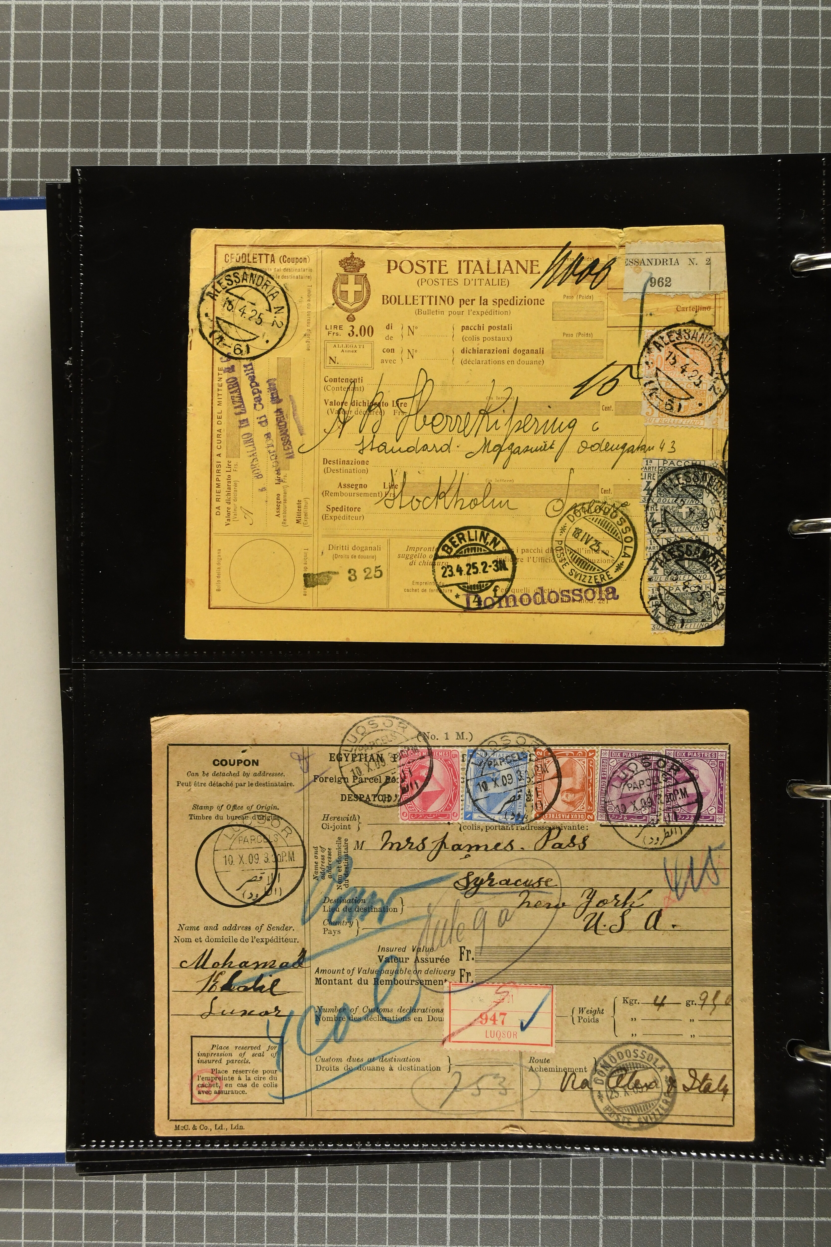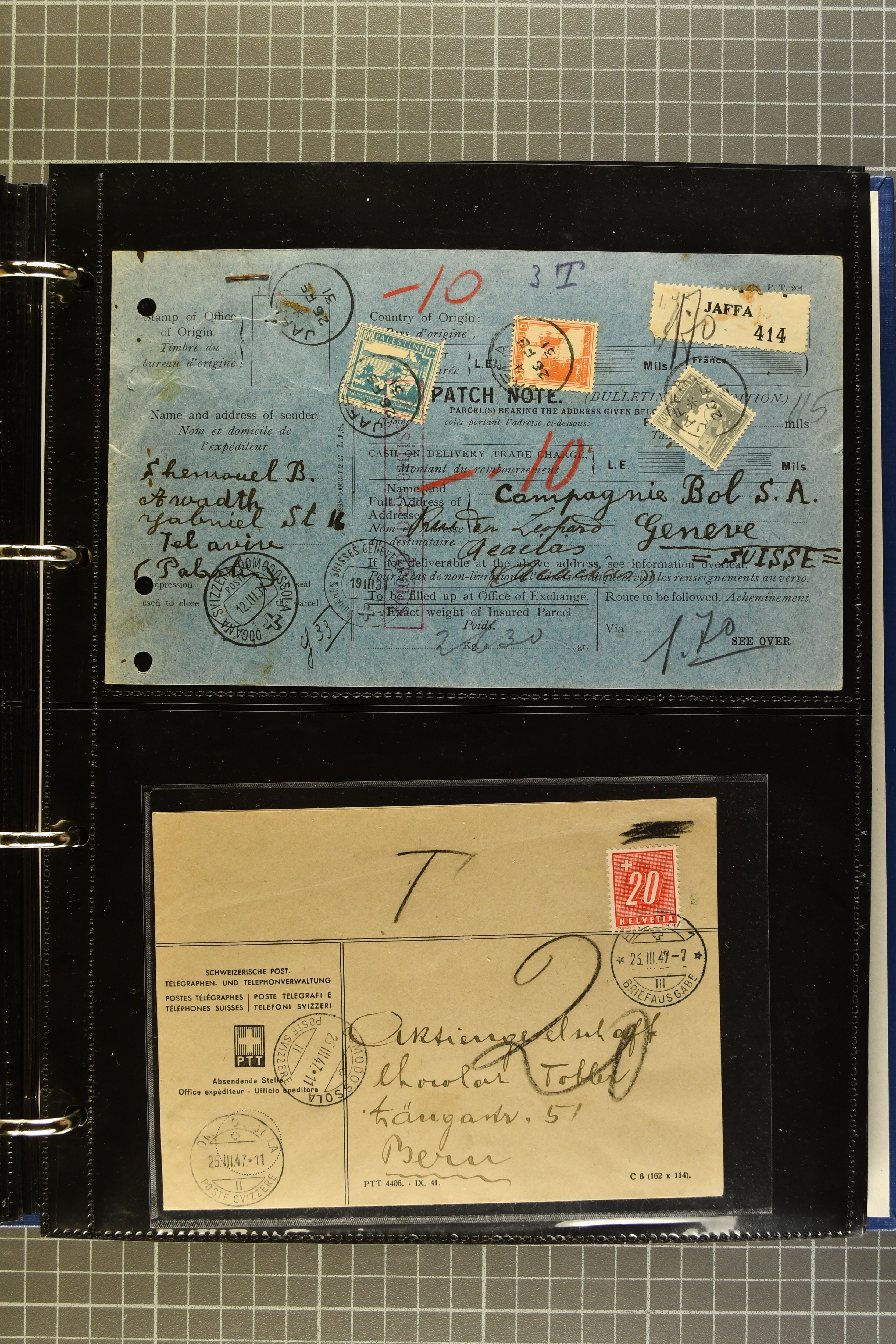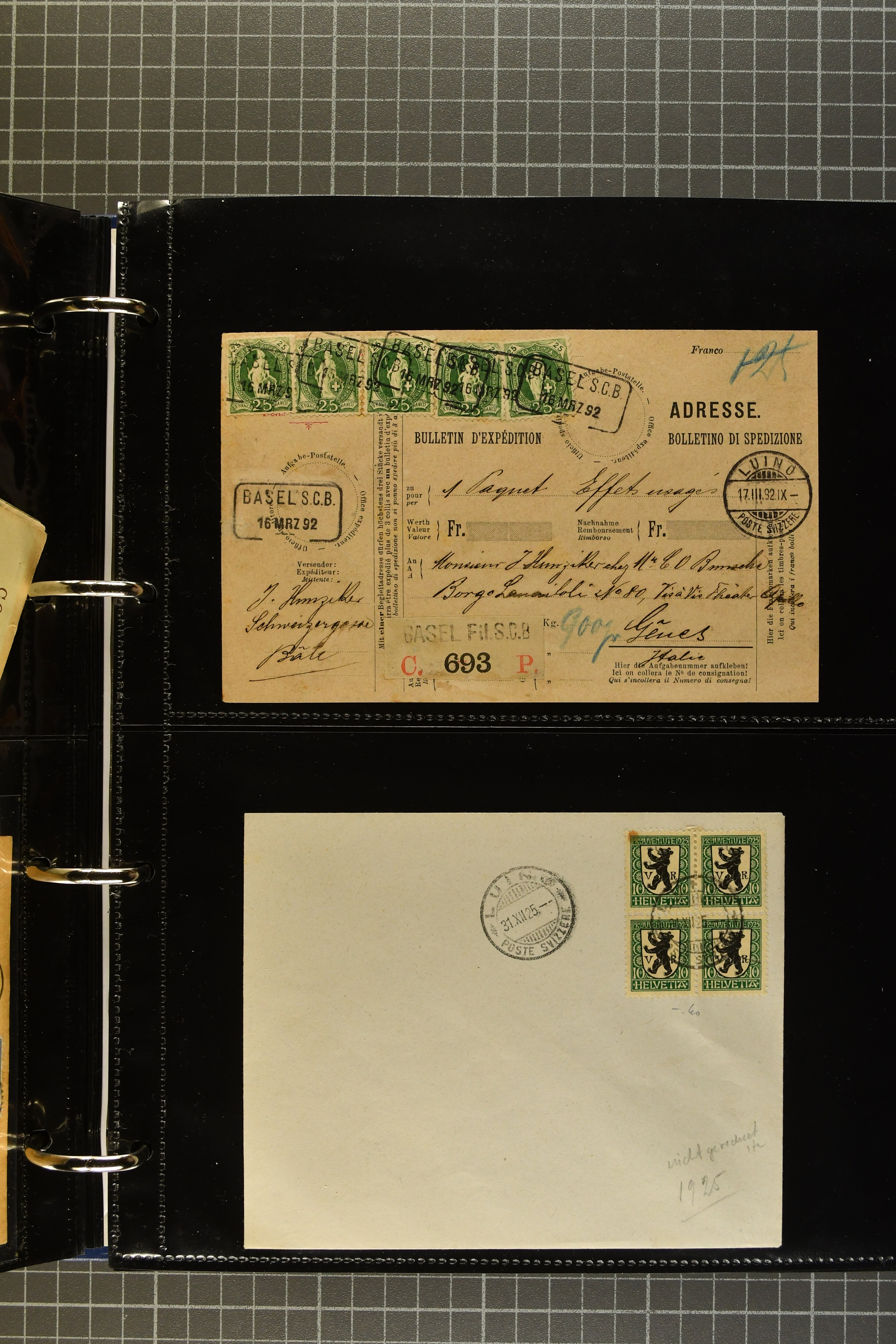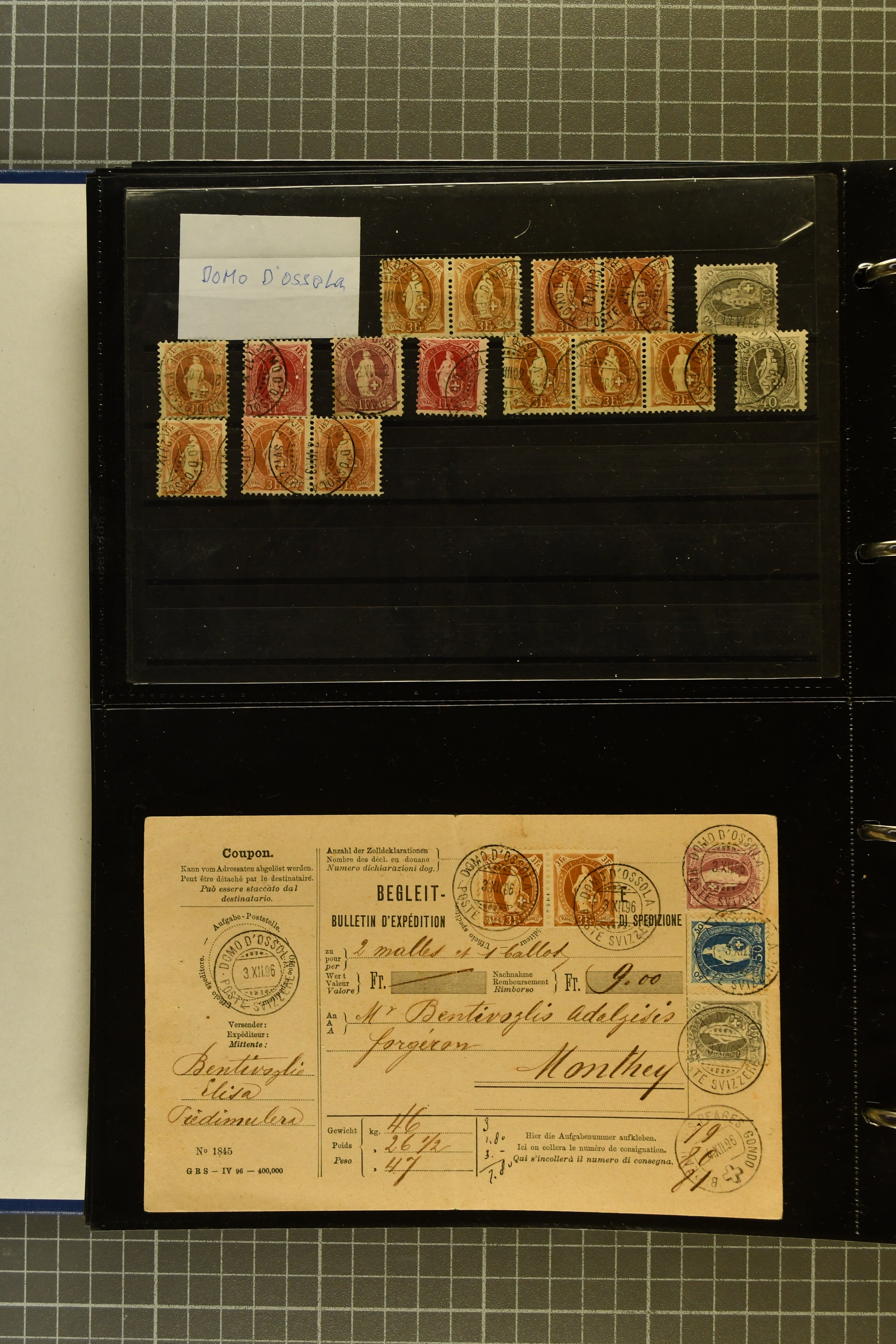 9644 image1880/1947ca.: Sammlungsbestand Schweizer Postagenturen im Ausland mit Belegen und losen Marken, sauber nach Agenturen geordnet in einem Briefalbum. Dabei einige sehr schönen Frankaturen der Stehenden Helvetia auf Paketkarten. Anschliessend Paketkarten mit der Sitzenden Helvetia mit Schwert sowie den Tellausgaben, darunter eine Karte mit Mischfrankatur Stehende Helvetia mit Sitzender Helvetia mit Schwert. Viele lose Marken auf Steckkarten, überwiegend Stehende Helvetia, zudem etwas Nachporto und Ziffernausgaben. Drei Paketkarten, 1 Italien, 1 Ägypten und 1 Palästine je durch schweizerisches Postamt in DOMODOSSOLA gelaufen, die beiden letzteren besonders prächtig. Weiterhin 19 Pro Juventute-Belege mit je einem Viererblock aus den Jahren 1925–1936, alle mit Stempel "LUINO POSTE SVIZZERE". Dazu das Buch von Ivo Bader: 'Schweizerische Postagenturen in Italien und Frankreich' sowie Landkarten und weitere Dokumentation. (Image 1) (Image 2) (Image 3) (Image 4) (Image 5) (Image 6) (Image 7) (Image 8) (Image 9) (Image 10) (Image 11) (Image 12) (Image 13) (Image 14) (Image 15) (Image 16) (Image 17) (Image 18) (Image 19) (Image 20) (Image 21) (Image 22) (Image 23) (Image 24) (Image 25) (Image 26) (Image 27) (Image 28) (Image 29) (Image 30) (Image 31) (Image 32) (Image 33) (Image 34) (Image 35) (Image 36) (Image 37)