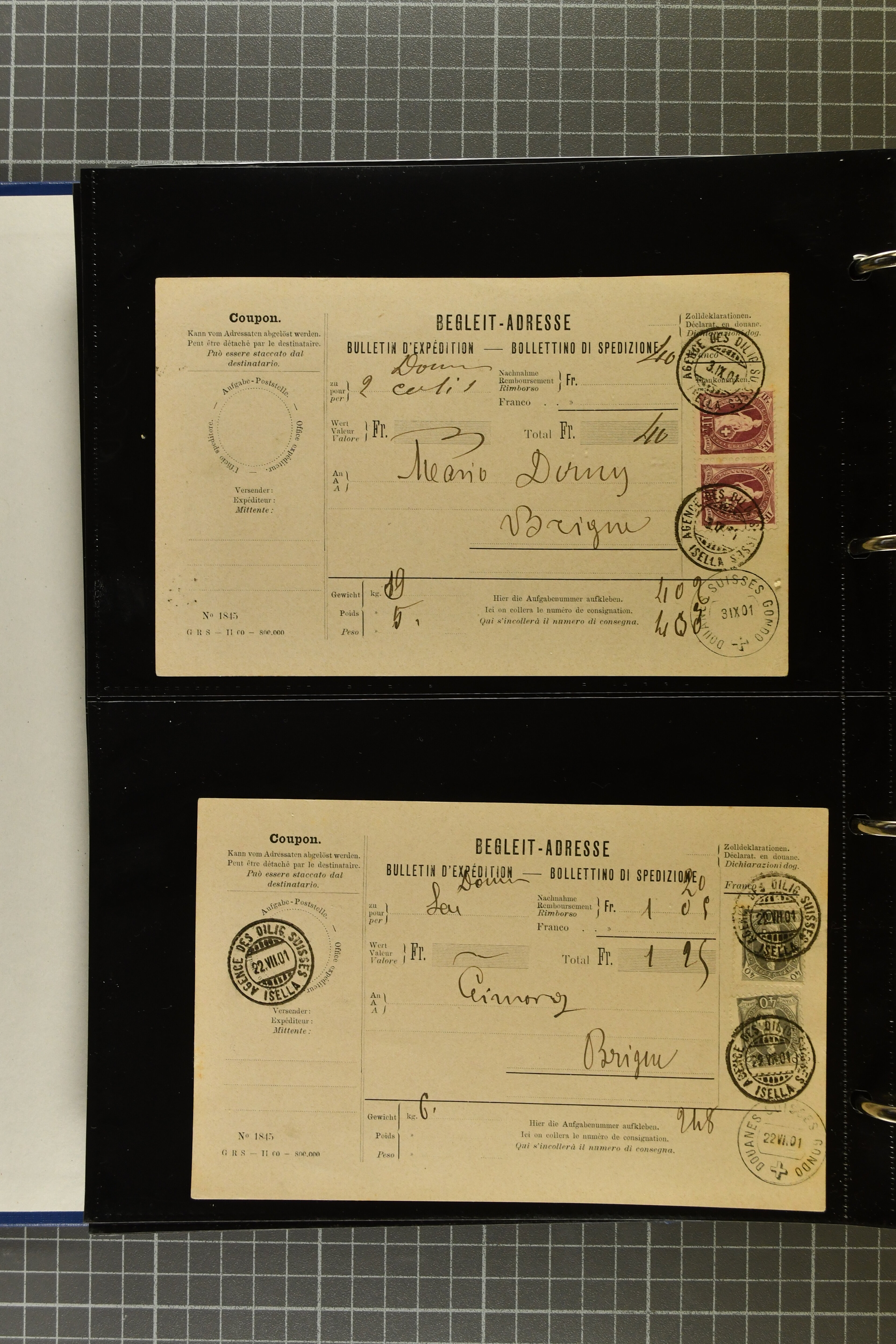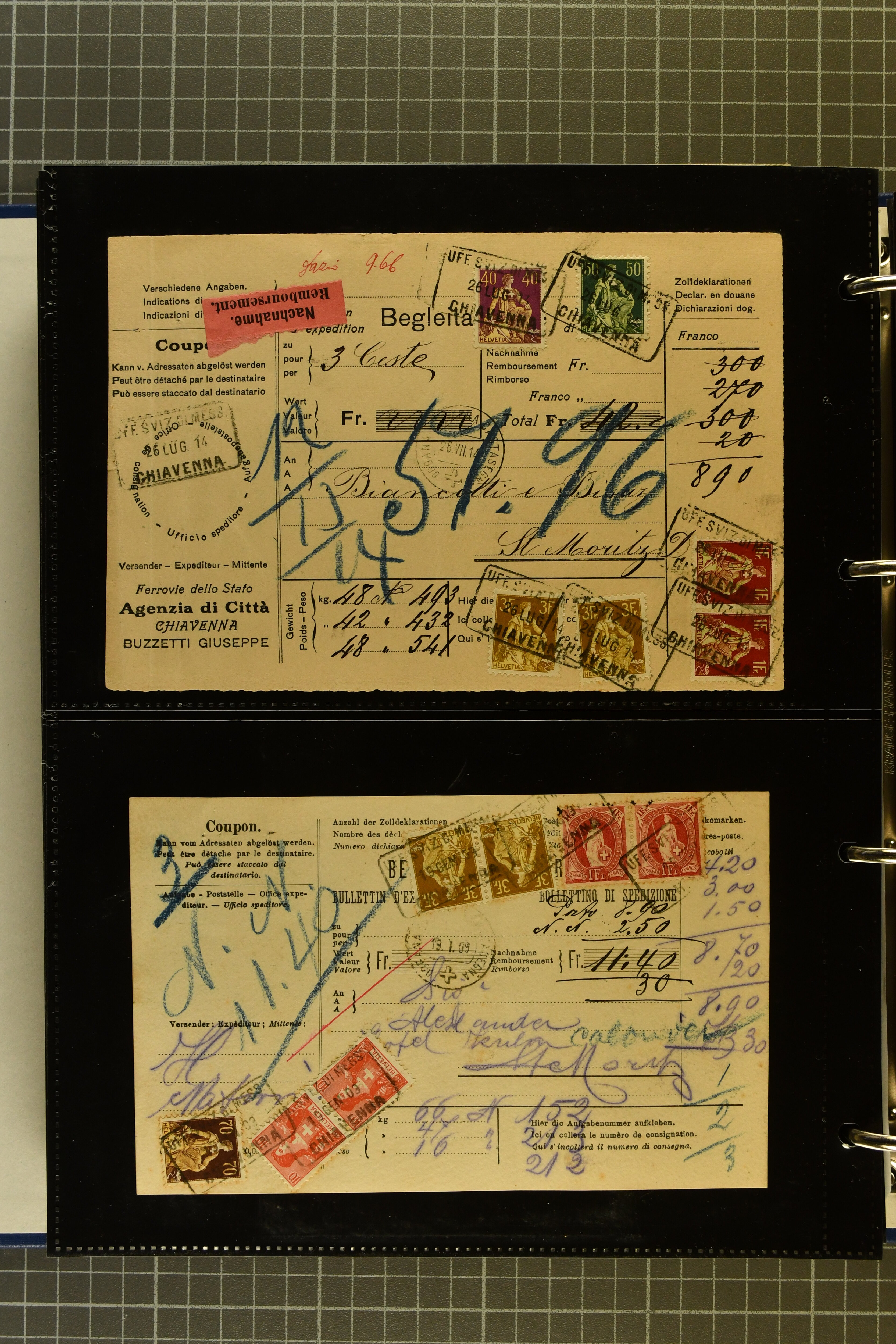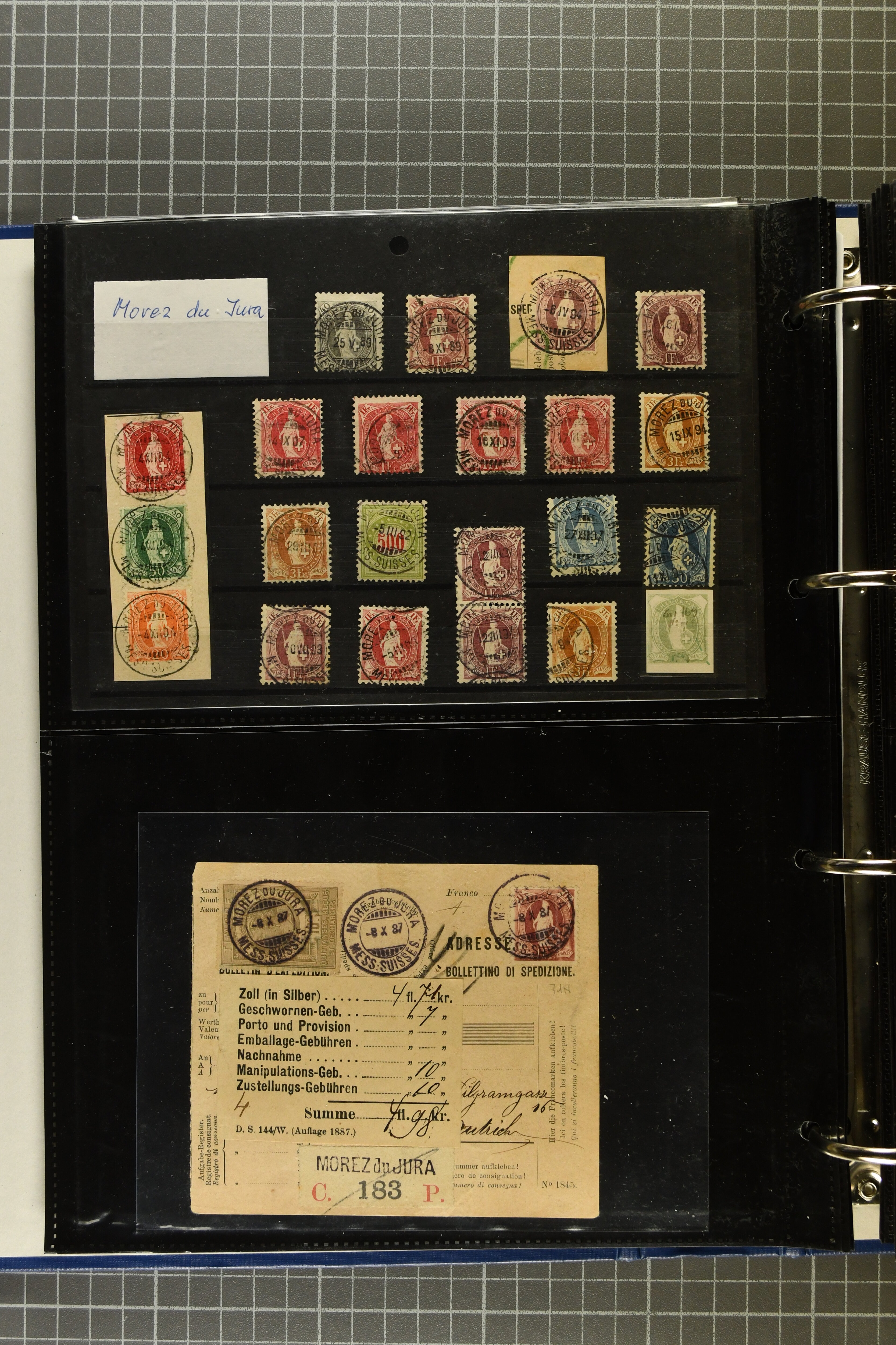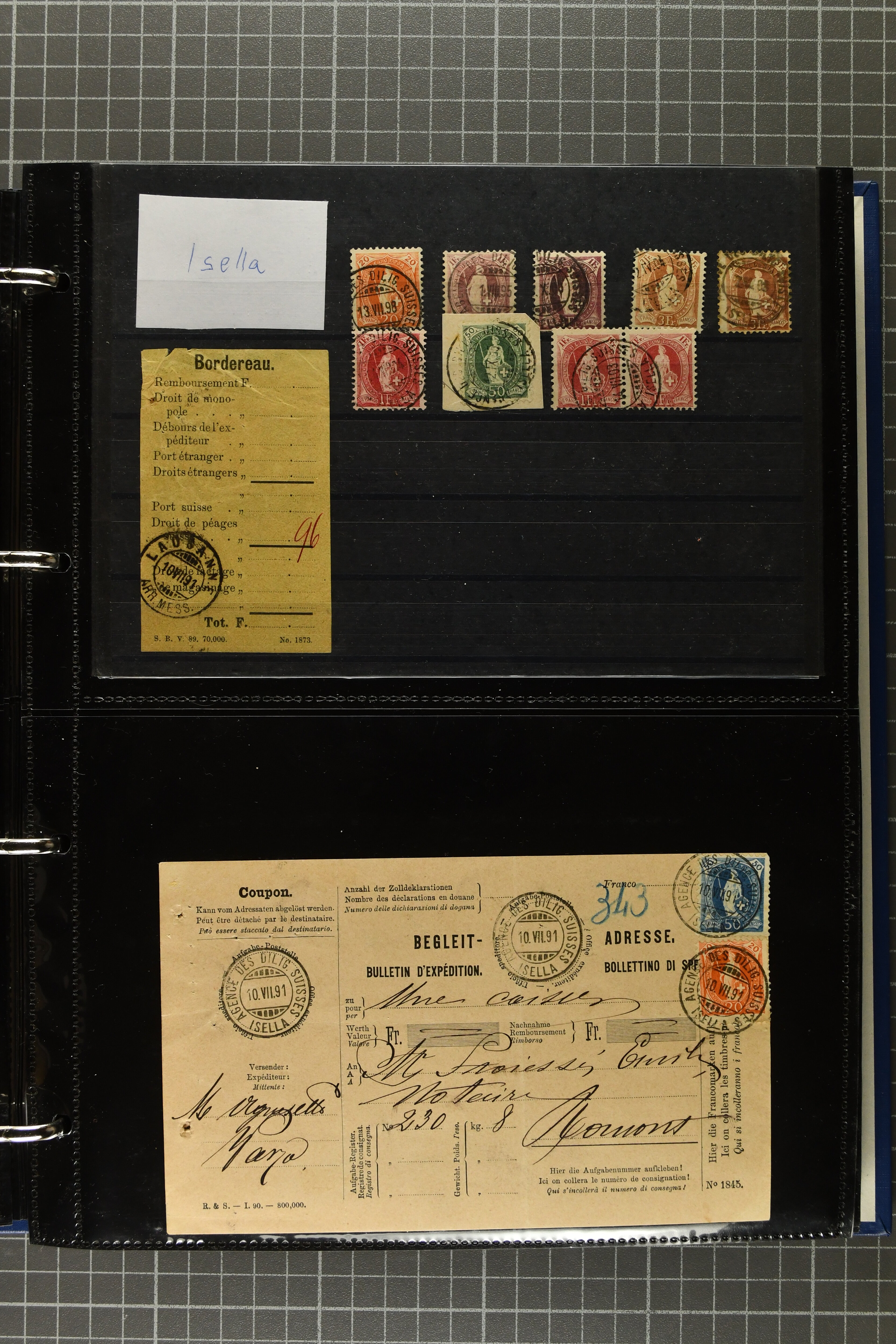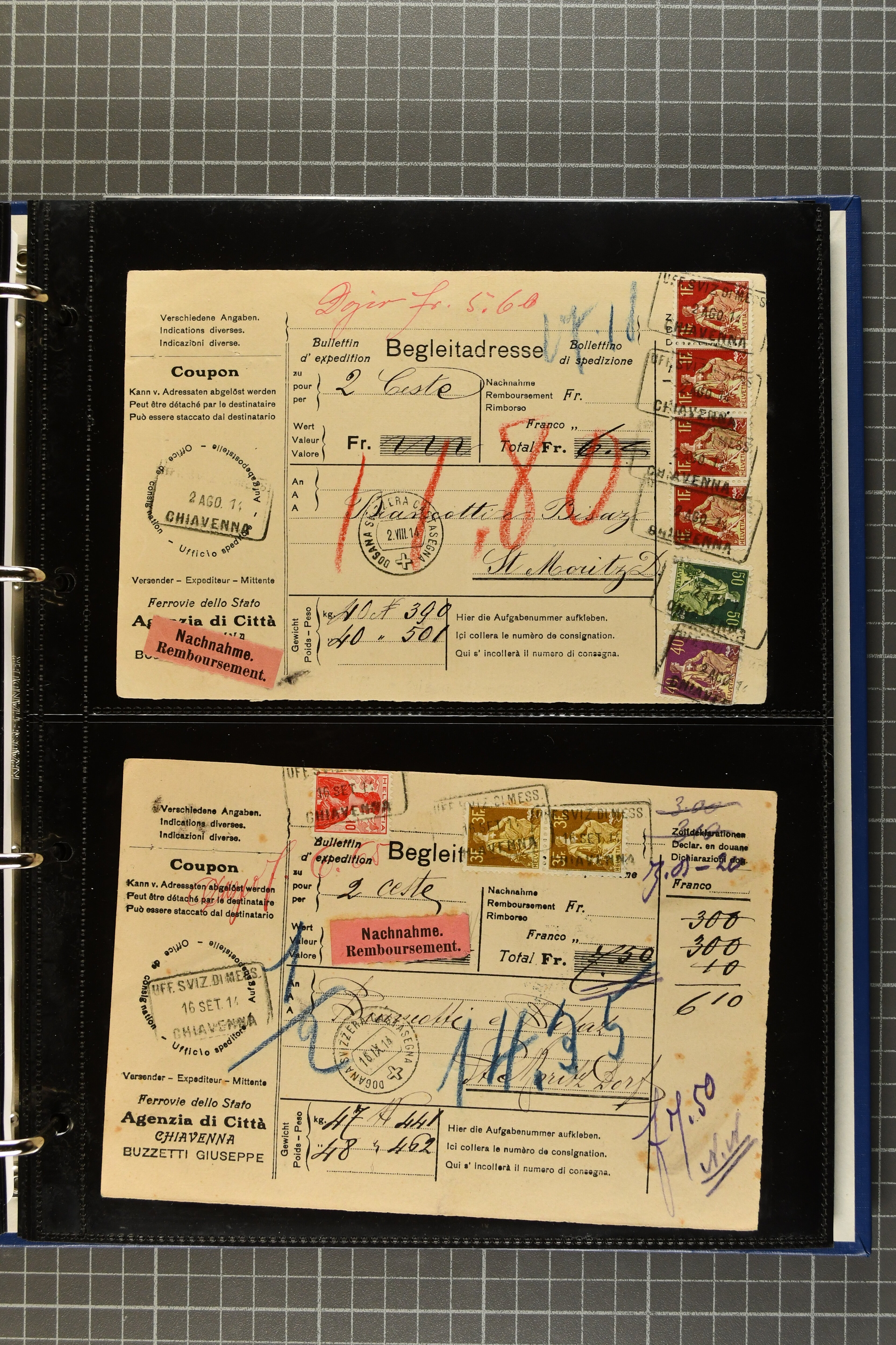 9644 image1880/1947ca.: Sammlungsbestand Schweizer Postagenturen im Ausland mit Belegen und losen Marken, sauber nach Agenturen geordnet in einem Briefalbum. Dabei einige sehr schönen Frankaturen der Stehenden Helvetia auf Paketkarten. Anschliessend Paketkarten mit der Sitzenden Helvetia mit Schwert sowie den Tellausgaben, darunter eine Karte mit Mischfrankatur Stehende Helvetia mit Sitzender Helvetia mit Schwert. Viele lose Marken auf Steckkarten, überwiegend Stehende Helvetia, zudem etwas Nachporto und Ziffernausgaben. Drei Paketkarten, 1 Italien, 1 Ägypten und 1 Palästine je durch schweizerisches Postamt in DOMODOSSOLA gelaufen, die beiden letzteren besonders prächtig. Weiterhin 19 Pro Juventute-Belege mit je einem Viererblock aus den Jahren 1925–1936, alle mit Stempel "LUINO POSTE SVIZZERE". Dazu das Buch von Ivo Bader: 'Schweizerische Postagenturen in Italien und Frankreich' sowie Landkarten und weitere Dokumentation. (Image 1) (Image 2) (Image 3) (Image 4) (Image 5) (Image 6) (Image 7) (Image 8) (Image 9) (Image 10) (Image 11) (Image 12) (Image 13) (Image 14) (Image 15) (Image 16) (Image 17) (Image 18) (Image 19) (Image 20) (Image 21) (Image 22) (Image 23) (Image 24) (Image 25) (Image 26) (Image 27) (Image 28) (Image 29) (Image 30) (Image 31) (Image 32) (Image 33) (Image 34) (Image 35) (Image 36) (Image 37)