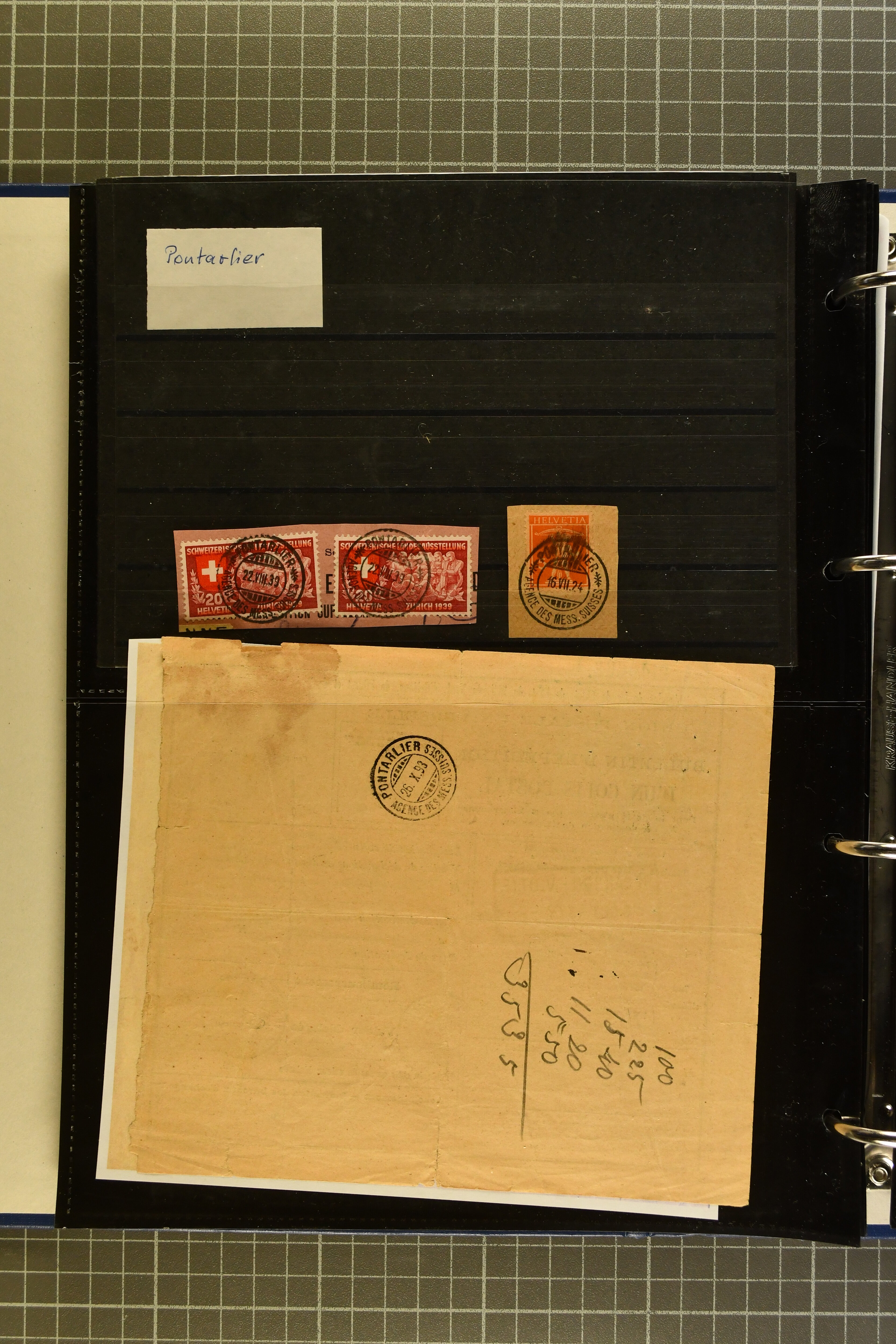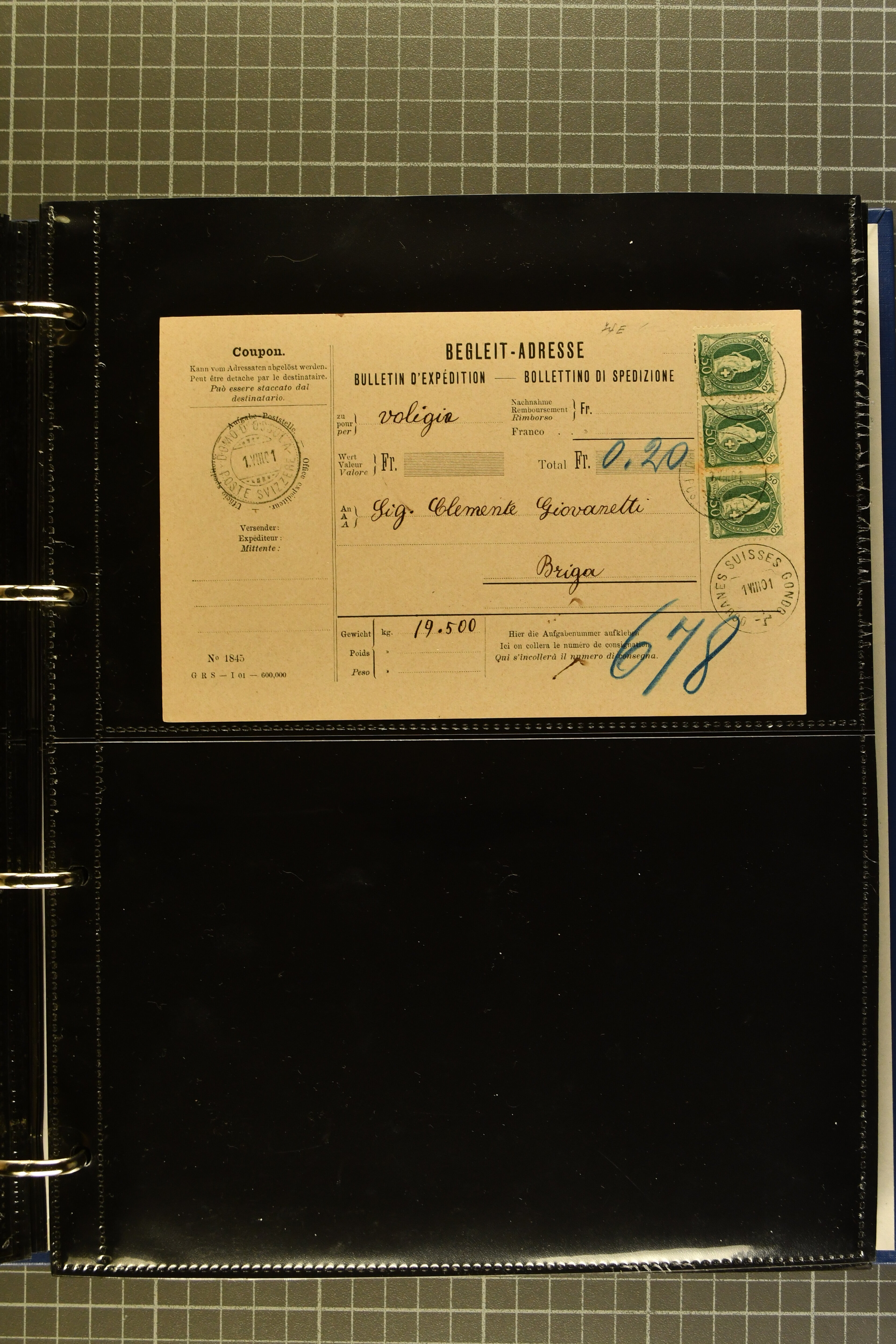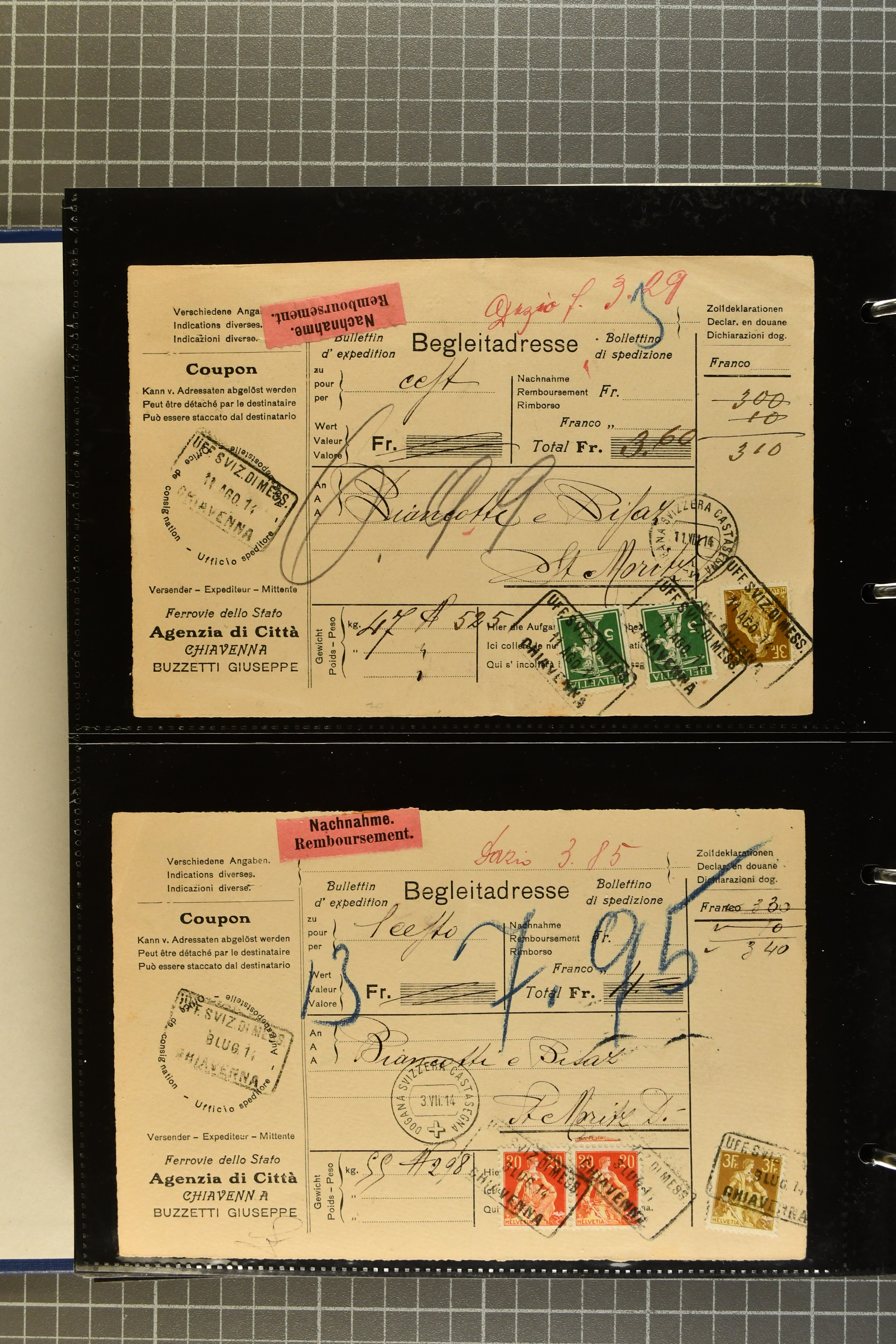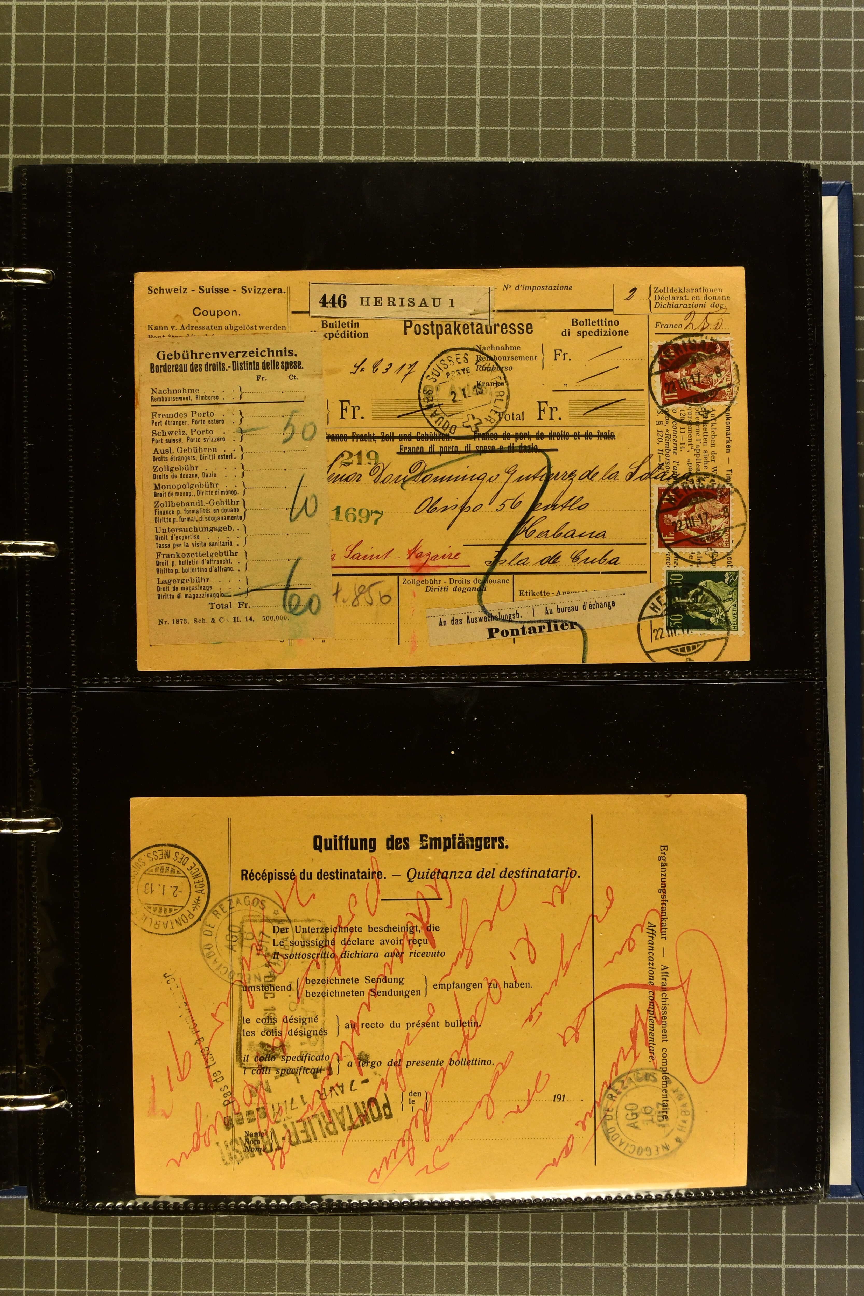 9644 image1880/1947ca.: Sammlungsbestand Schweizer Postagenturen im Ausland mit Belegen und losen Marken, sauber nach Agenturen geordnet in einem Briefalbum. Dabei einige sehr schönen Frankaturen der Stehenden Helvetia auf Paketkarten. Anschliessend Paketkarten mit der Sitzenden Helvetia mit Schwert sowie den Tellausgaben, darunter eine Karte mit Mischfrankatur Stehende Helvetia mit Sitzender Helvetia mit Schwert. Viele lose Marken auf Steckkarten, überwiegend Stehende Helvetia, zudem etwas Nachporto und Ziffernausgaben. Drei Paketkarten, 1 Italien, 1 Ägypten und 1 Palästine je durch schweizerisches Postamt in DOMODOSSOLA gelaufen, die beiden letzteren besonders prächtig. Weiterhin 19 Pro Juventute-Belege mit je einem Viererblock aus den Jahren 1925–1936, alle mit Stempel "LUINO POSTE SVIZZERE". Dazu das Buch von Ivo Bader: 'Schweizerische Postagenturen in Italien und Frankreich' sowie Landkarten und weitere Dokumentation. (Image 1) (Image 2) (Image 3) (Image 4) (Image 5) (Image 6) (Image 7) (Image 8) (Image 9) (Image 10) (Image 11) (Image 12) (Image 13) (Image 14) (Image 15) (Image 16) (Image 17) (Image 18) (Image 19) (Image 20) (Image 21) (Image 22) (Image 23) (Image 24) (Image 25) (Image 26) (Image 27) (Image 28) (Image 29) (Image 30) (Image 31) (Image 32) (Image 33) (Image 34) (Image 35) (Image 36) (Image 37)