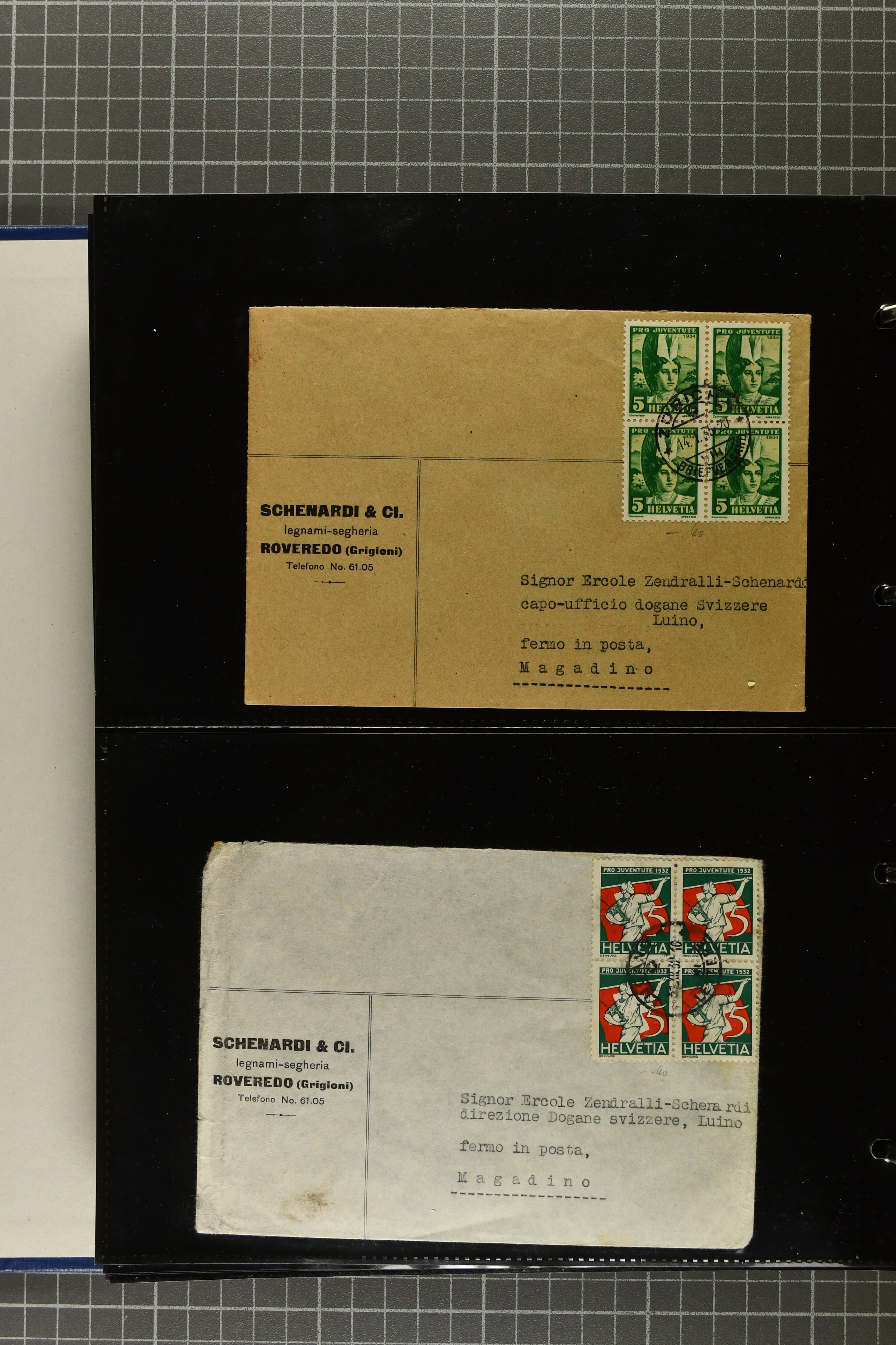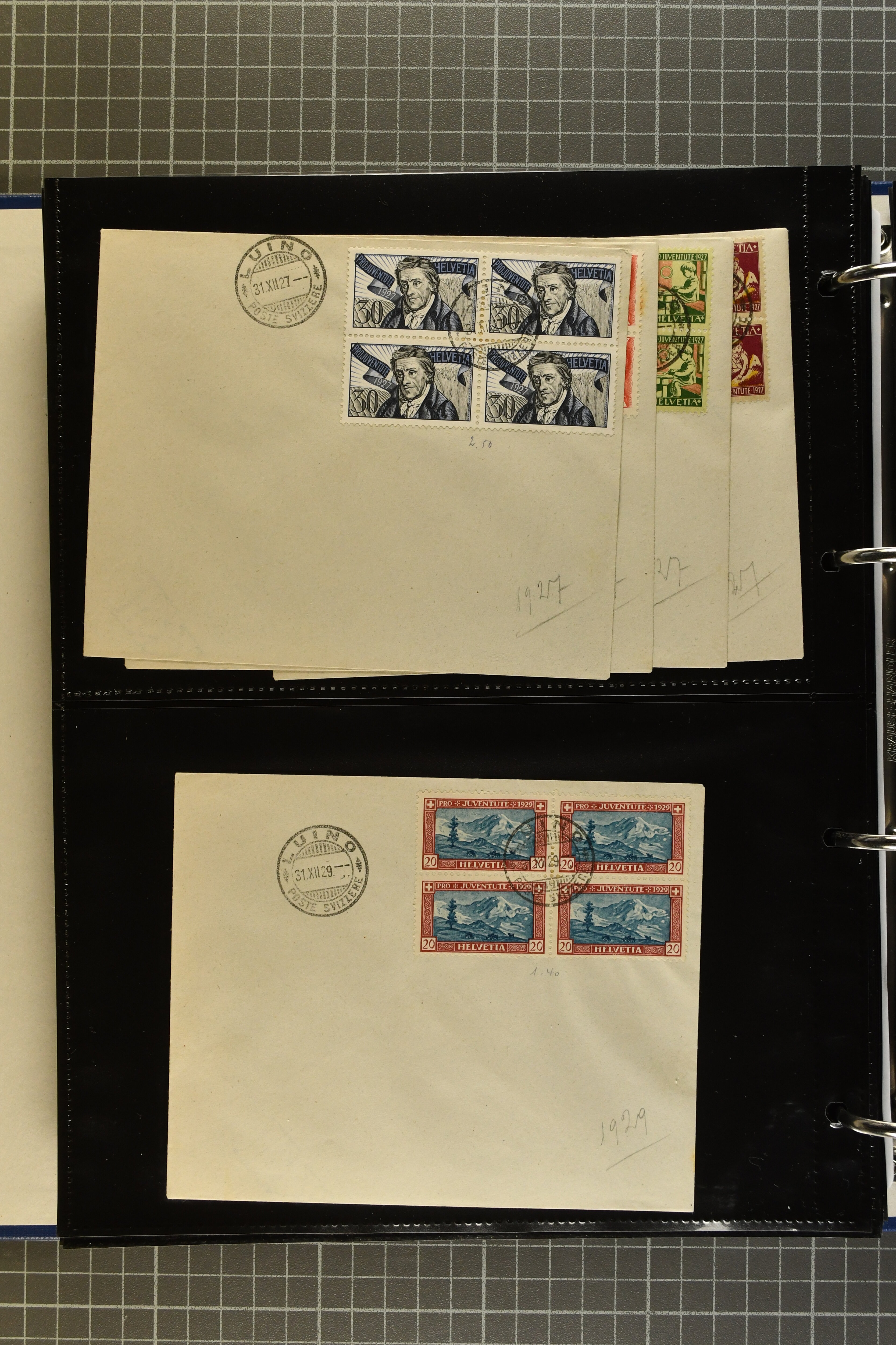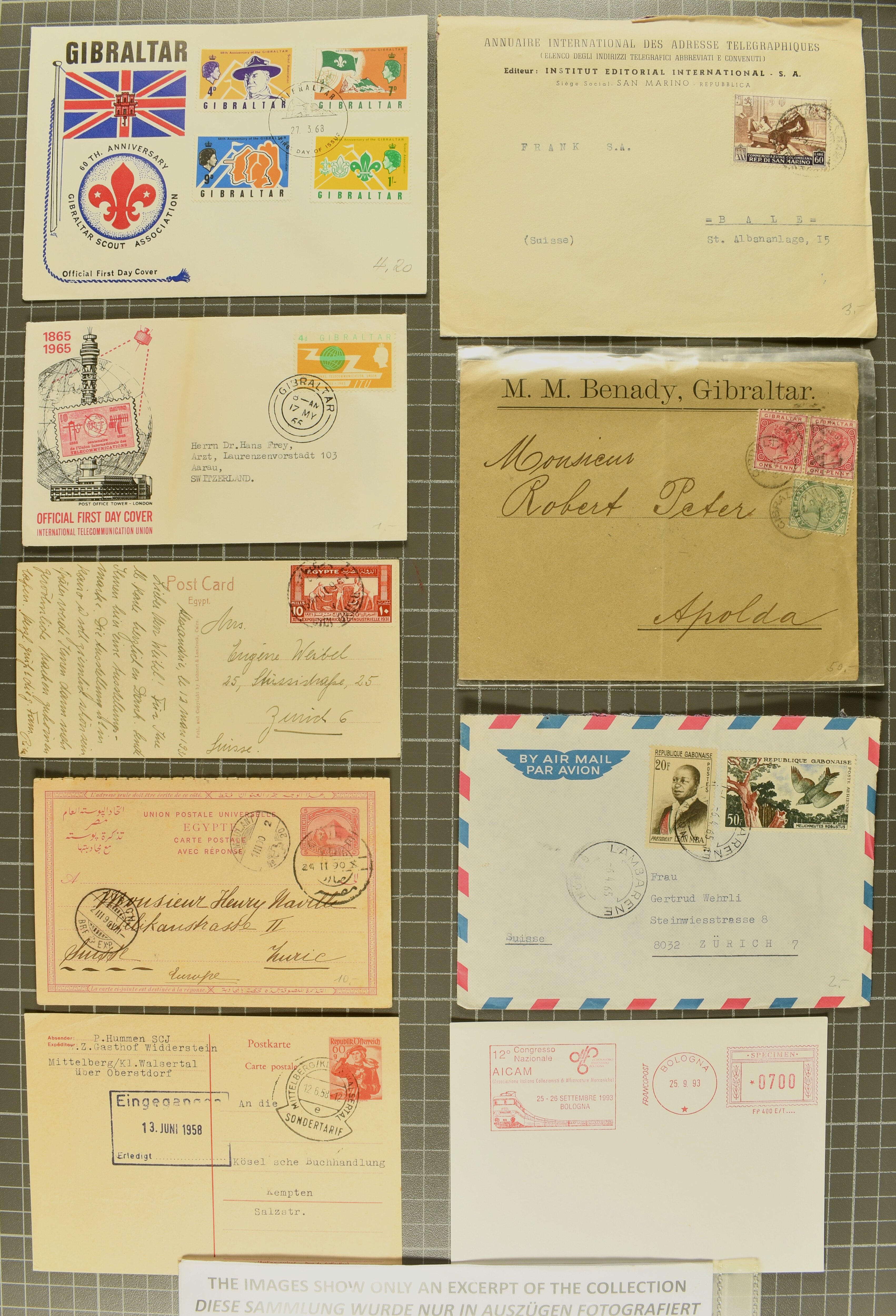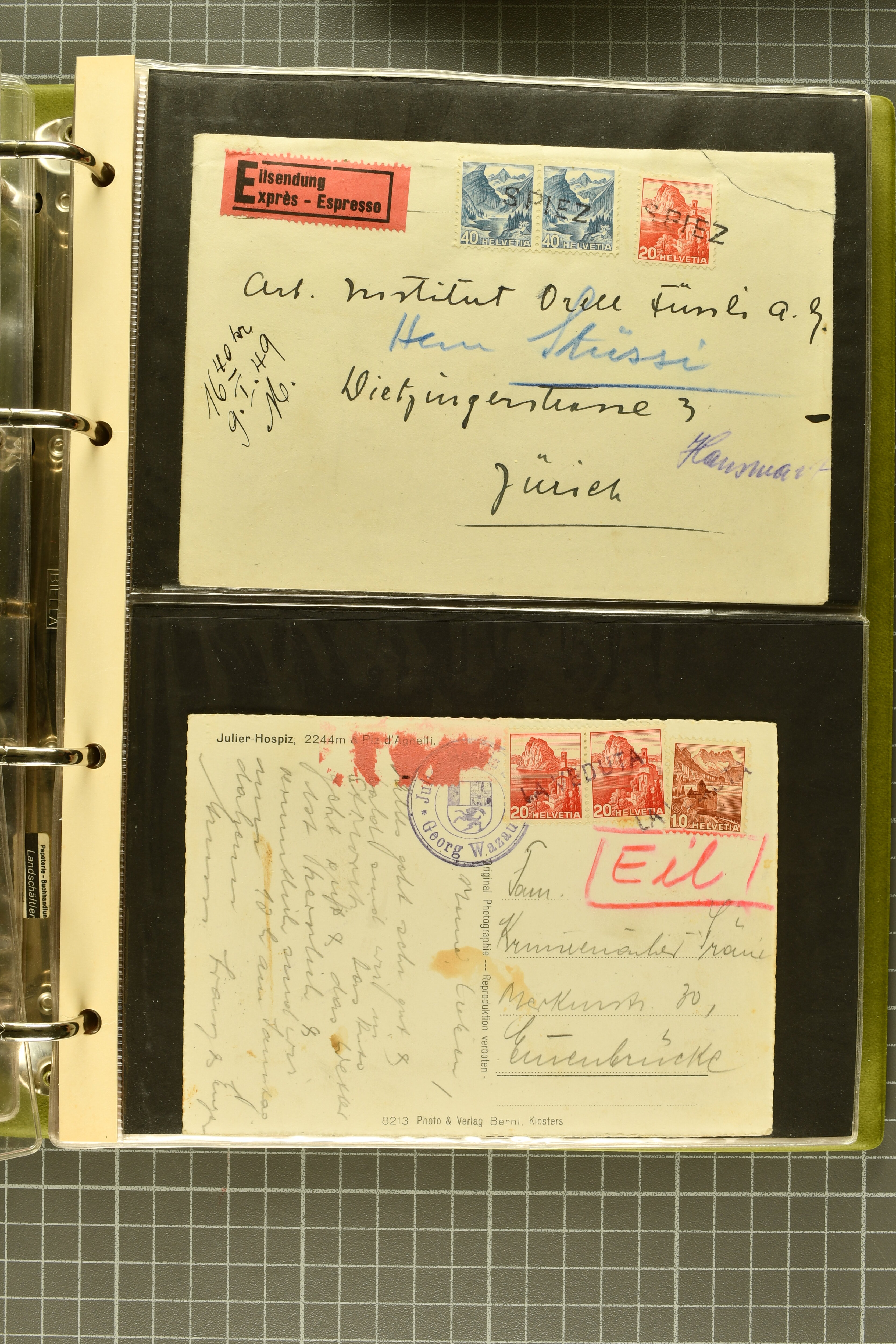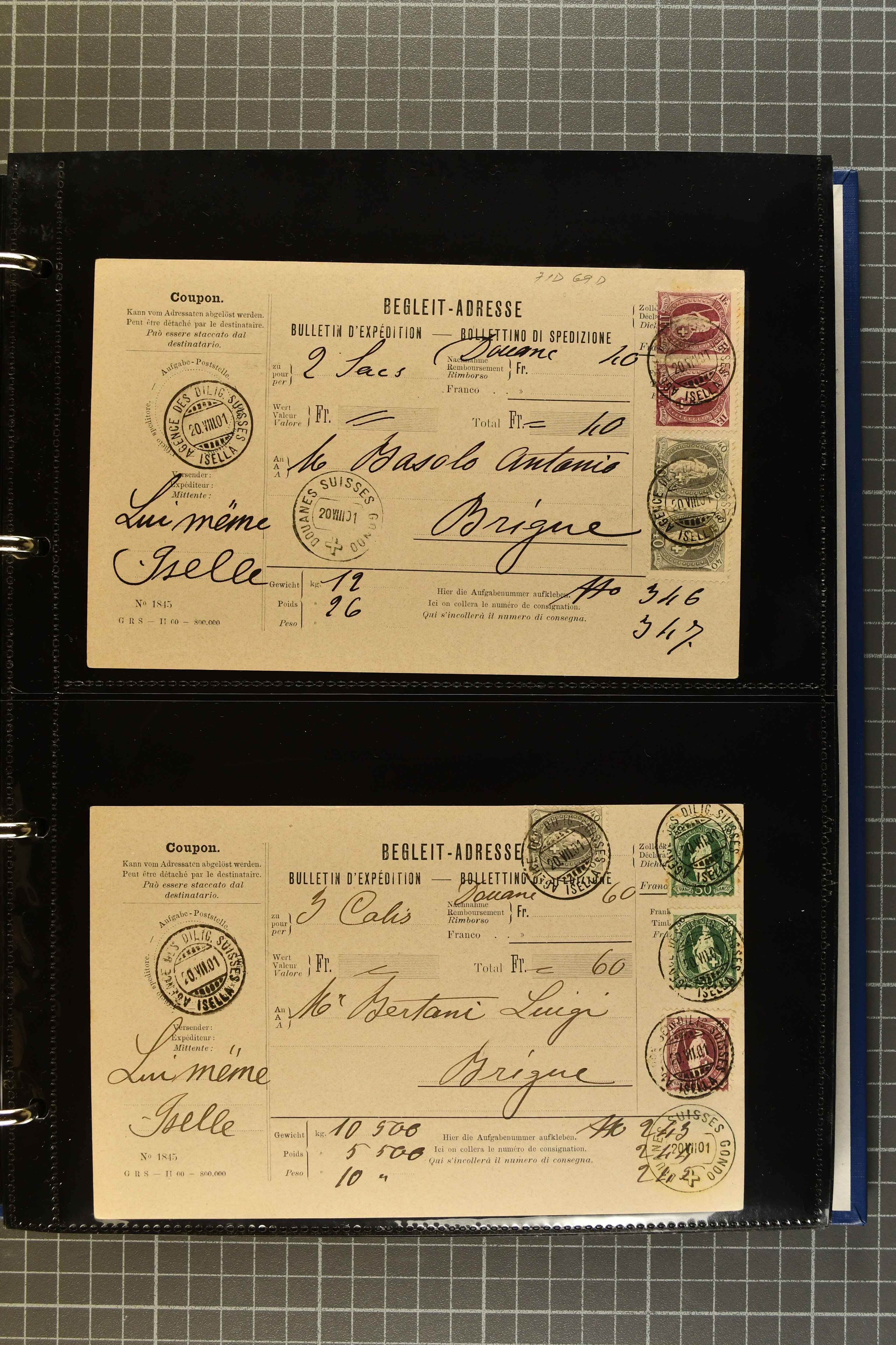 9644 image1880/1947ca.: Sammlungsbestand Schweizer Postagenturen im Ausland mit Belegen und losen Marken, sauber nach Agenturen geordnet in einem Briefalbum. Dabei einige sehr schönen Frankaturen der Stehenden Helvetia auf Paketkarten. Anschliessend Paketkarten mit der Sitzenden Helvetia mit Schwert sowie den Tellausgaben, darunter eine Karte mit Mischfrankatur Stehende Helvetia mit Sitzender Helvetia mit Schwert. Viele lose Marken auf Steckkarten, überwiegend Stehende Helvetia, zudem etwas Nachporto und Ziffernausgaben. Drei Paketkarten, 1 Italien, 1 Ägypten und 1 Palästine je durch schweizerisches Postamt in DOMODOSSOLA gelaufen, die beiden letzteren besonders prächtig. Weiterhin 19 Pro Juventute-Belege mit je einem Viererblock aus den Jahren 1925–1936, alle mit Stempel "LUINO POSTE SVIZZERE". Dazu das Buch von Ivo Bader: 'Schweizerische Postagenturen in Italien und Frankreich' sowie Landkarten und weitere Dokumentation. (Image 1) (Image 2) (Image 3) (Image 4) (Image 5) (Image 6) (Image 7) (Image 8) (Image 9) (Image 10) (Image 11) (Image 12) (Image 13) (Image 14) (Image 15) (Image 16) (Image 17) (Image 18) (Image 19) (Image 20) (Image 21) (Image 22) (Image 23) (Image 24) (Image 25) (Image 26) (Image 27) (Image 28) (Image 29) (Image 30) (Image 31) (Image 32) (Image 33) (Image 34) (Image 35) (Image 36) (Image 37)