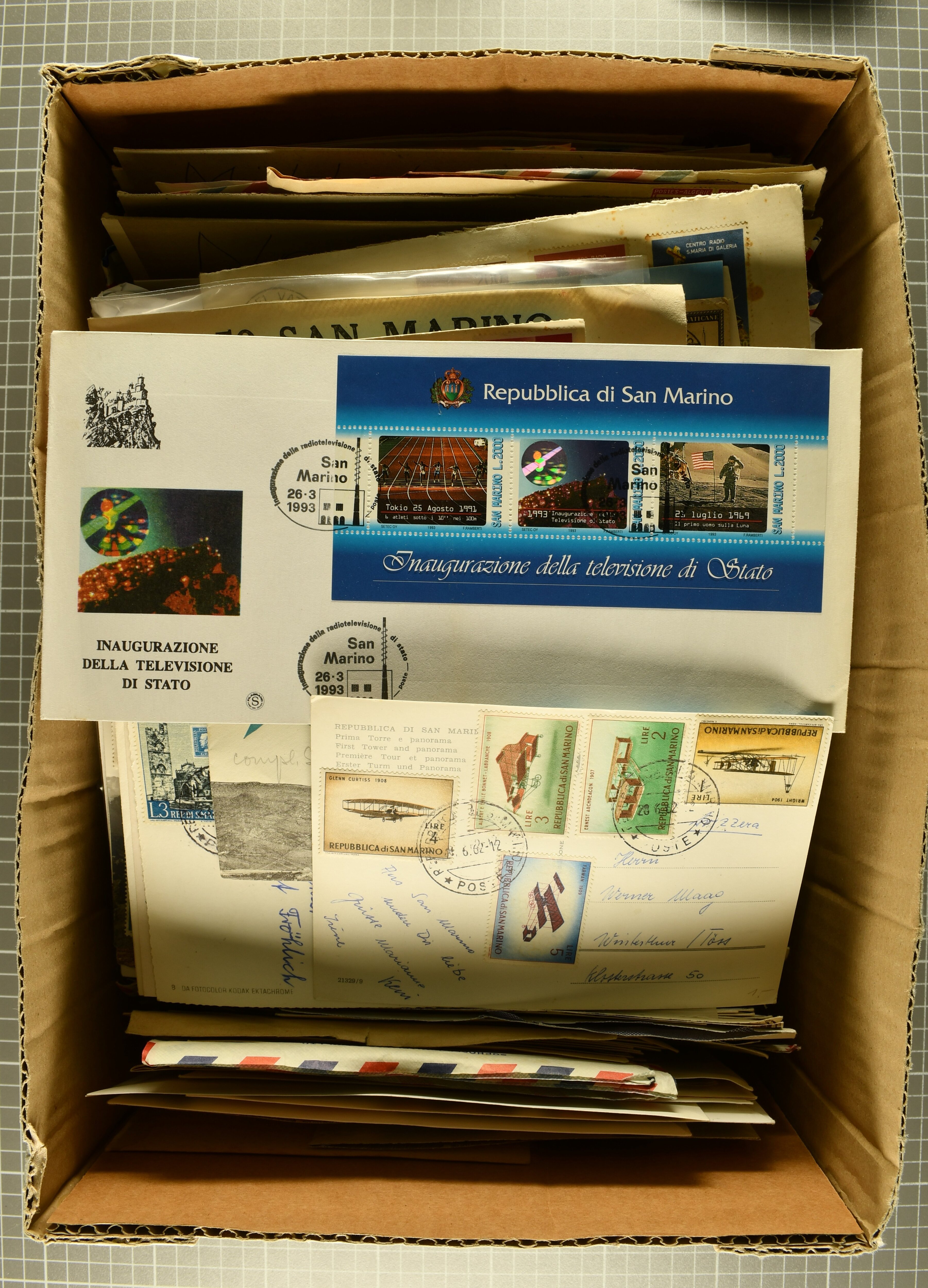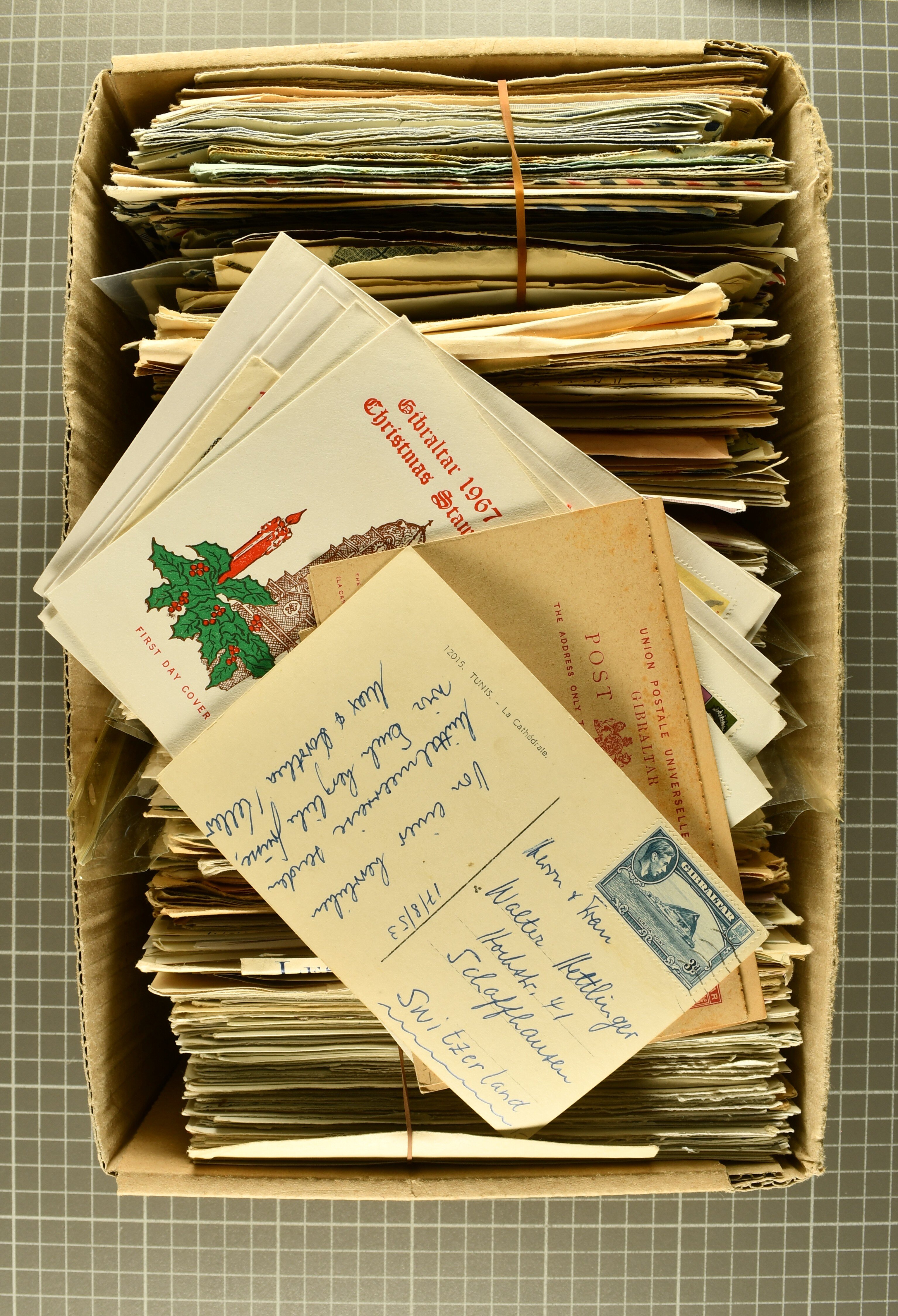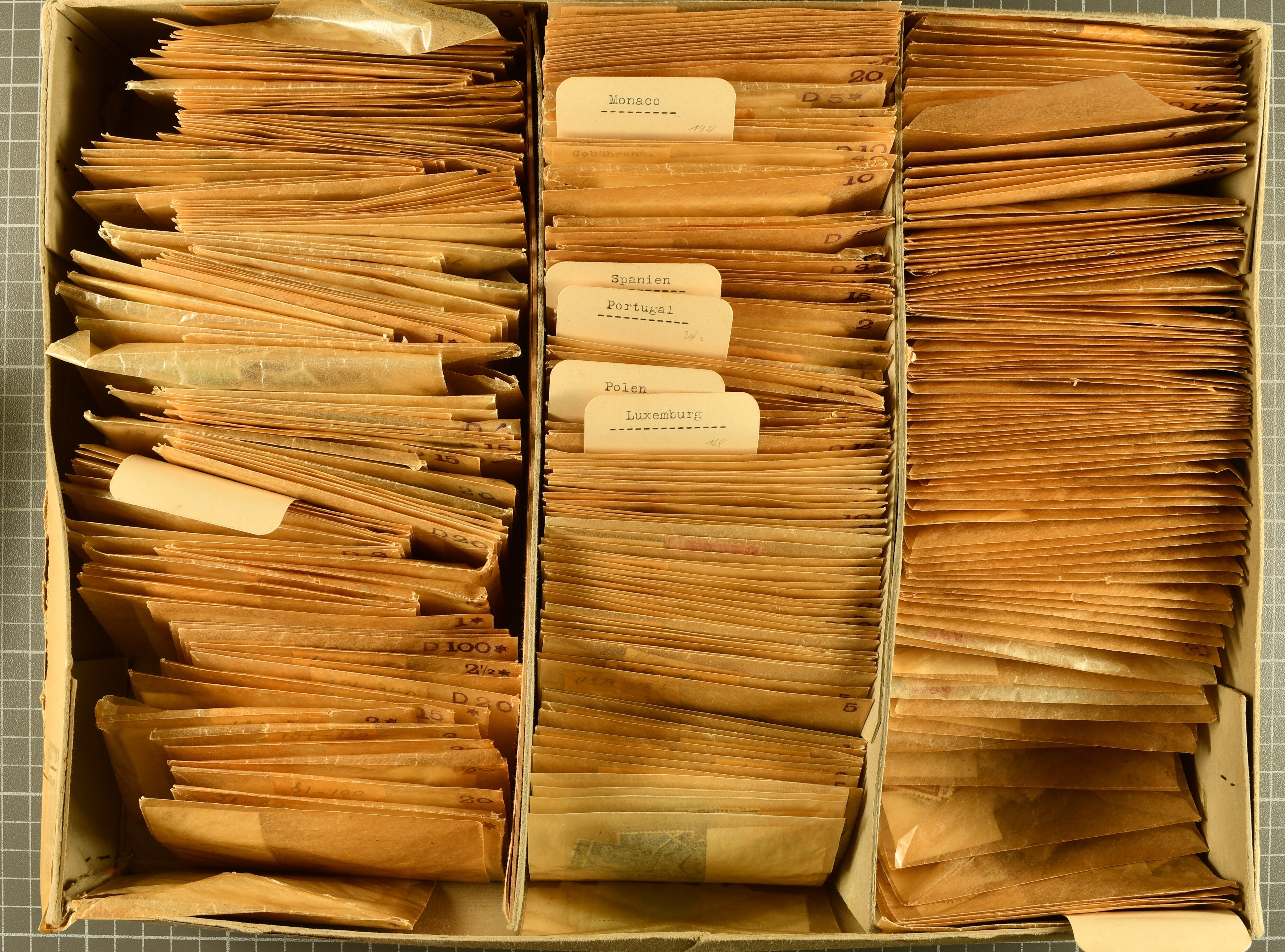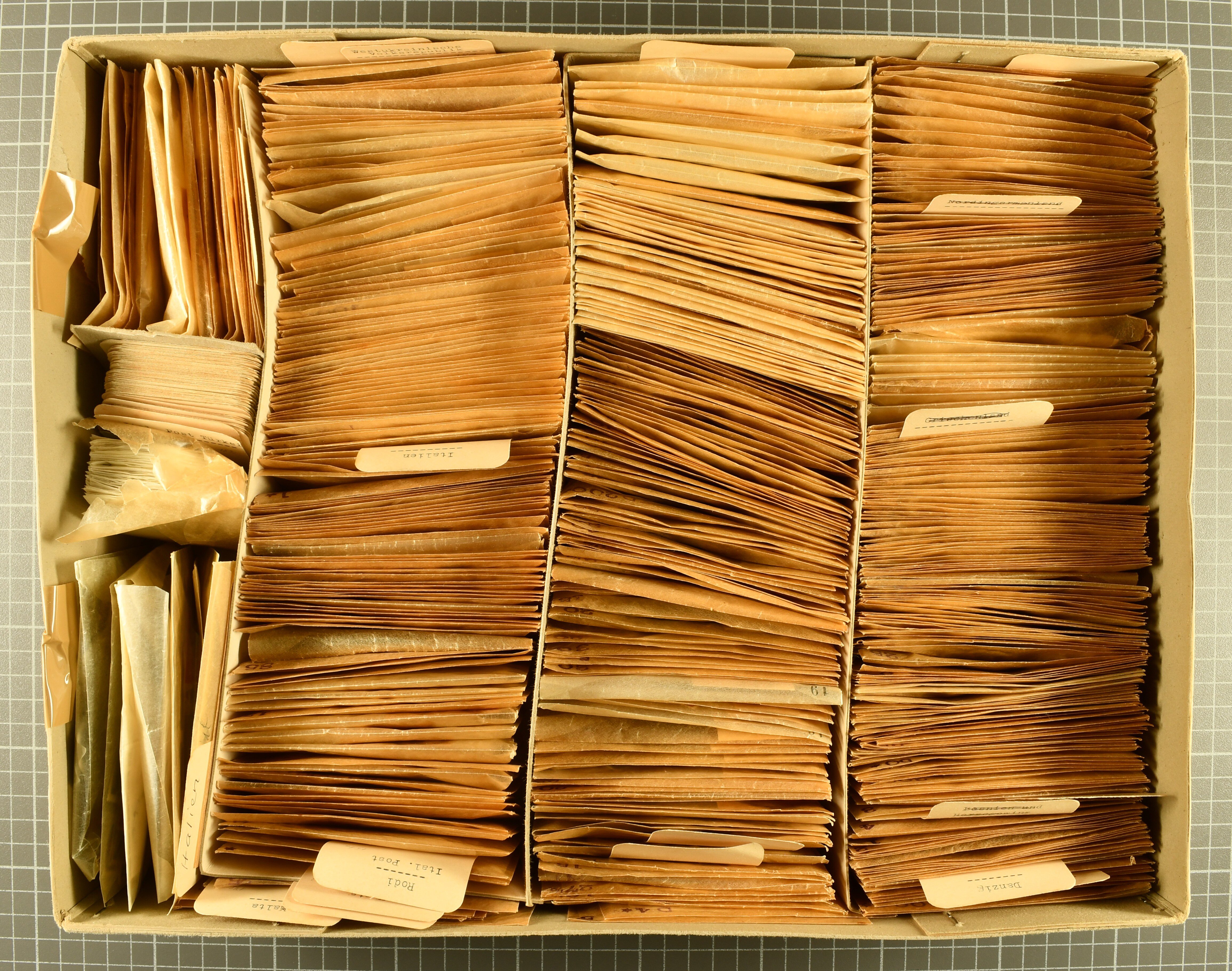 2721 image1870/2000ca.: Large box containing thousands and thousands of stamps, presorted in small glassines european countries mostly older prewar material and two boxes with covers from commercial and philatelic use, airmail, stationery, etc., from many different countries, mostly Europe, and in particular from small and microstates such as Cyprus, Malta, Monaco, San Marino, and Vatican City, but also some from Africa. (Image 1) (Image 2) (Image 3) (Image 4) (Image 5) (Image 6)