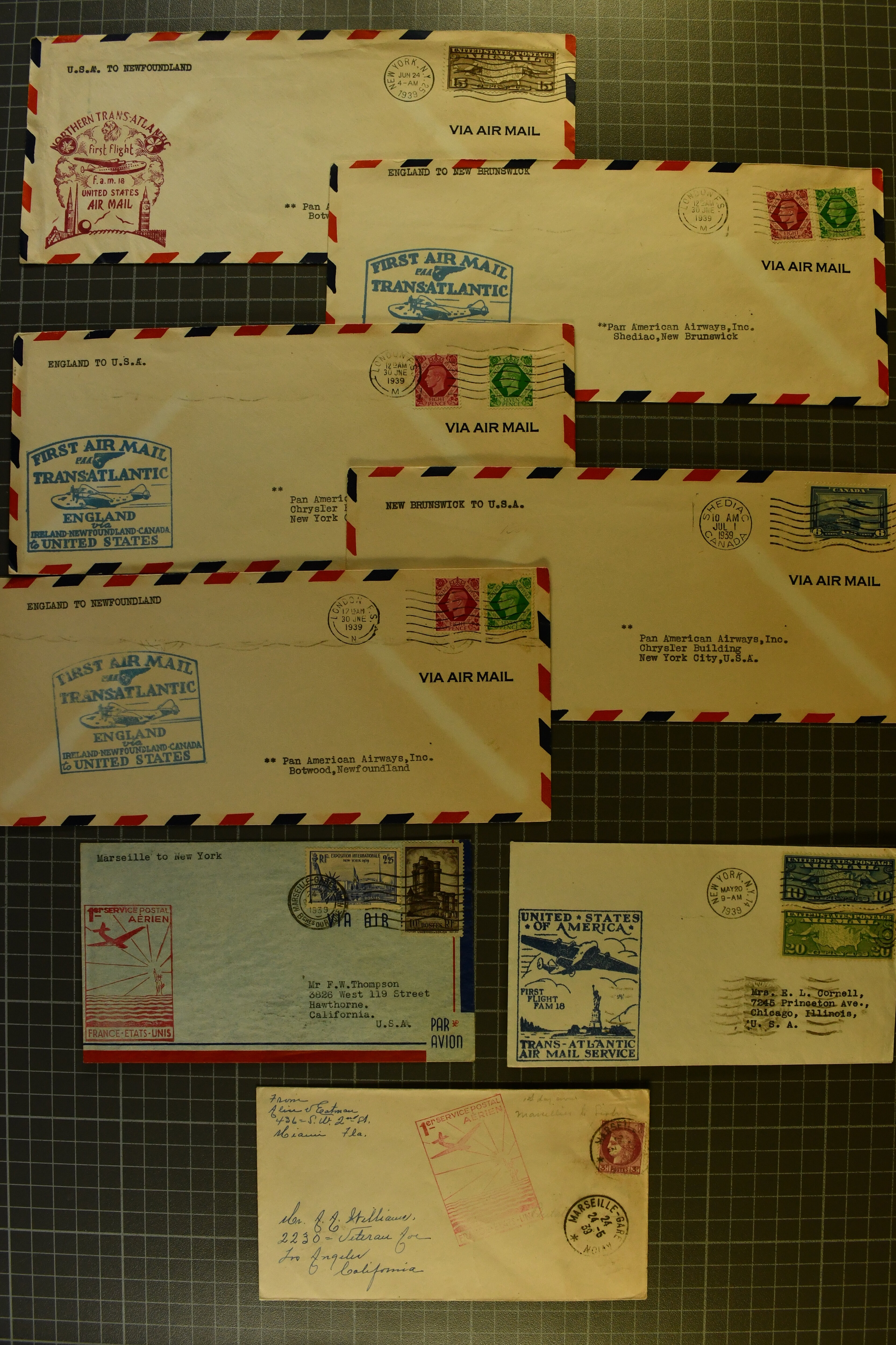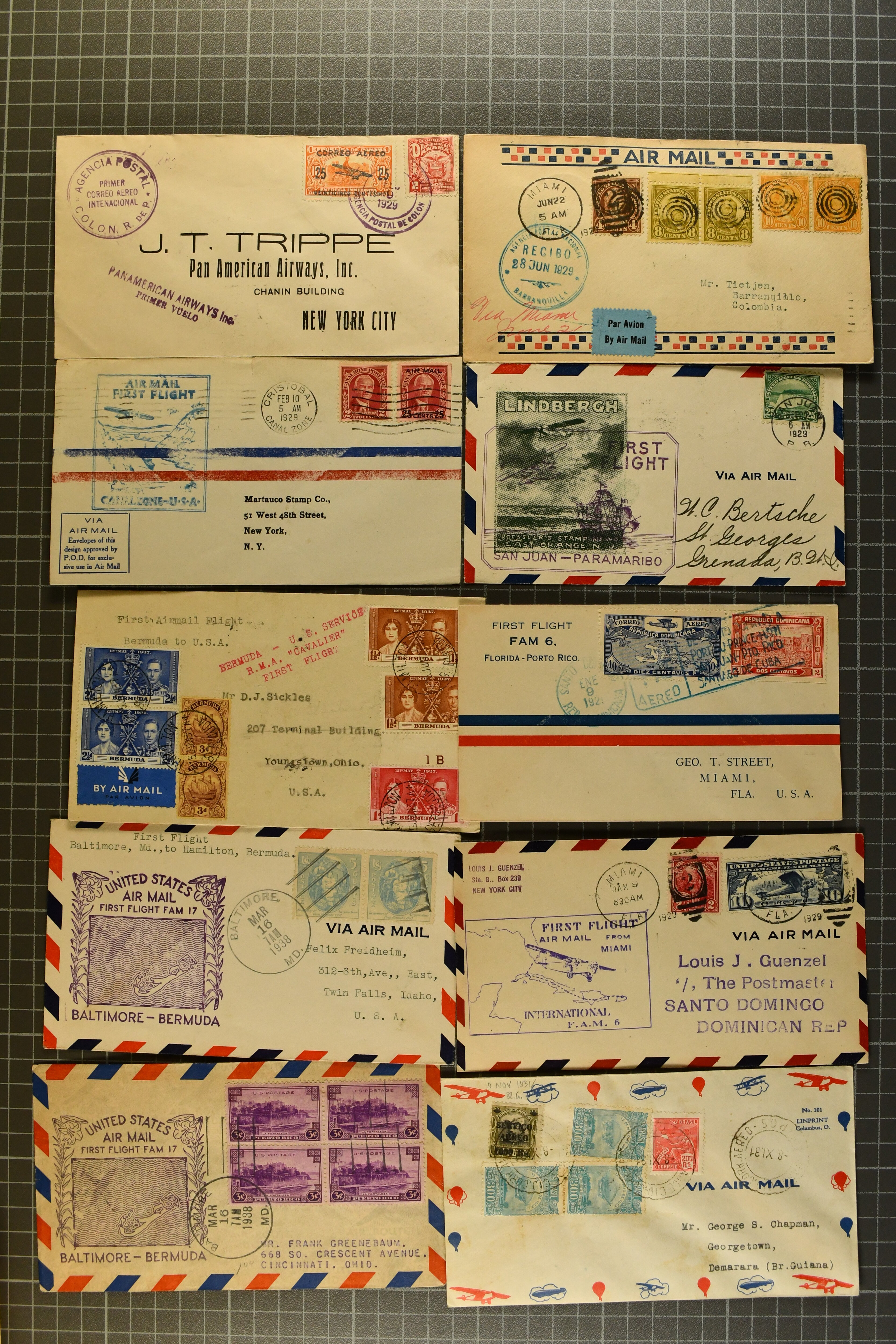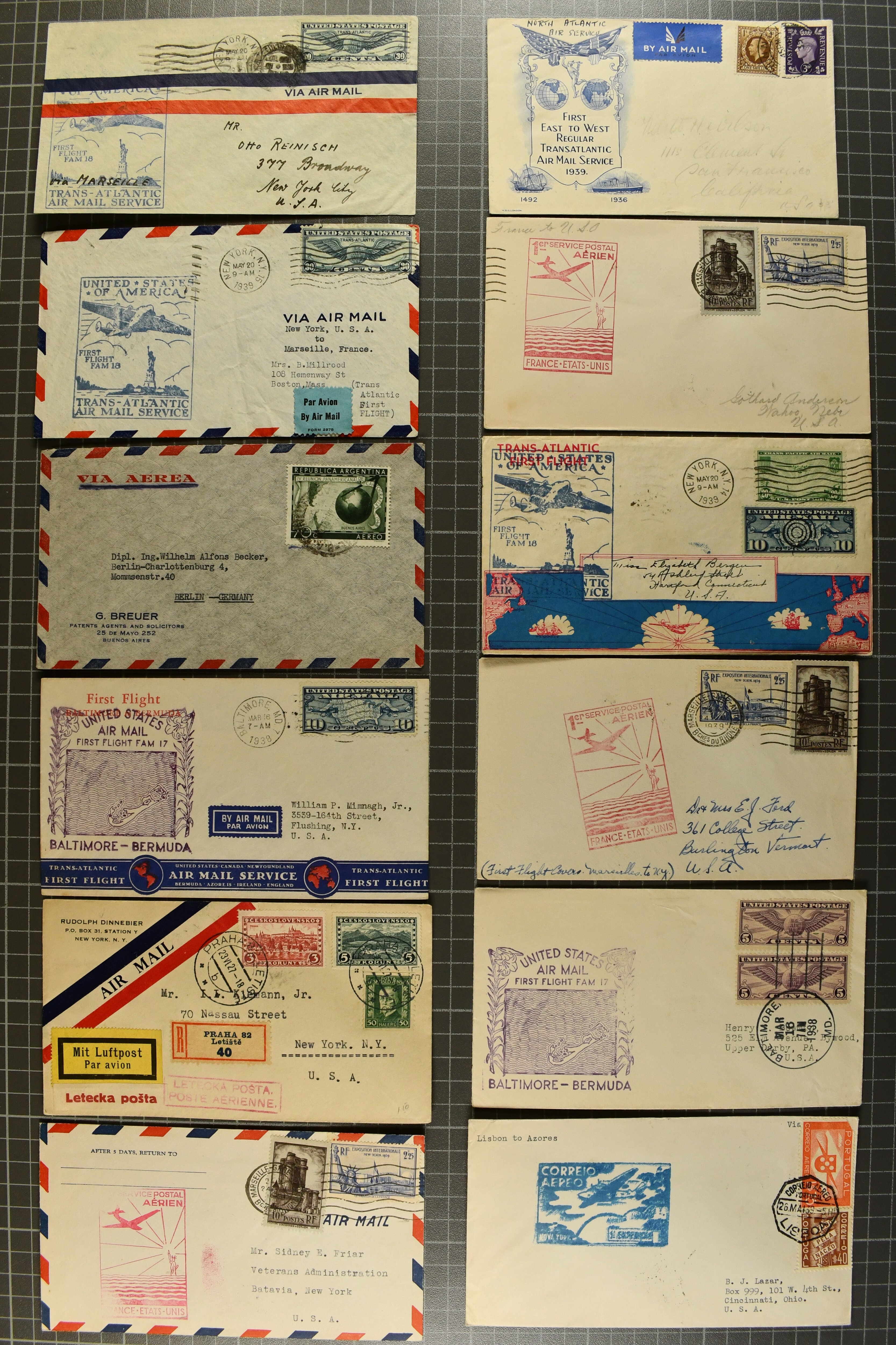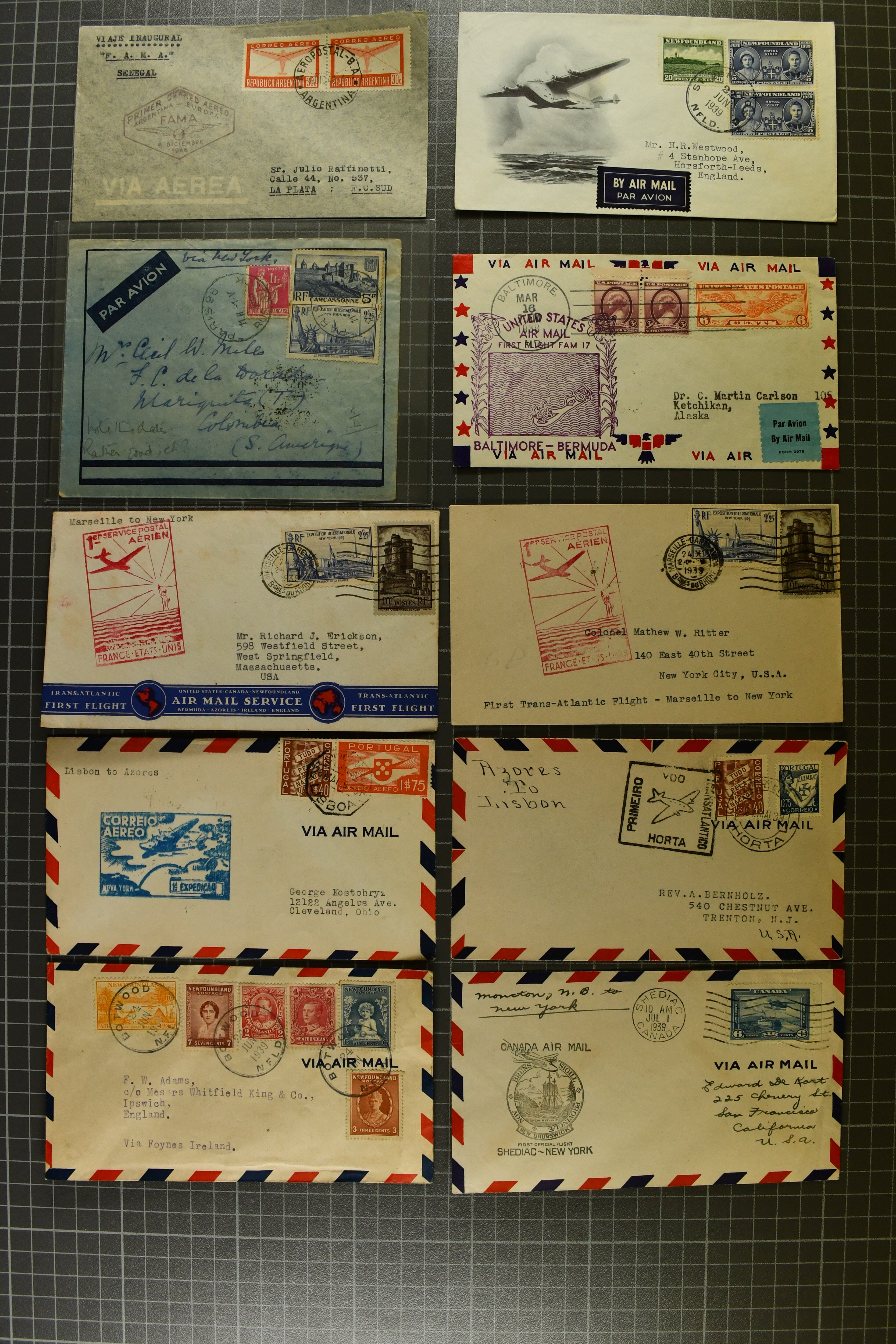 1775 cover imageTransatlantic Mail 1925/39: Group of 22 covers/cards, incl. 1925 'Amundsen - Ellsworth' North Pole Mail, 1927 Nungesser & Coli Search Expedition, 1931 Hilling and Hoiriis Transatlantic Flight, 1934 Benjamin and Joseph Adamowicz attempted non-stop flight New York to Warsaw (2), 1937 “Anglo-American Good Will Coronation Flight” (2), 1939 PAA flight Bogota - New York - Europe (Mu90), IA first flight Paramaribo - New York - Southampton to Holland (Mu51) as well as eight special printed 'Amon Carter' covers of 1939 'Yankee Clipper' flight New York - Azores - Lisbon - Marseilles FAM-18 inauguration flight. Some with edge wear, but generally fine. (Image 1) (Image 2) (Image 3) (Image 4) (Image 5) (Image 6) (Image 7) (Image 8) (Image 9) (Image 10) (Image 11) (Image 12)