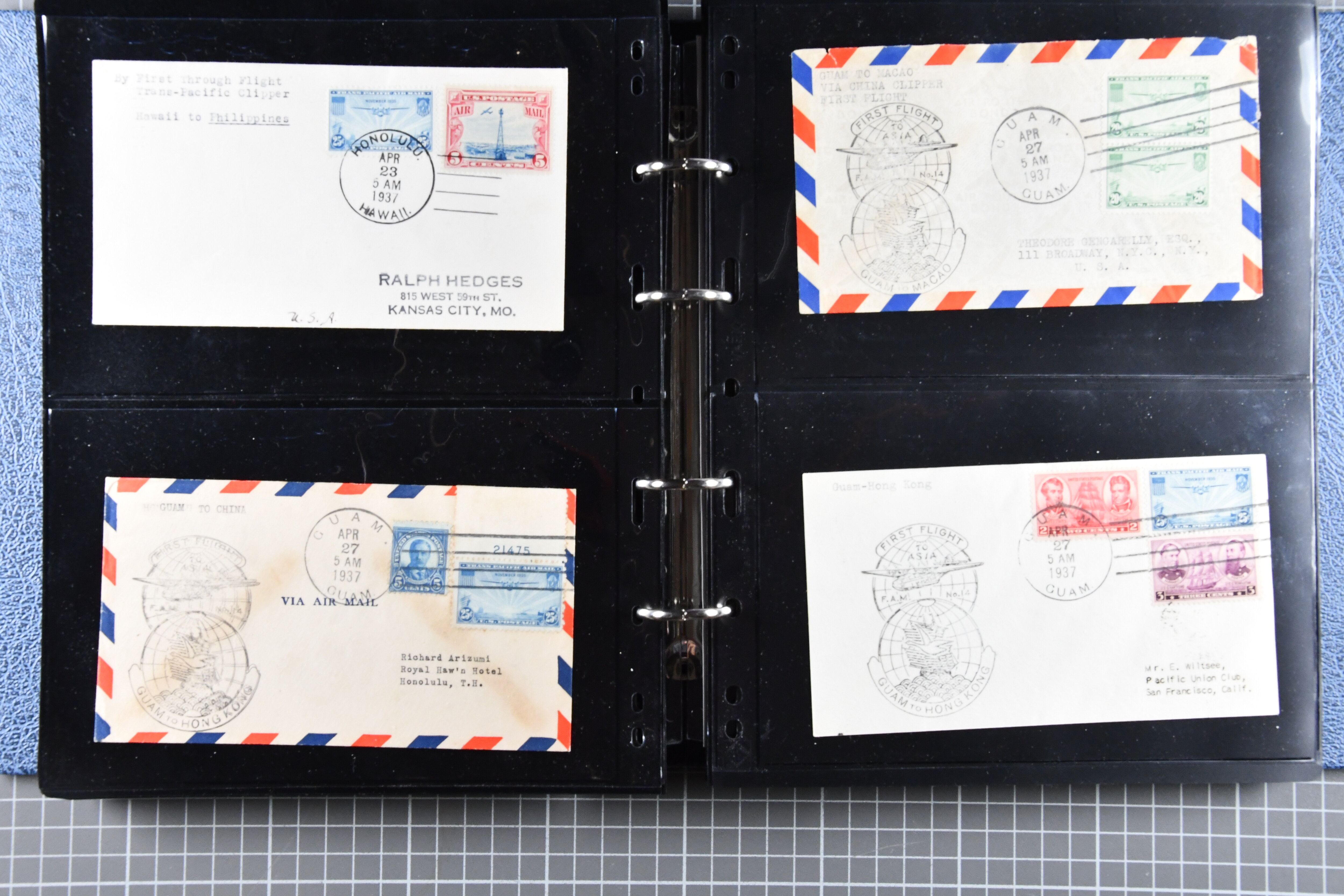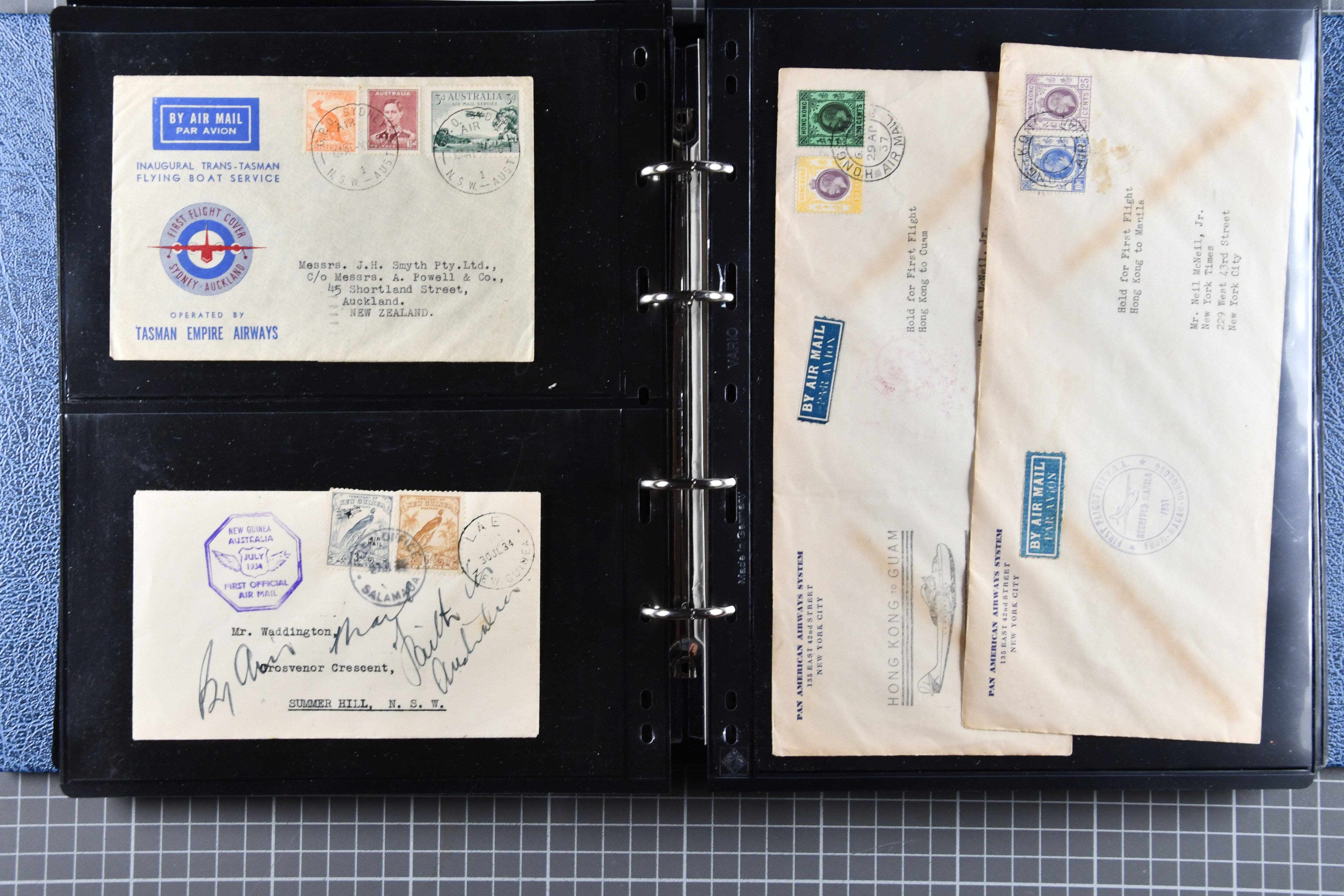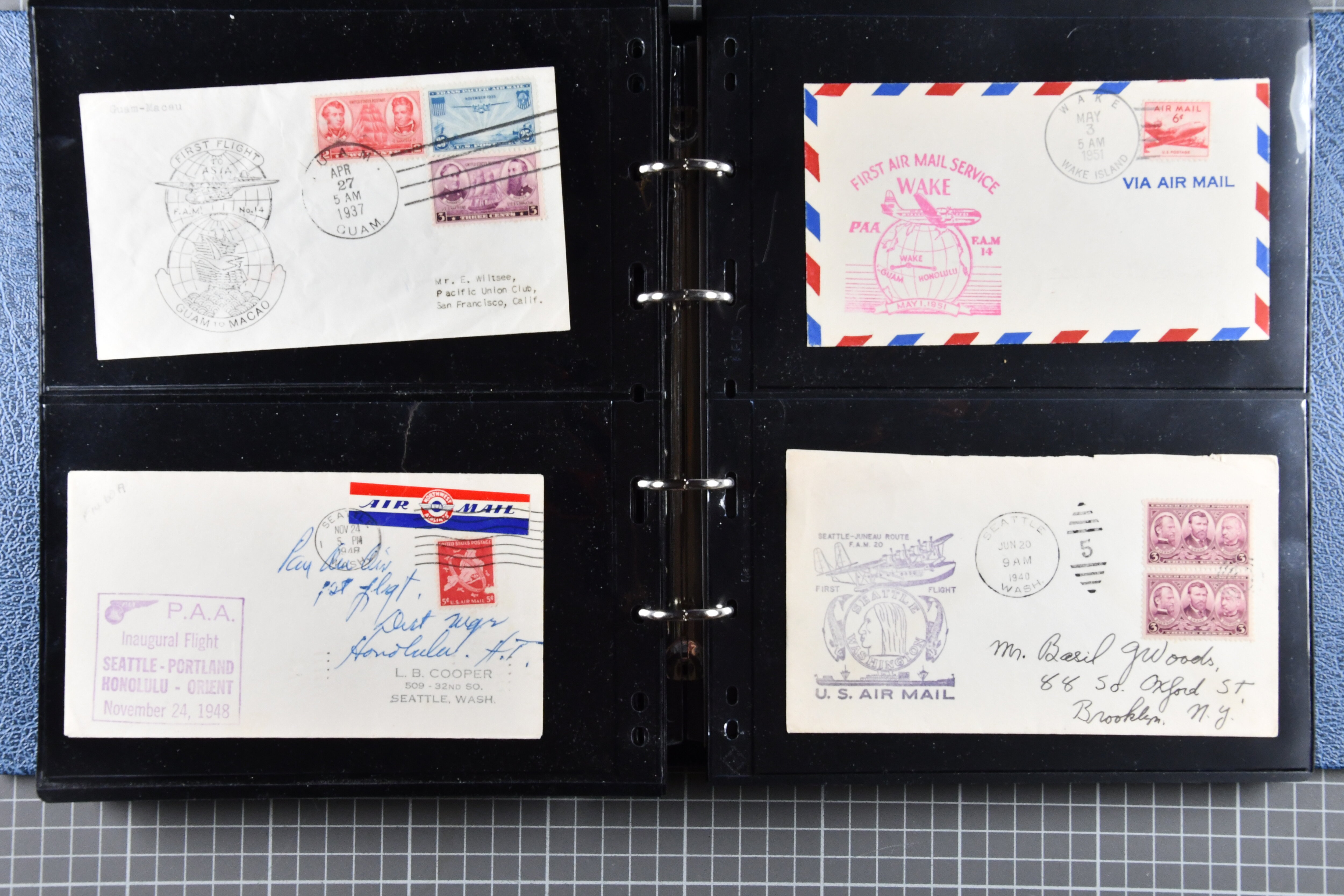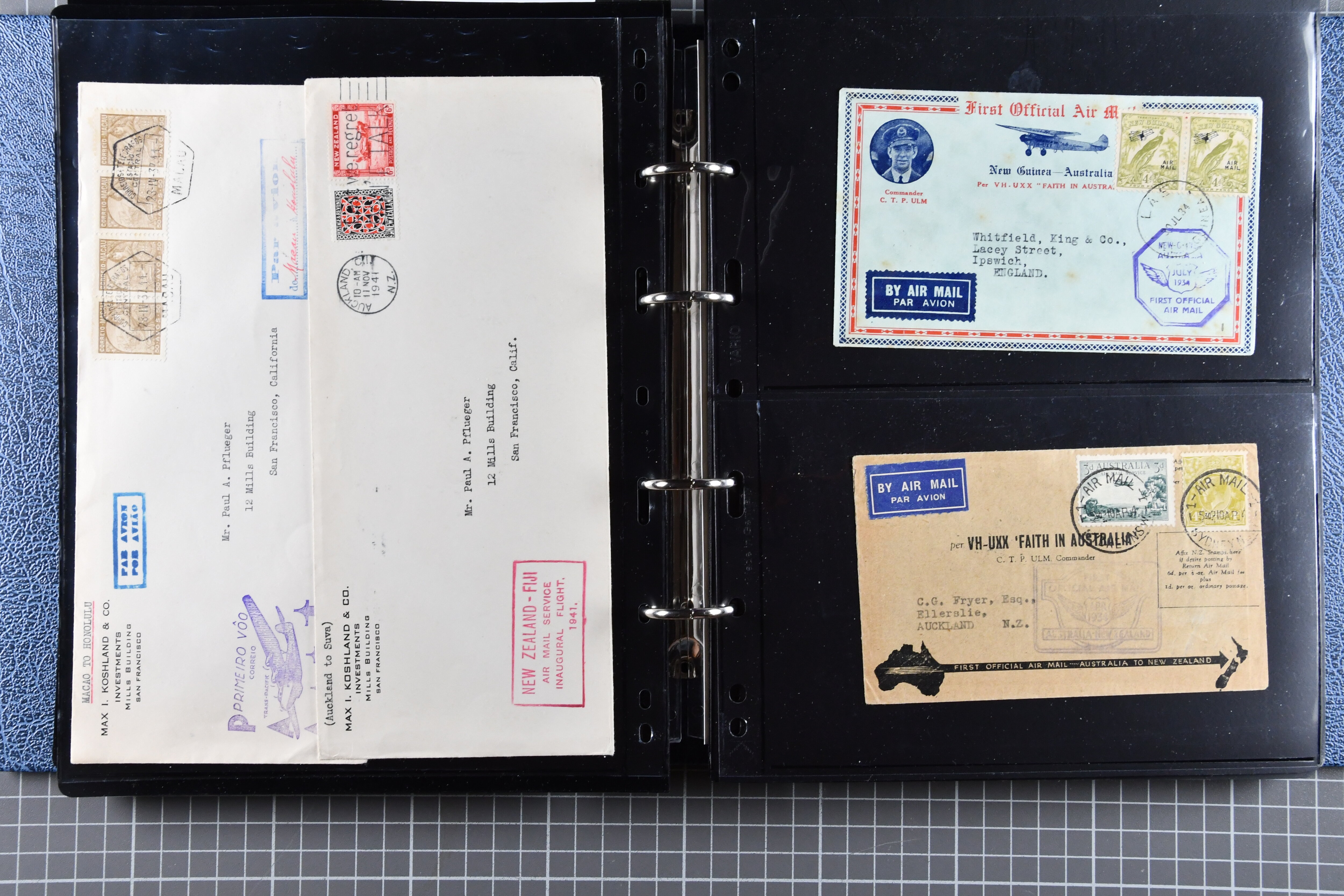1773 cover imageTrans-Pacific Airmail 1938/44: Lot 55 airmail covers, incl. six commercial airmail covers carried by Clipper through the FAM 14 system, among them a rare commercial air mail usage by Naval Air Transport Service NATS, which was only used for military mail, further 1933/44 First Flight Covers (16) from Australia, Papua and New Zealand as well as 33 Trans-Pacific First Flight covers, all flown under FAM 14-19-20-1 scheme. (Image 1) (Image 2) (Image 3) (Image 4) (Image 5) (Image 6) (Image 7) (Image 8) (Image 9) (Image 10) (Image 11) (Image 12) (Image 13) (Image 14) (Image 15)