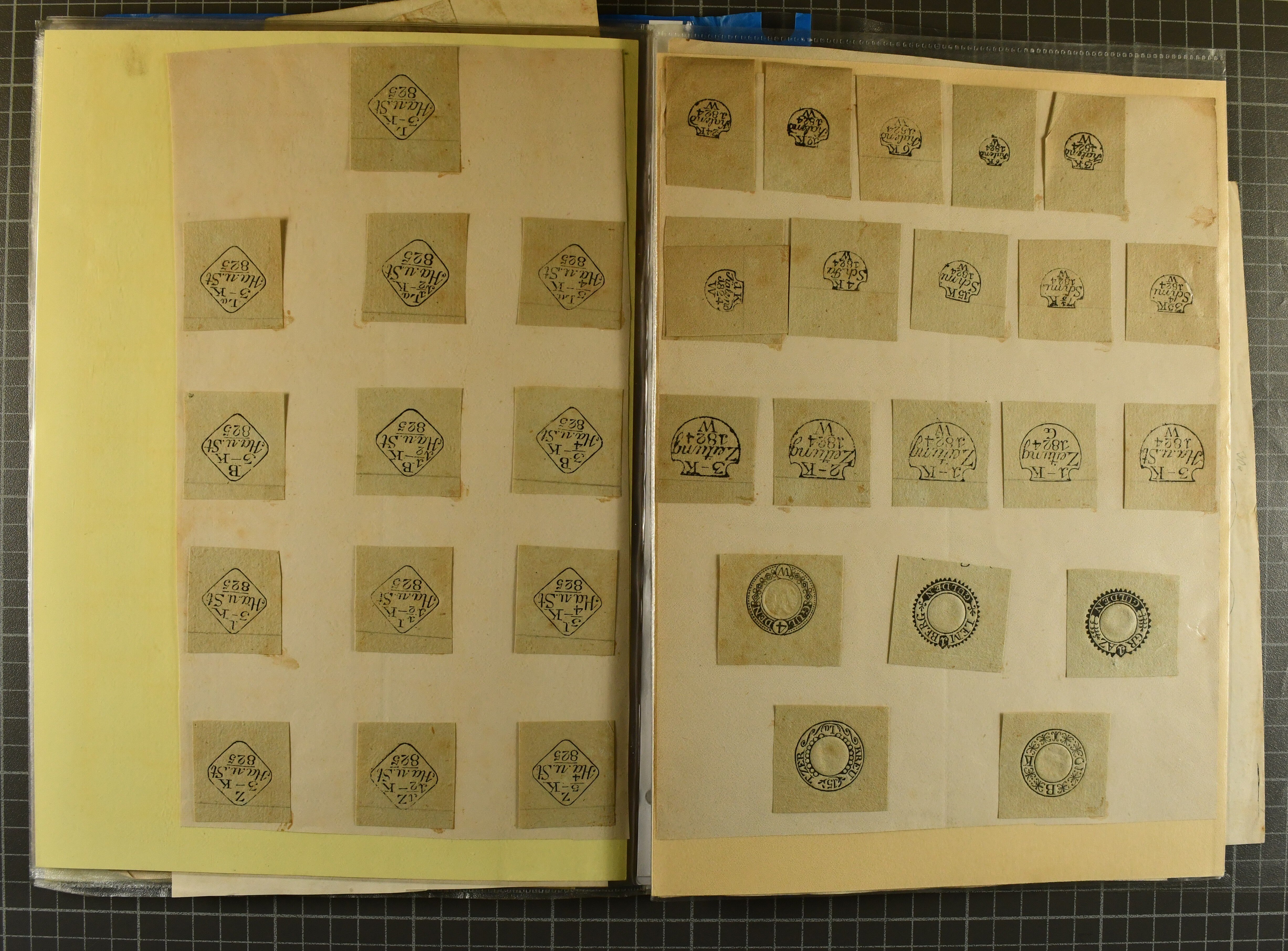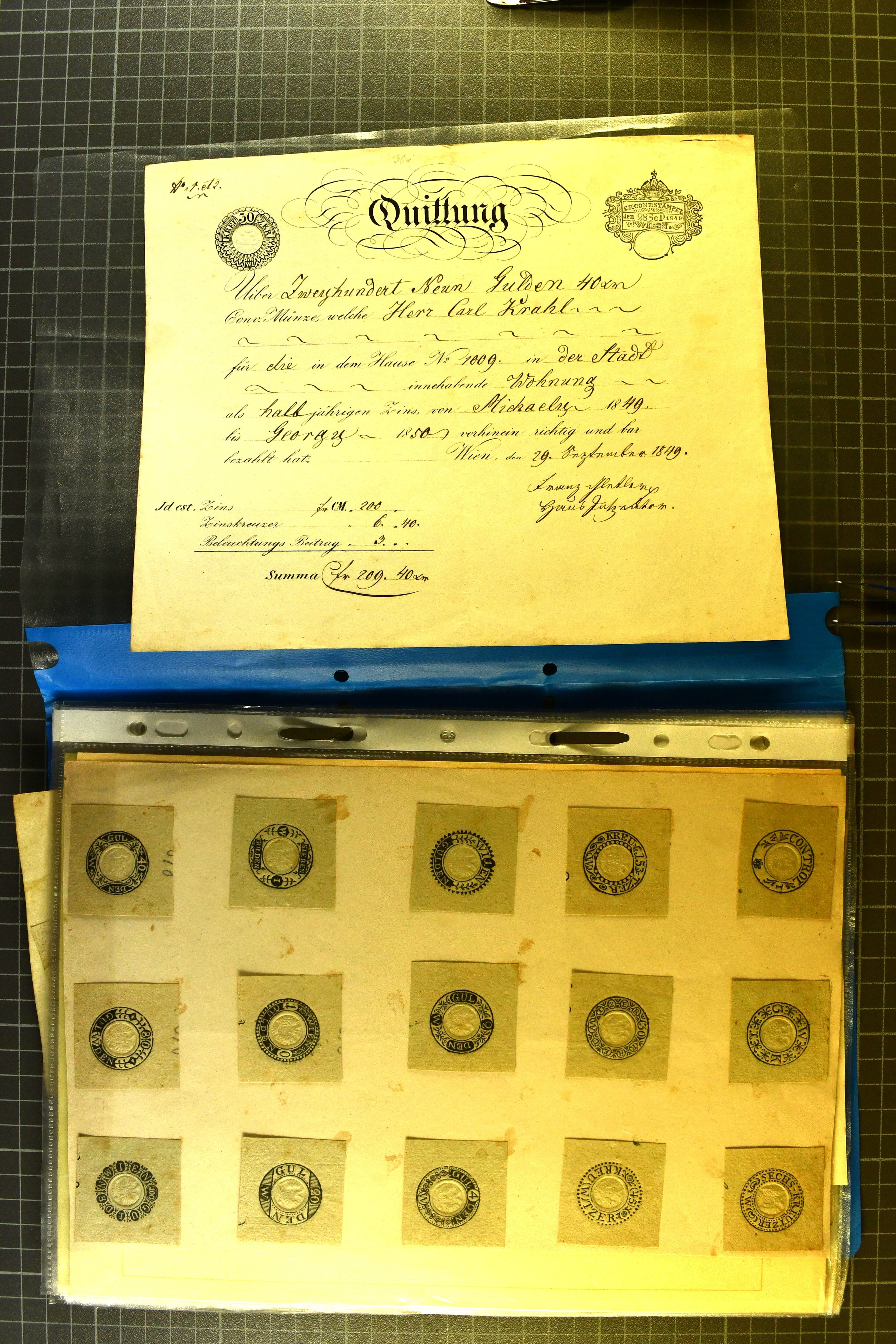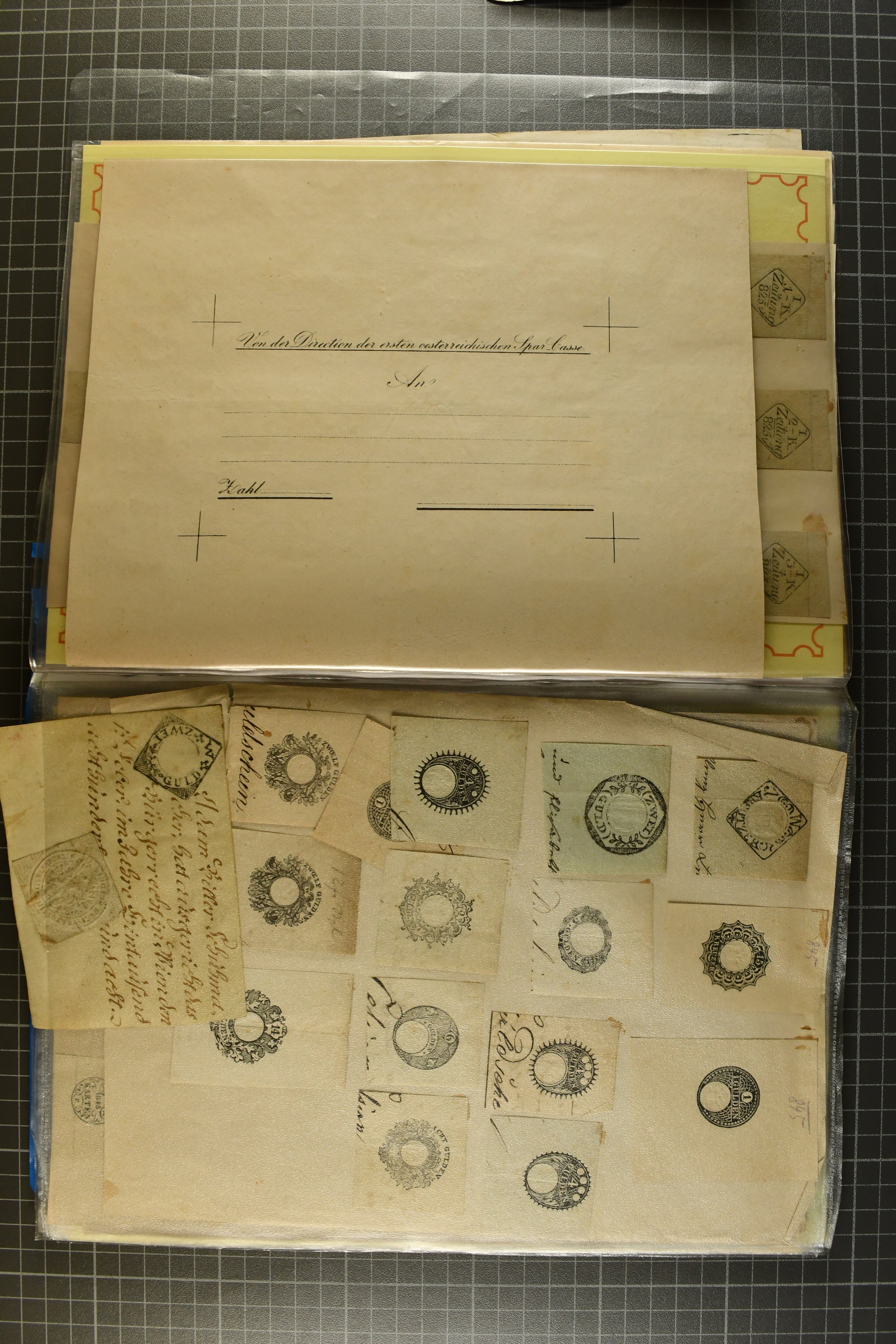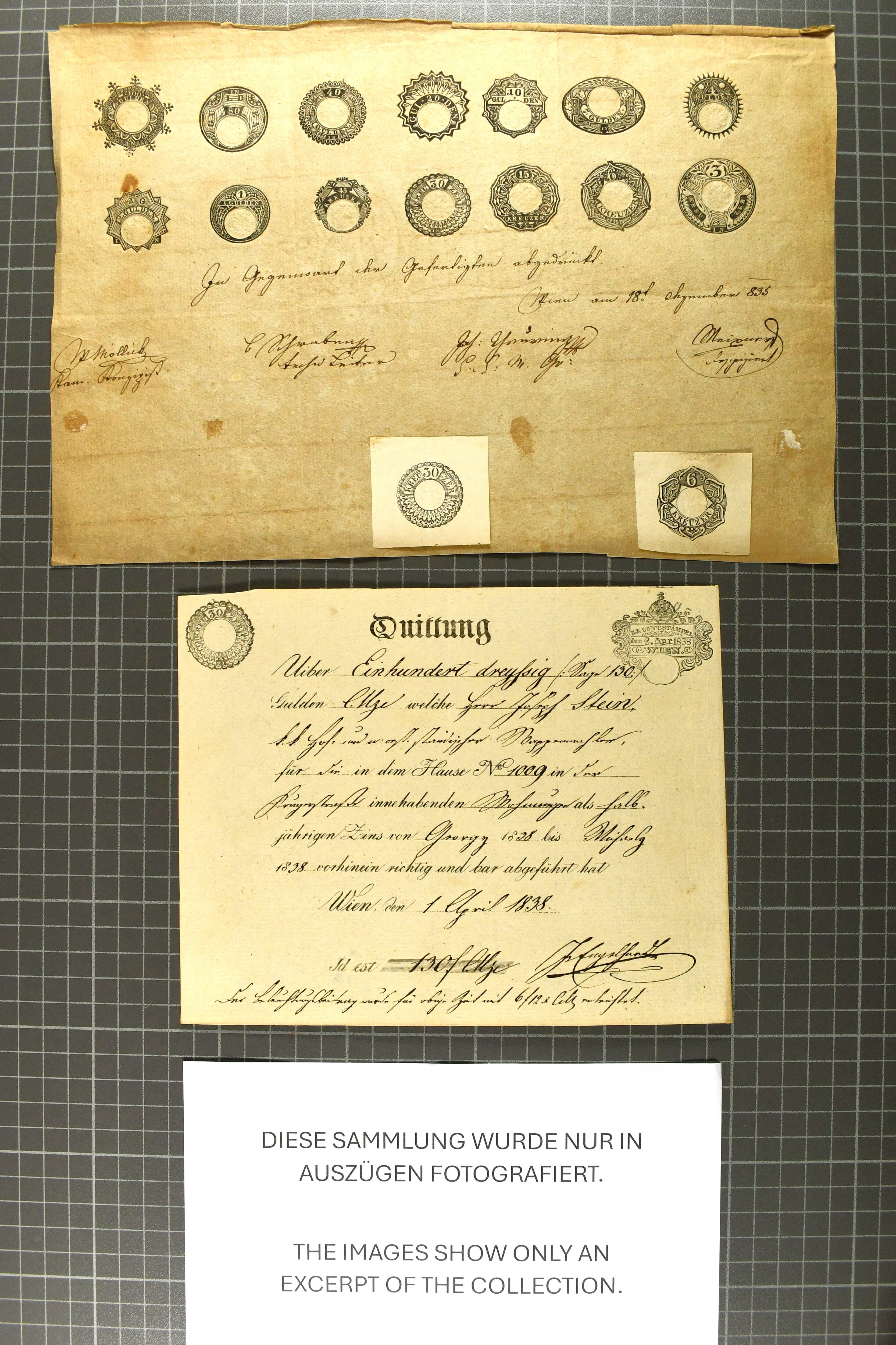 Gulden enthält. Zudem eine Sammlung von Ausschnitten, jeweils mit der Stempelmarke auf Blättern, einige vollständige Originalbelege sowie ein grossformatiges Einsteckbuch mit einer weiteren Sammlung verschiedenster Stempelmarken, oft mit hohen