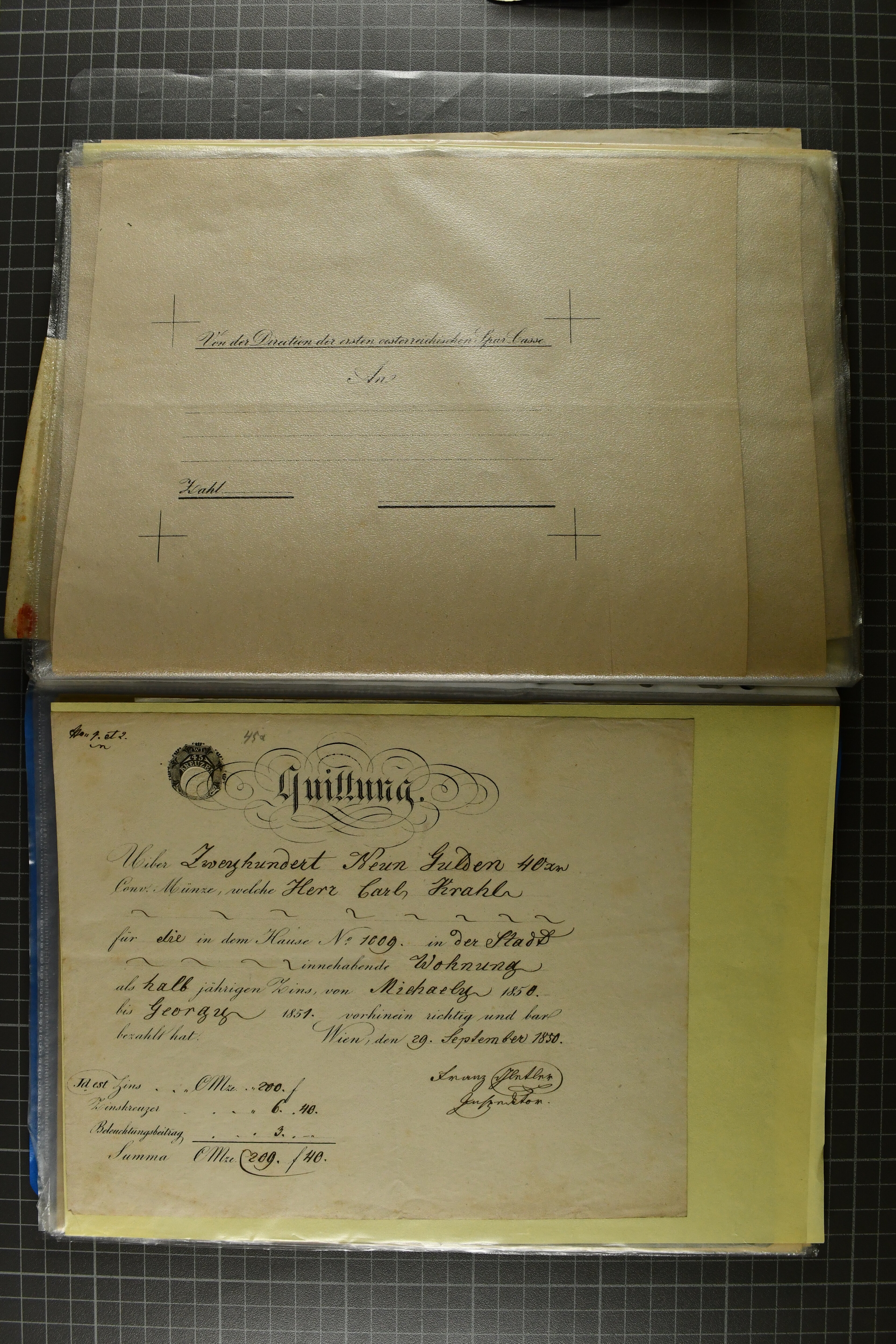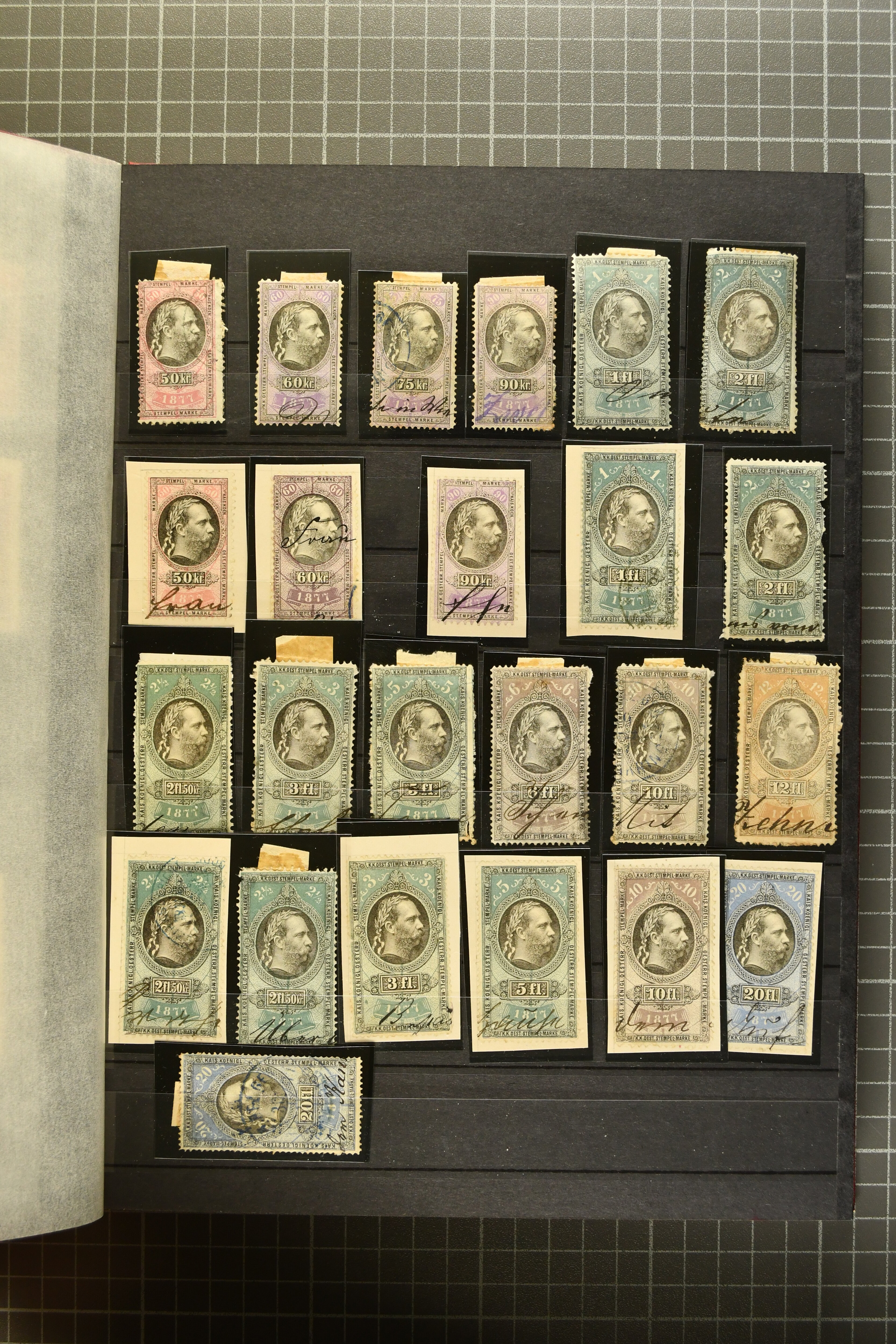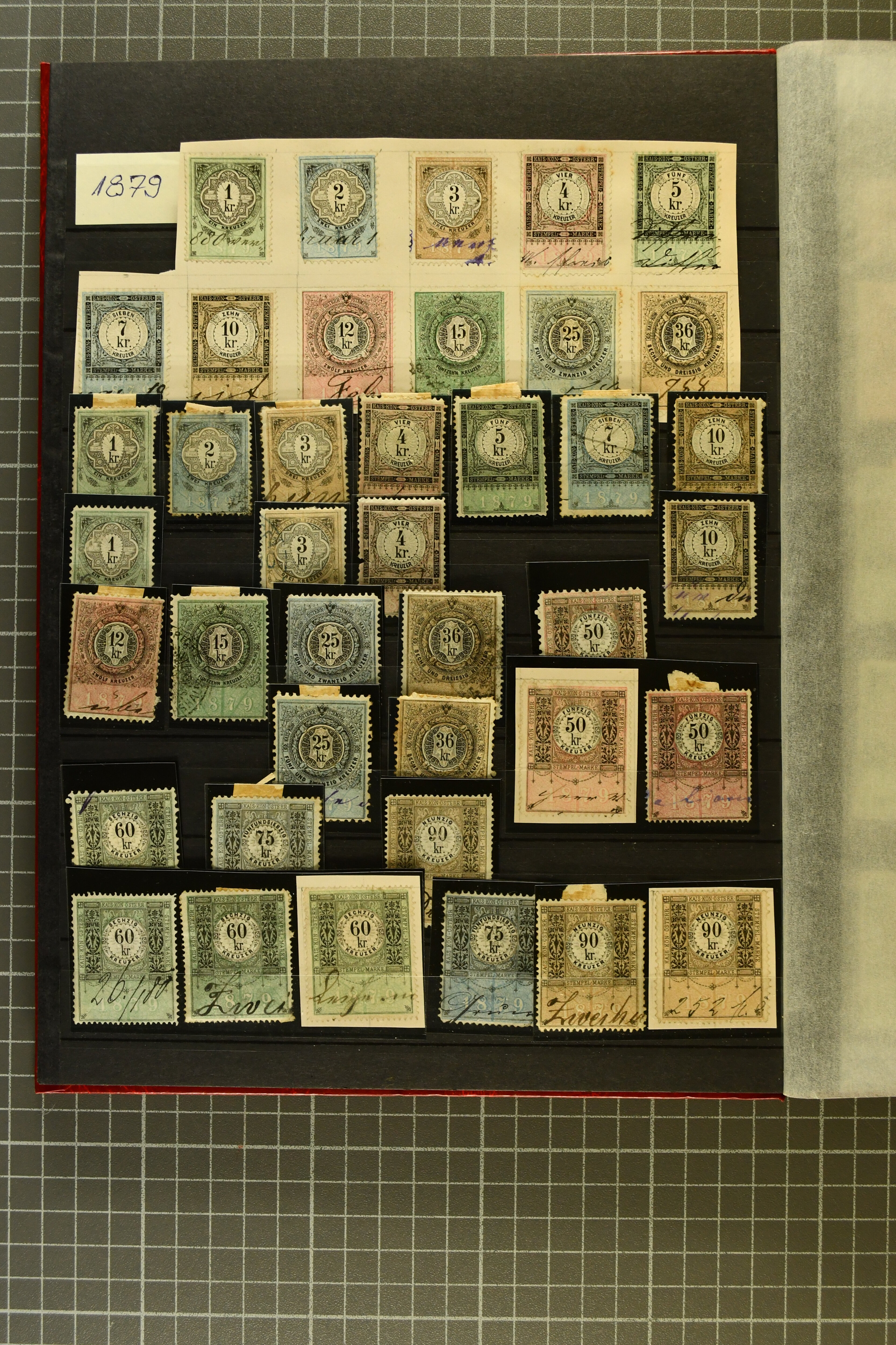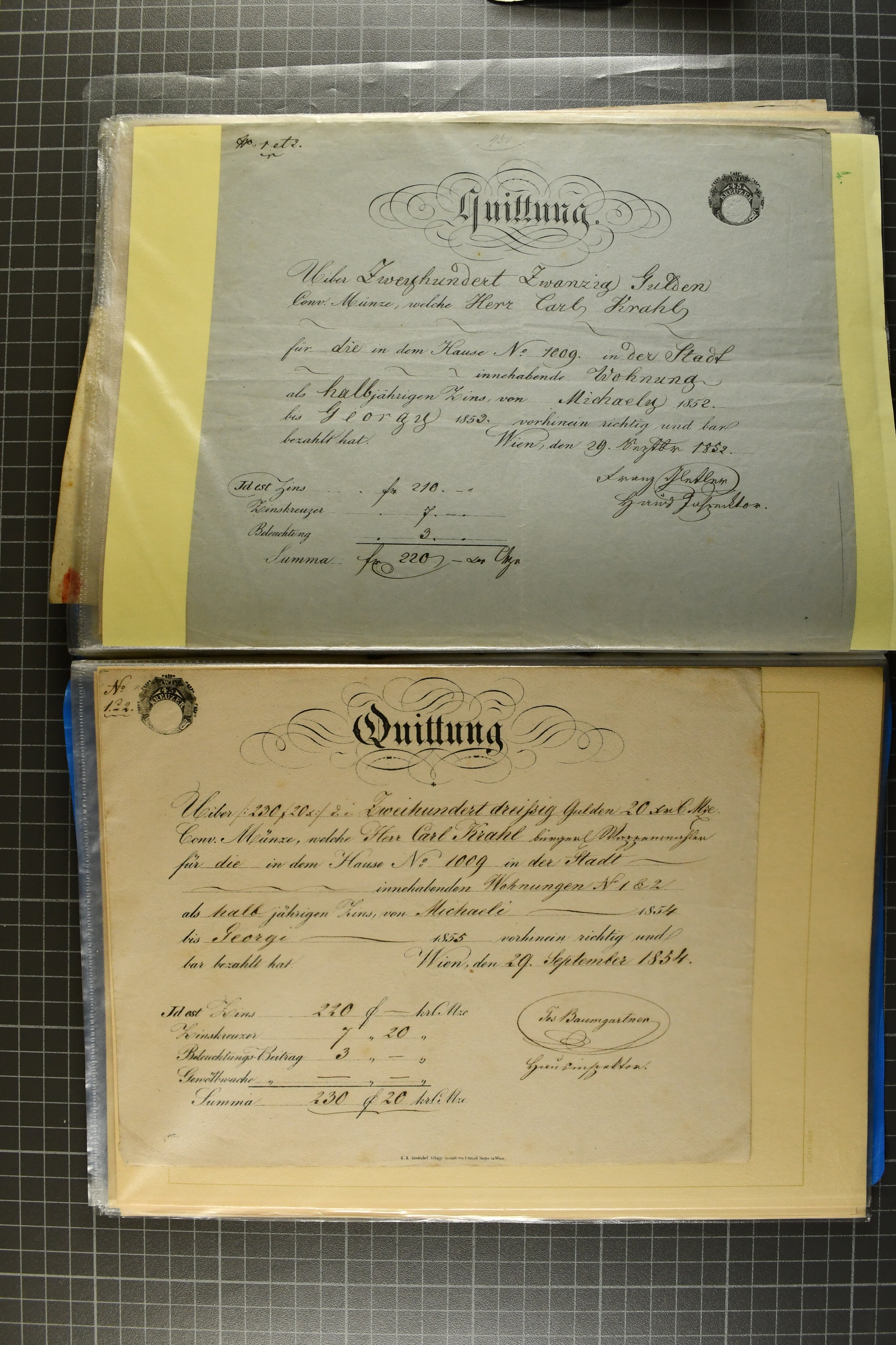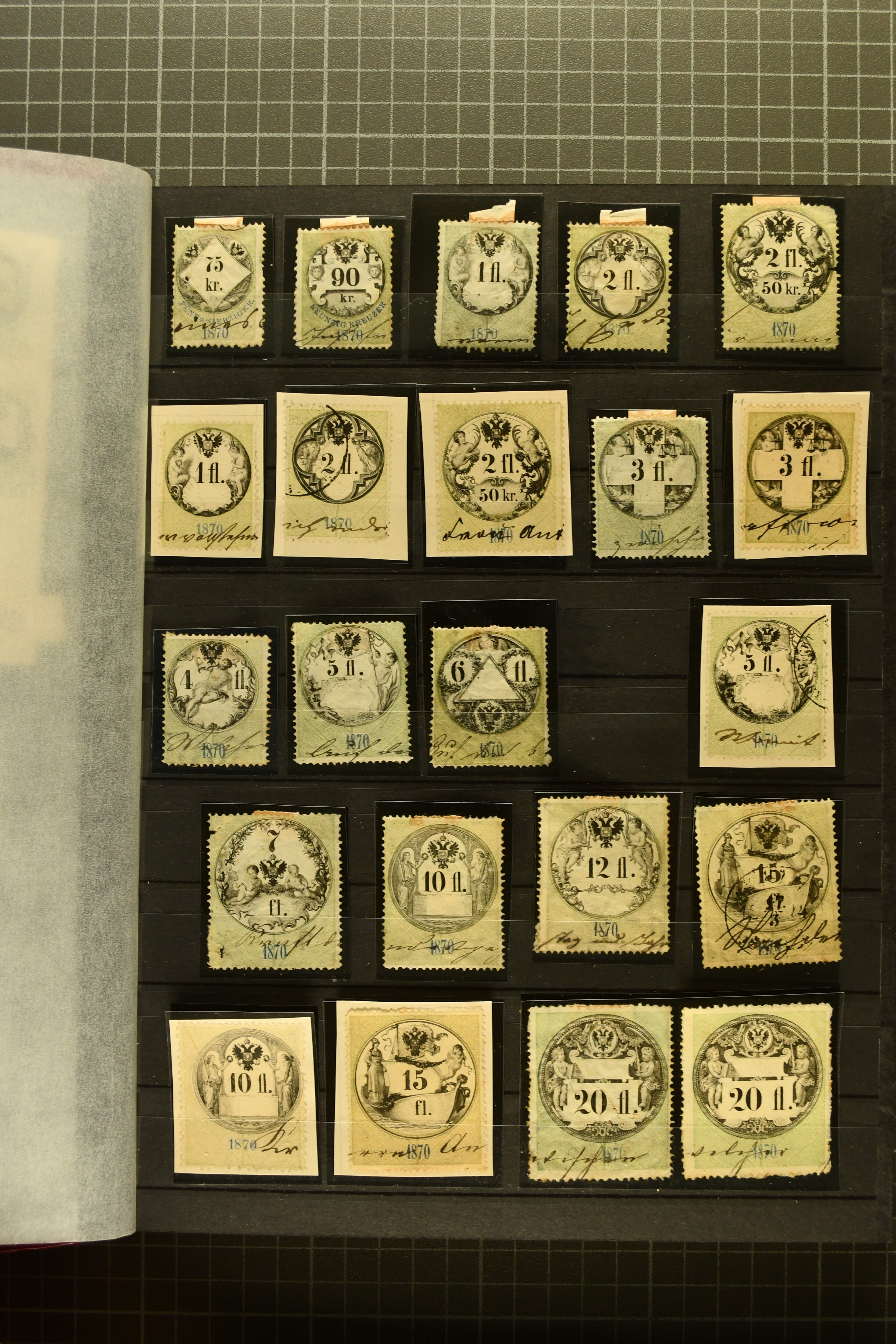 Gulden enthält. Zudem eine Sammlung von Ausschnitten, jeweils mit der Stempelmarke auf Blättern, einige vollständige Originalbelege sowie ein grossformatiges Einsteckbuch mit einer weiteren Sammlung verschiedenster Stempelmarken, oft mit hohen