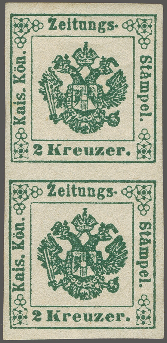 Zeitungsstempelmarken / Segnatasse per Giornali, 1853: 2 Kr. tiefgrün, Type Ib im farbintensiven und allseits breitrandigen senkrechten Paar, ungebraucht mit voller Originalgummierung mit der üblichen, leichten natürlichen