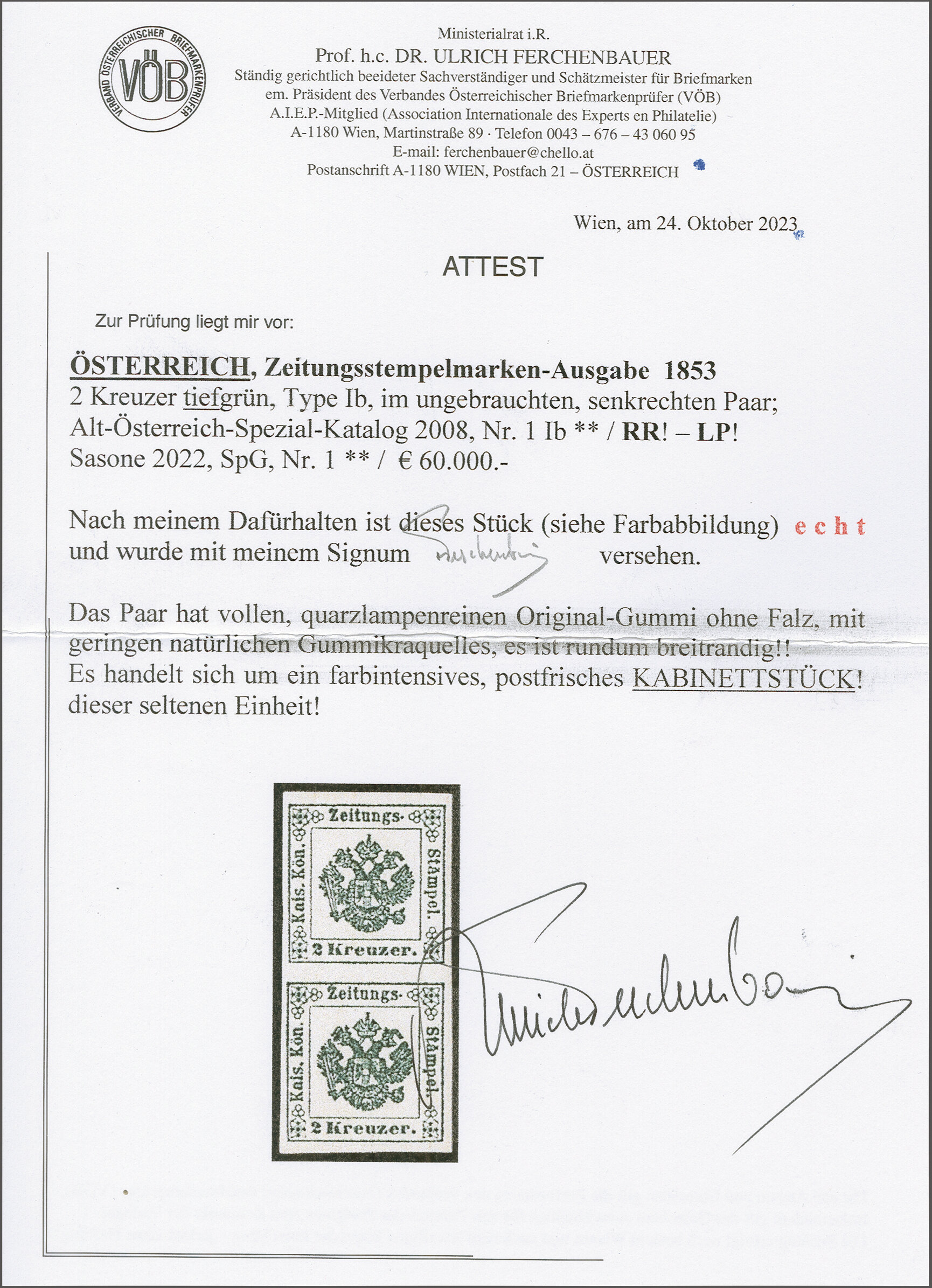 Krakelierung. Eine prächtige Einheit dieser seltenen Nuance in bestechend tiefen und kräftigen Farben; Attest Ferchenbauer (2022). Ferchenbauer = RR, LP / Sassone "verde scuro" = € 60'000. (Image 1)