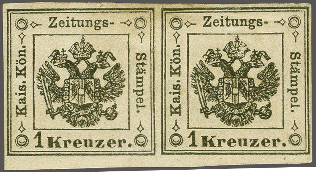 Zeitungsmarken für Lombardo-Veneto, 1859: 1 Kr. schwarz Type I, horizontales Paar, allseits voll- bis breitrandig mit vollem quarzlampenreinem Originalgummi. Eine frische attraktive Einheit in postfrischer Erhaltung, signiert