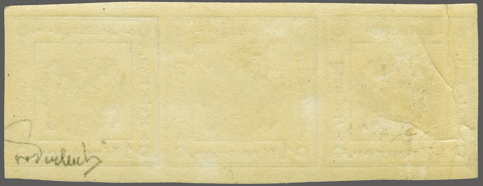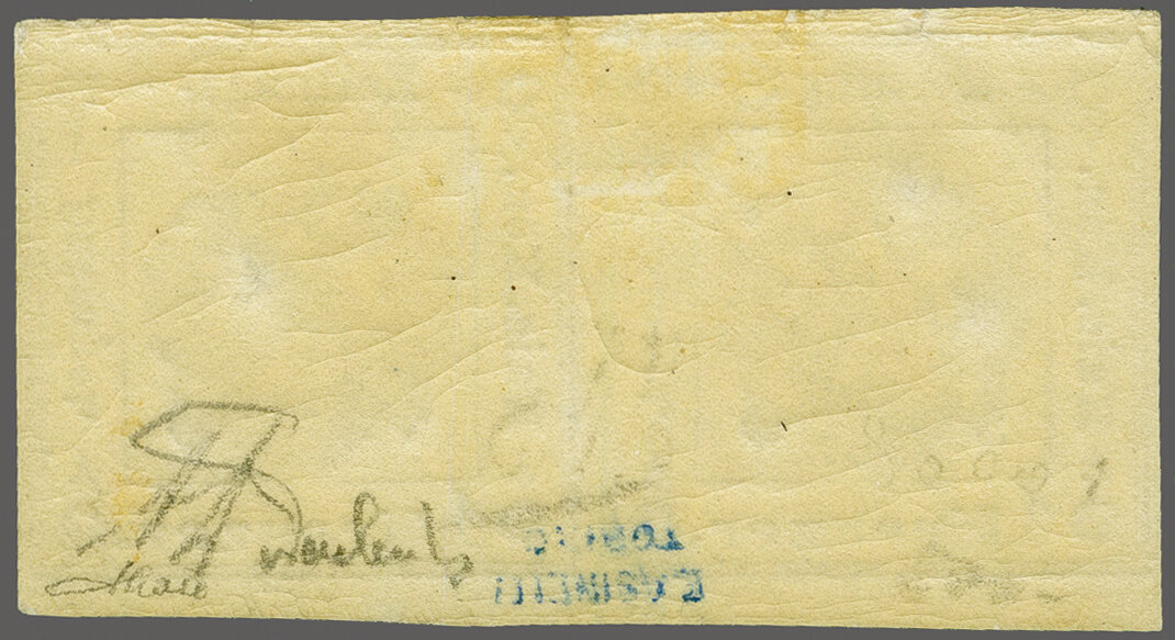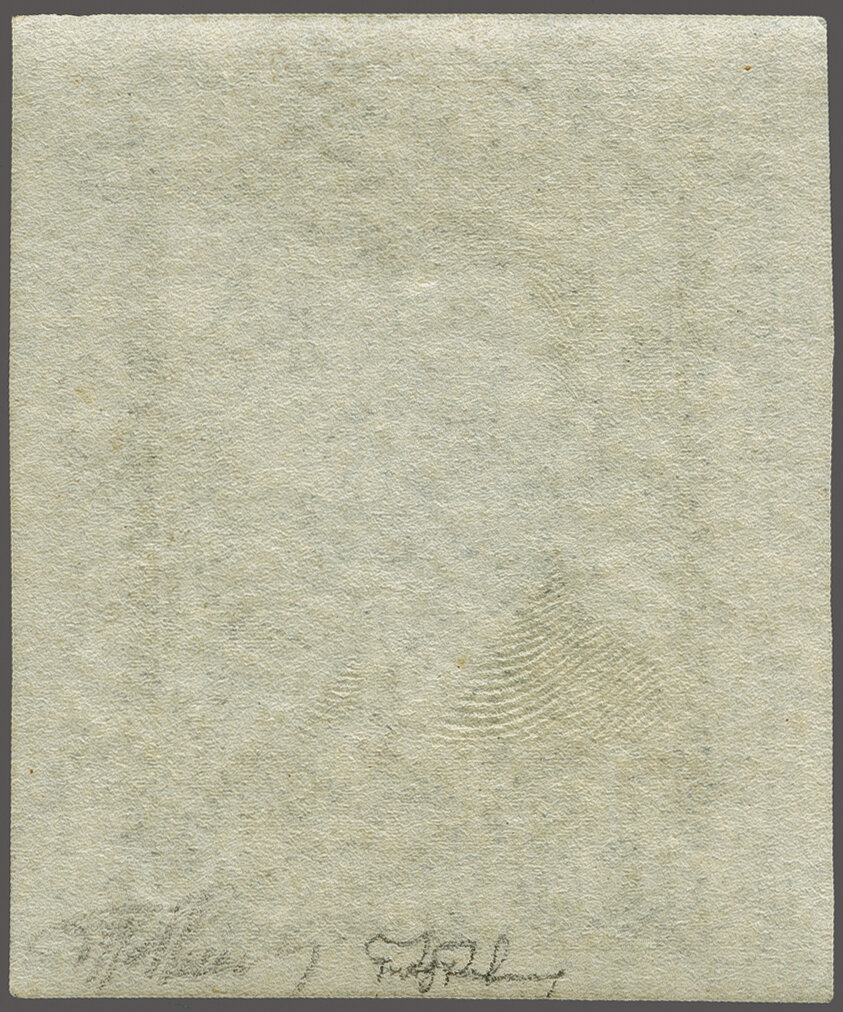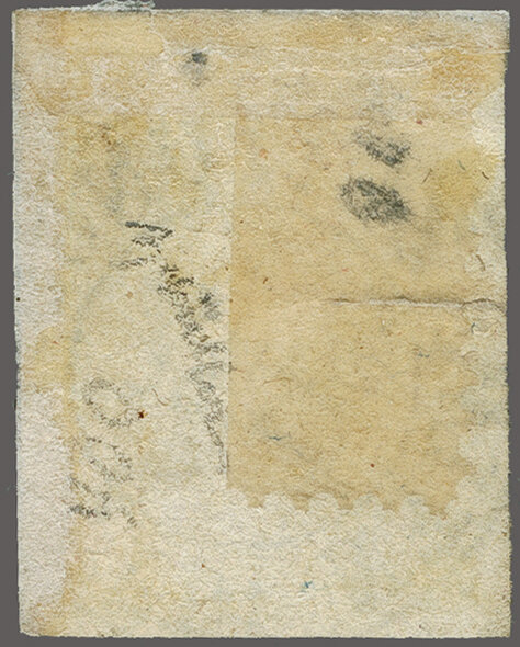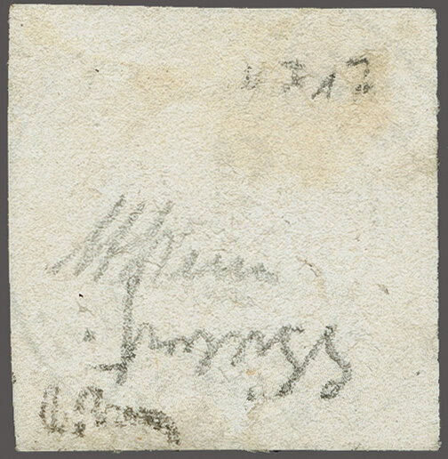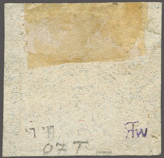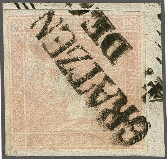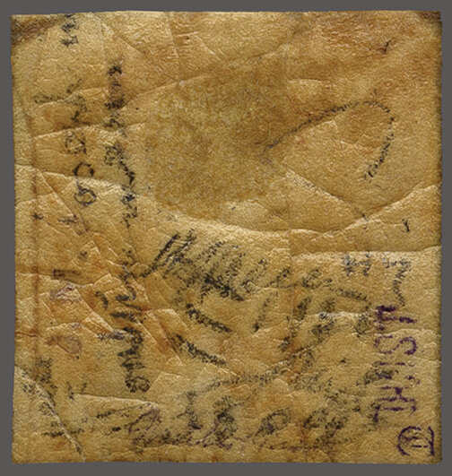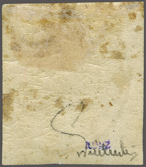 Lagerung verändert, an zwei Stellen etwas in das Papier diffundiert, dadurch auch mit bildseitig erkennbaren Beeinträchtigungen, eine extrem seltenen Marke. Ein besonders wirkungsvolles Stück dieser Weltrarität, das neben seinem guten Schnitt durch