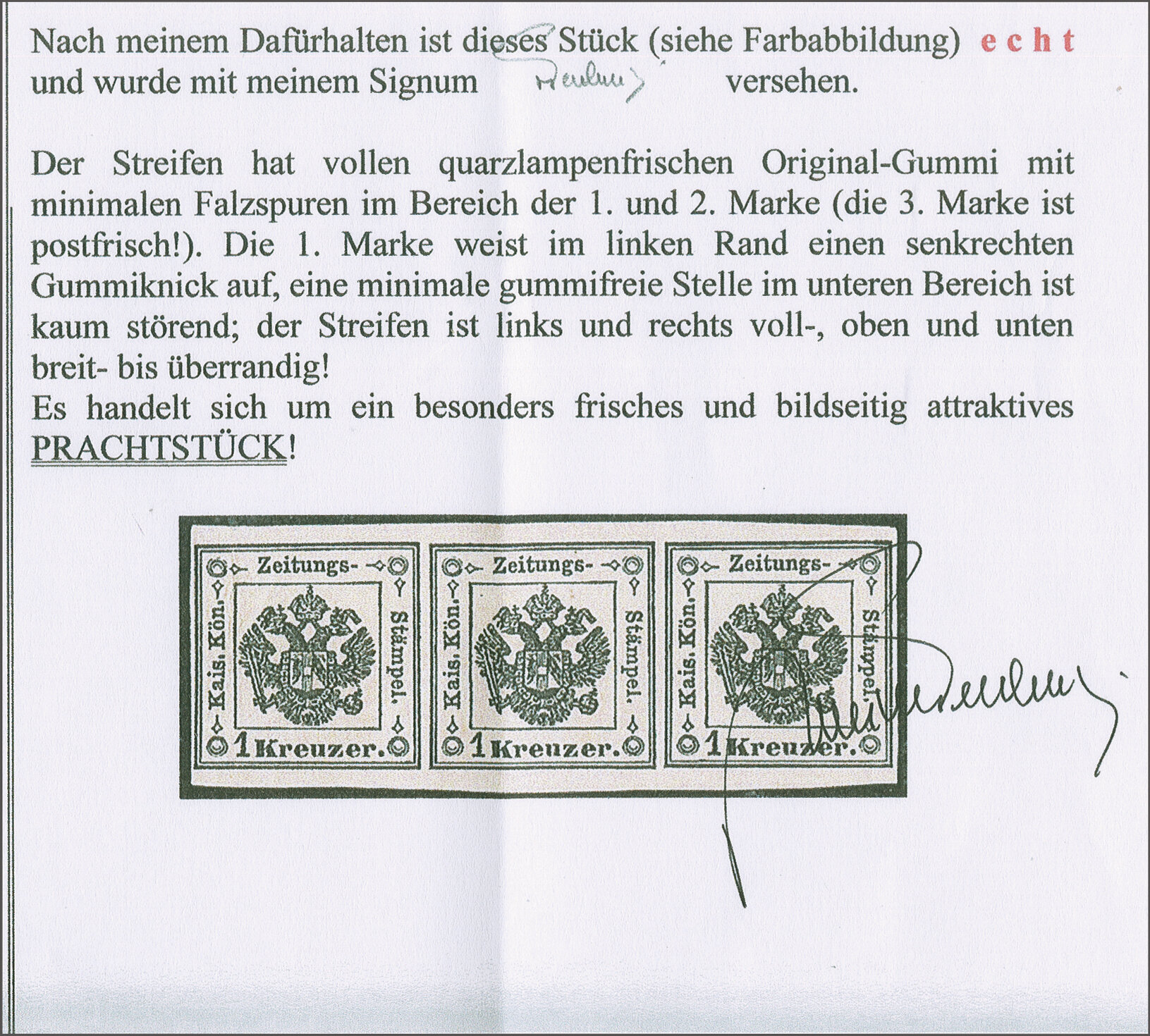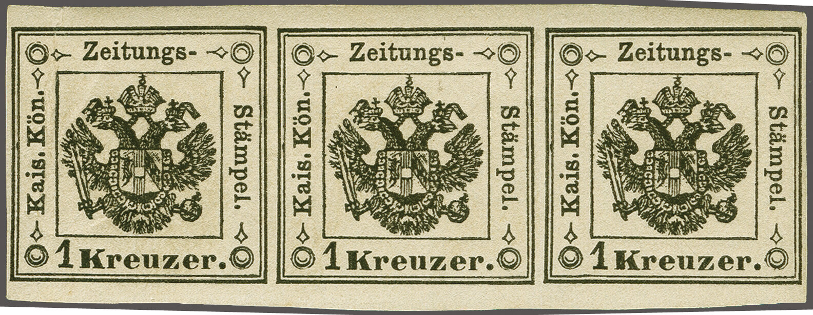 1859: 1 Kr. schwarz Type I im waagrechten Dreierstreifen, allseits voll- bis überrandig mit quarzlampenreinem Originalgummi, minimale Falzspuren im Bereich der beiden linken Marken und dort kl. Gummi-Unregelmässigkeiten, die