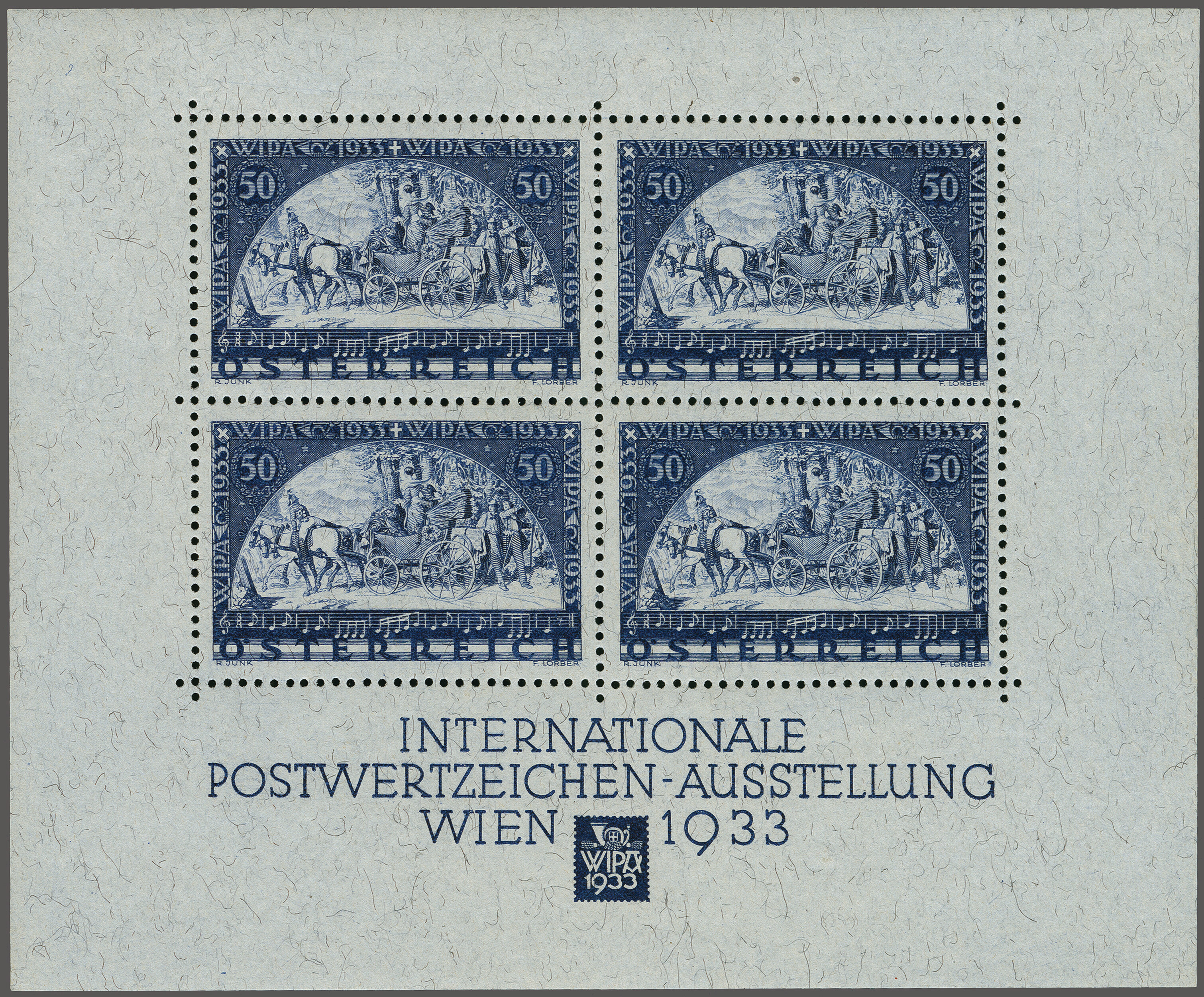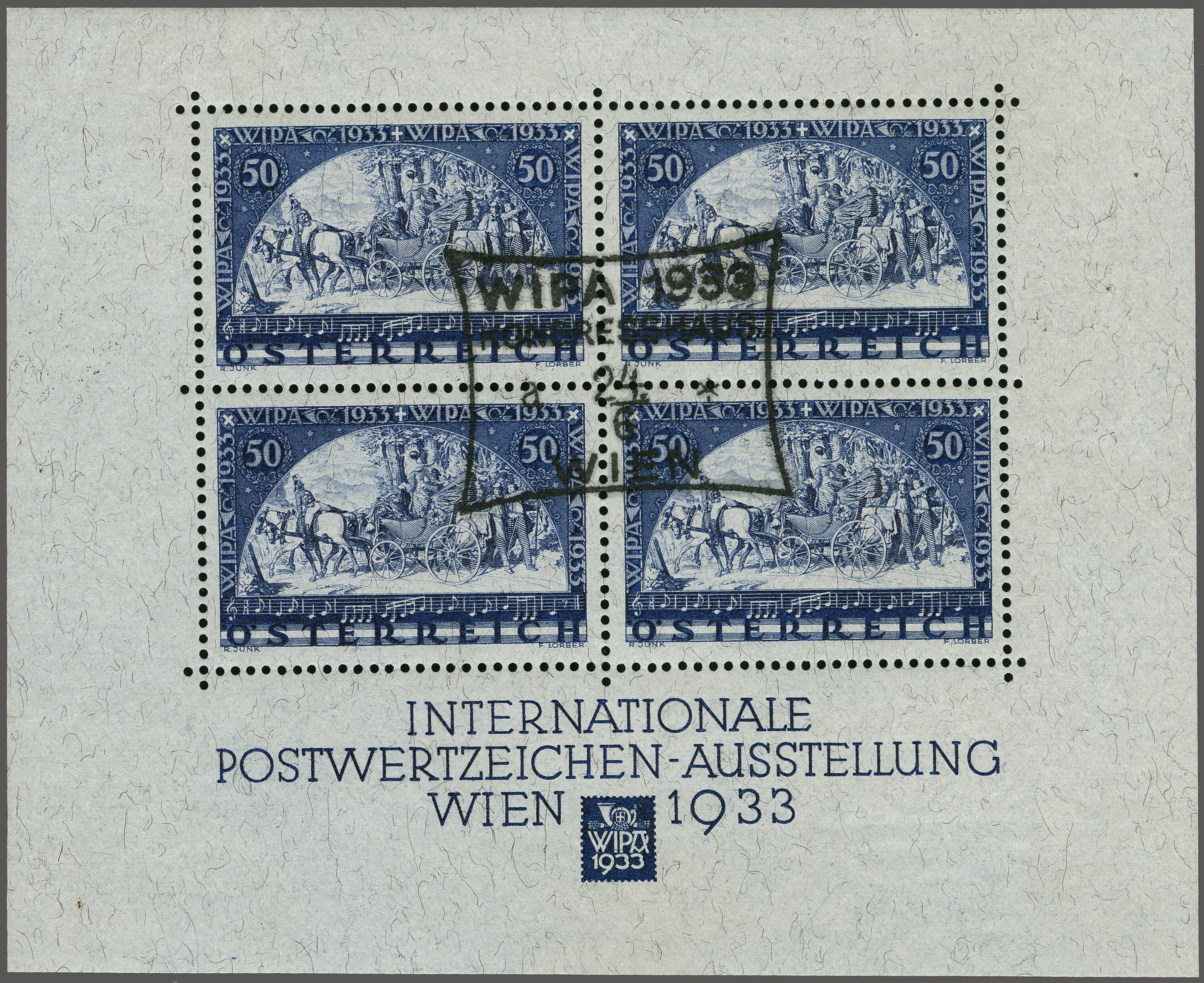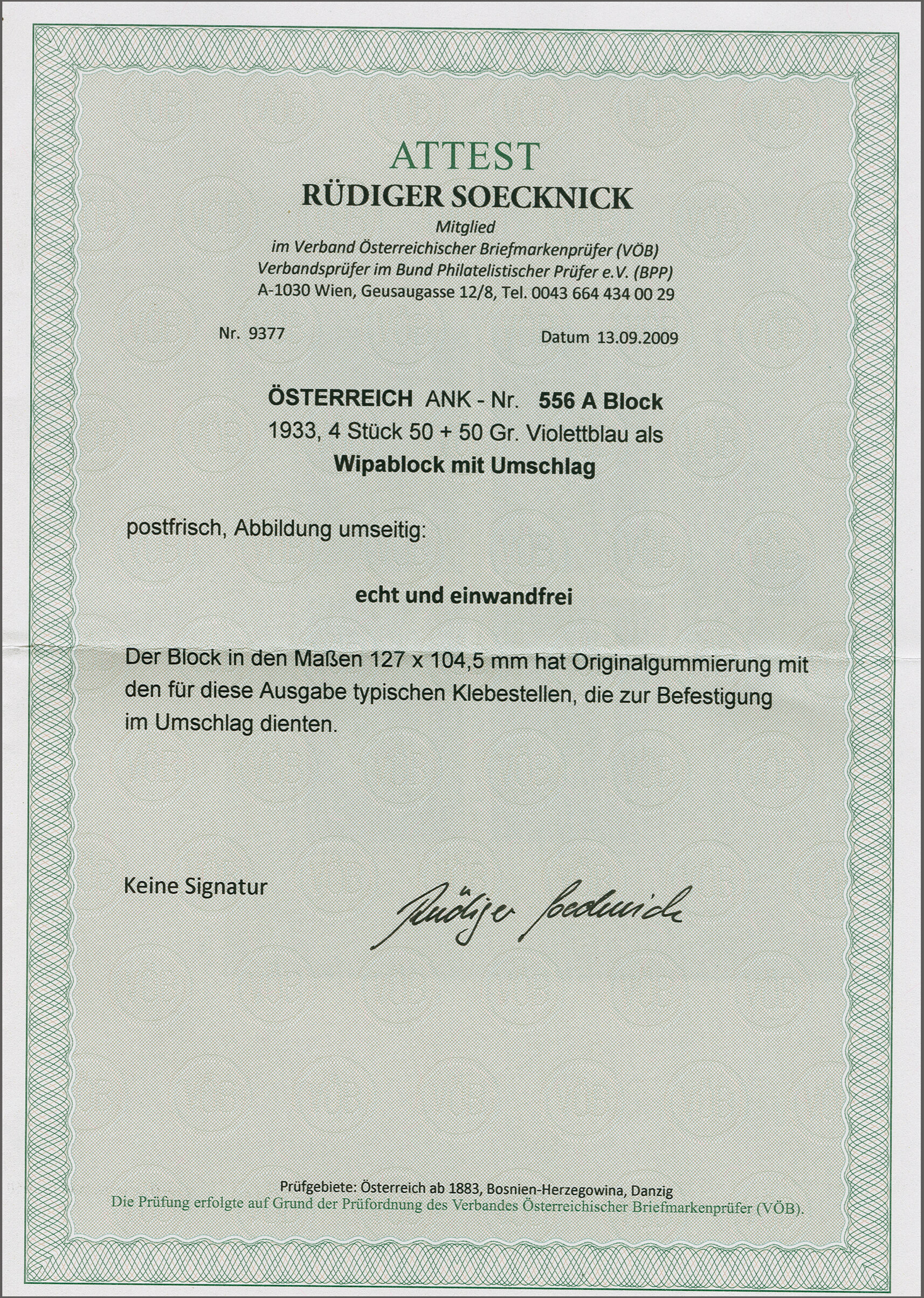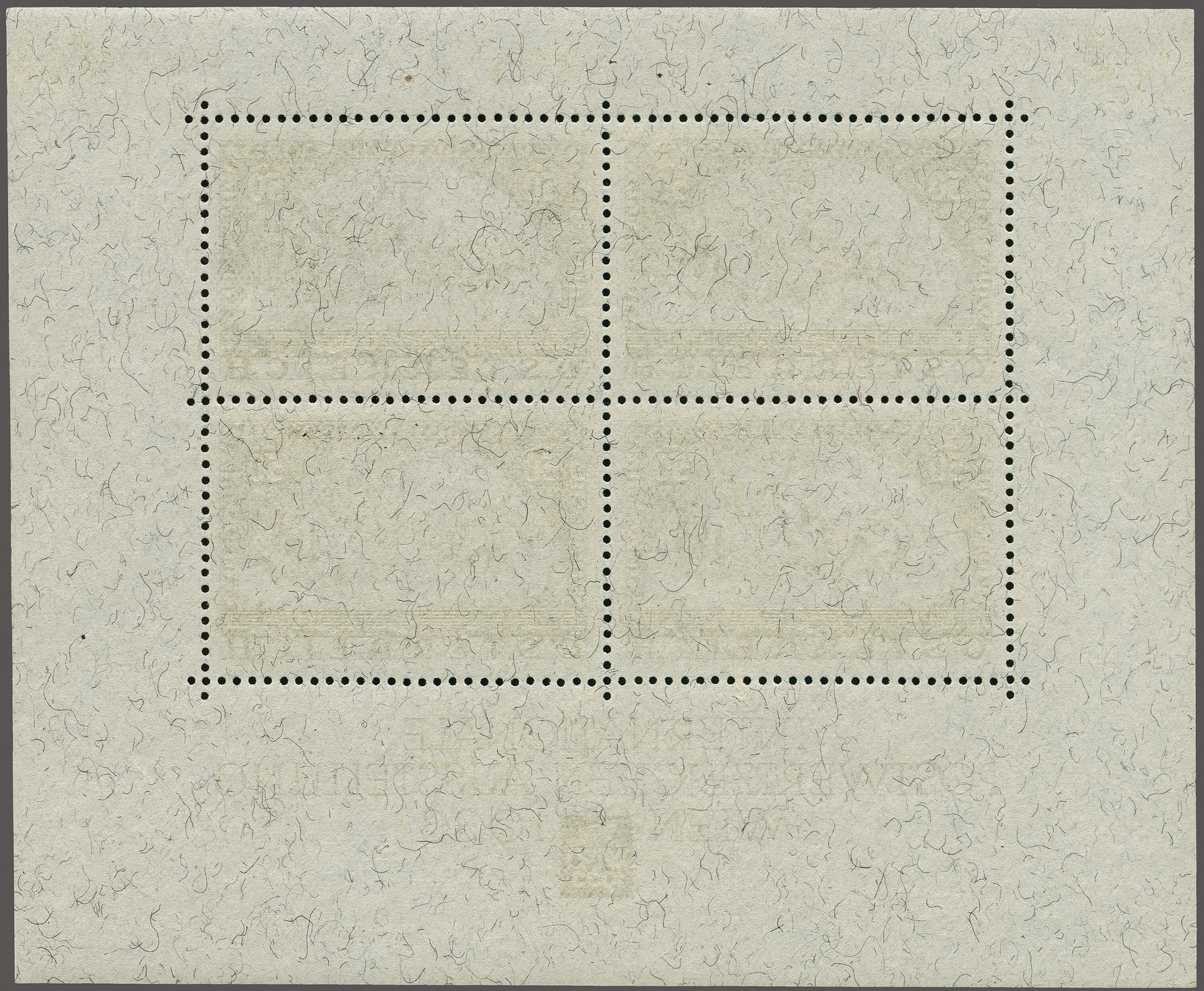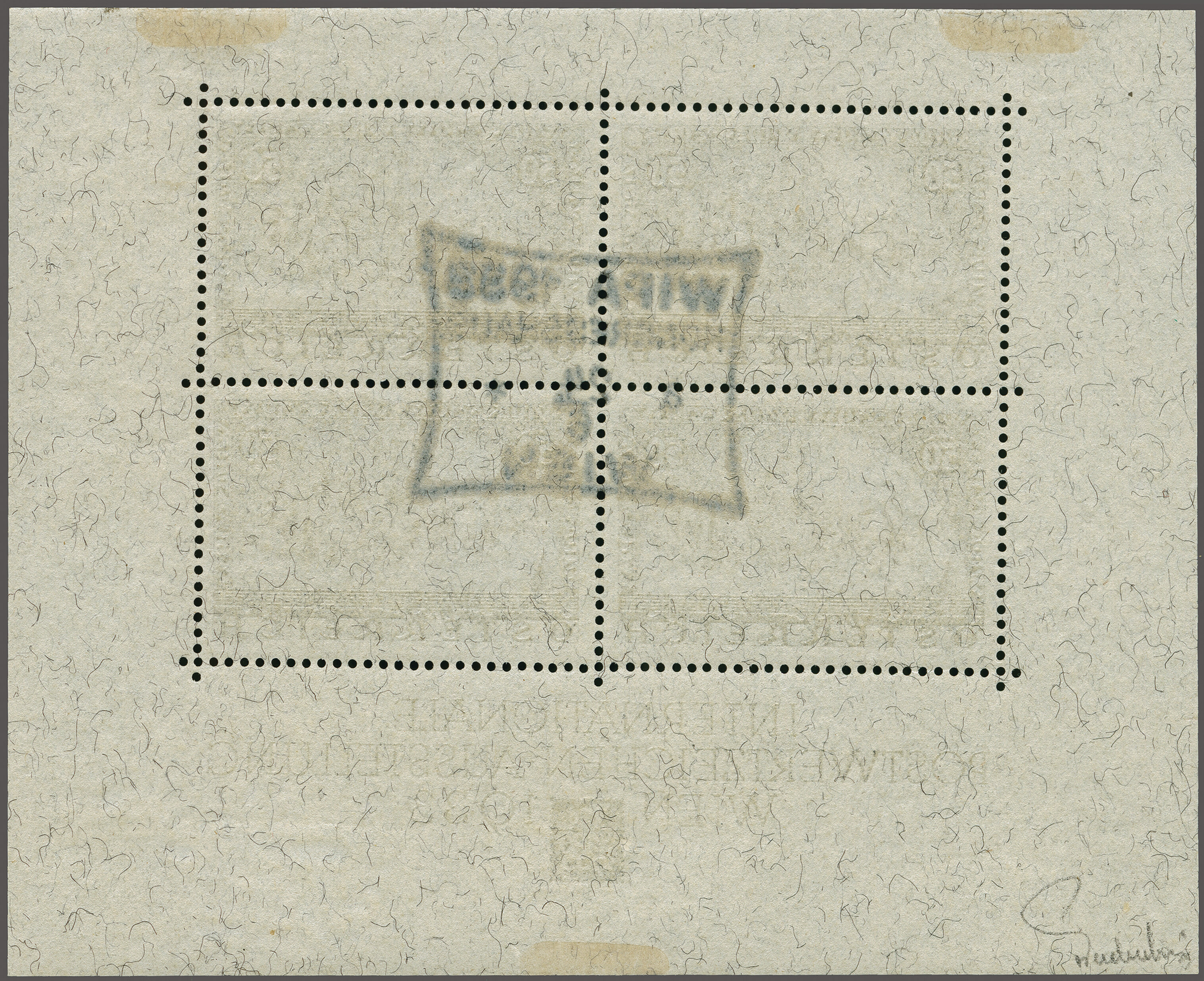 1933: WIPA-Block mit den Massen 127 : 104.5 mm, mit voller Originalgummi mit den üblichen Klebestellen im Rand, die zur Befestigung im Umschlag dienten, Originalumschlag anbei . Attest Soecknick (2009) Mi = € 3'600. (Image 1)