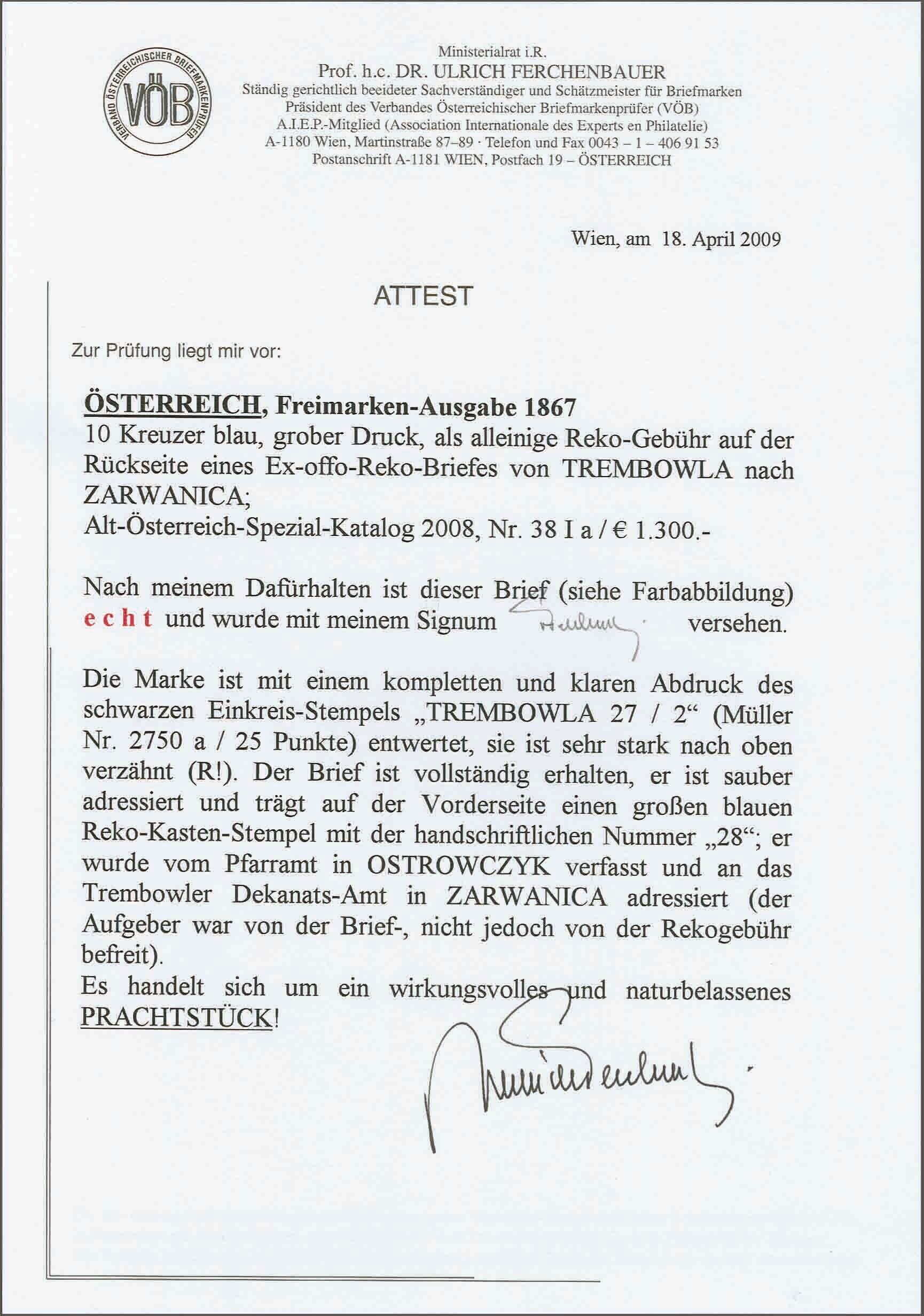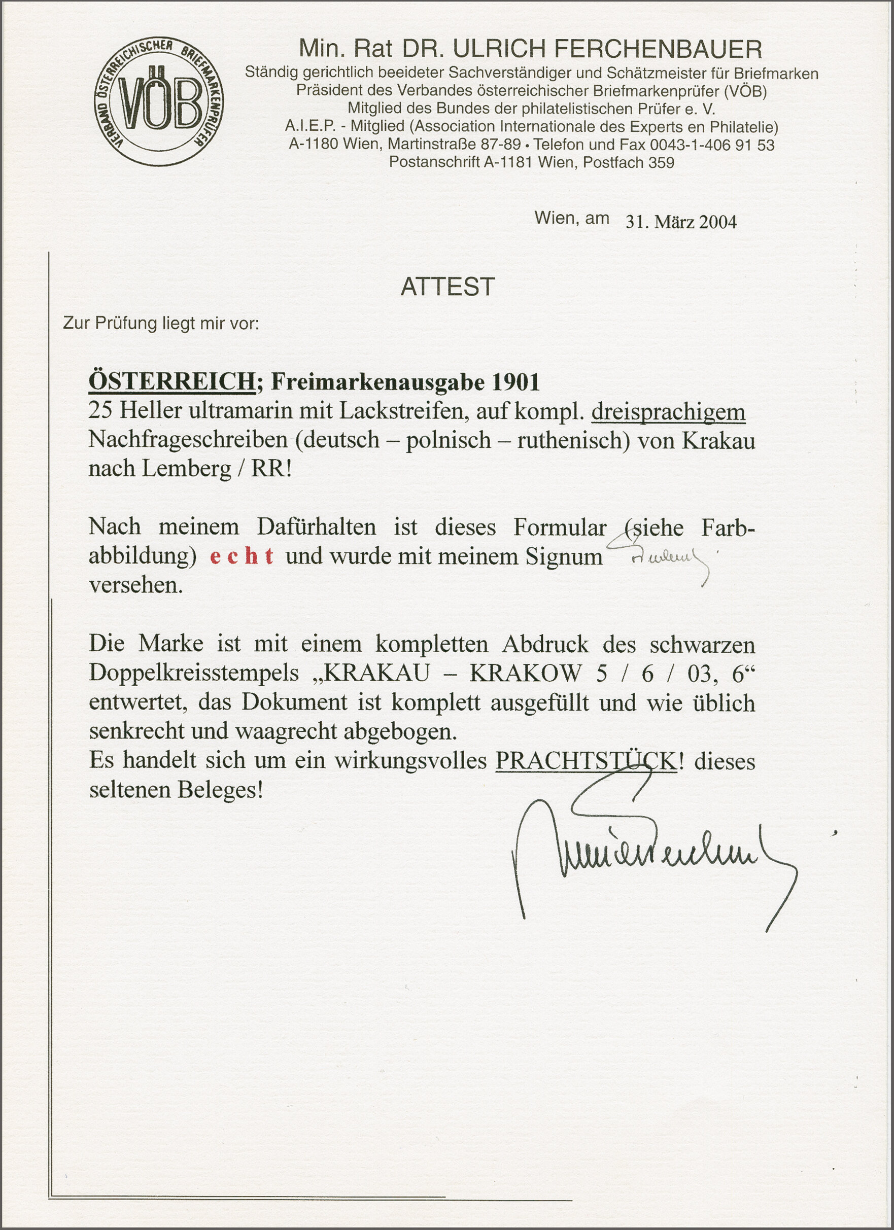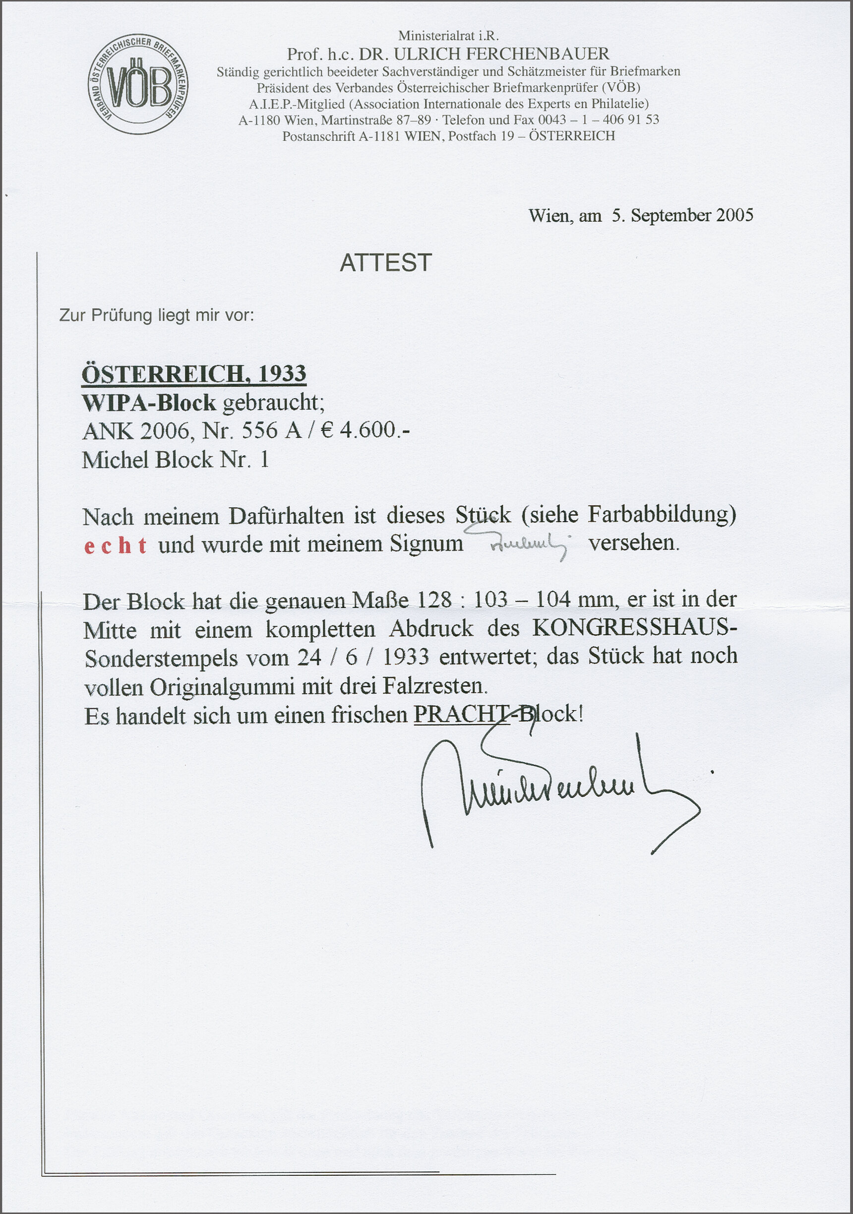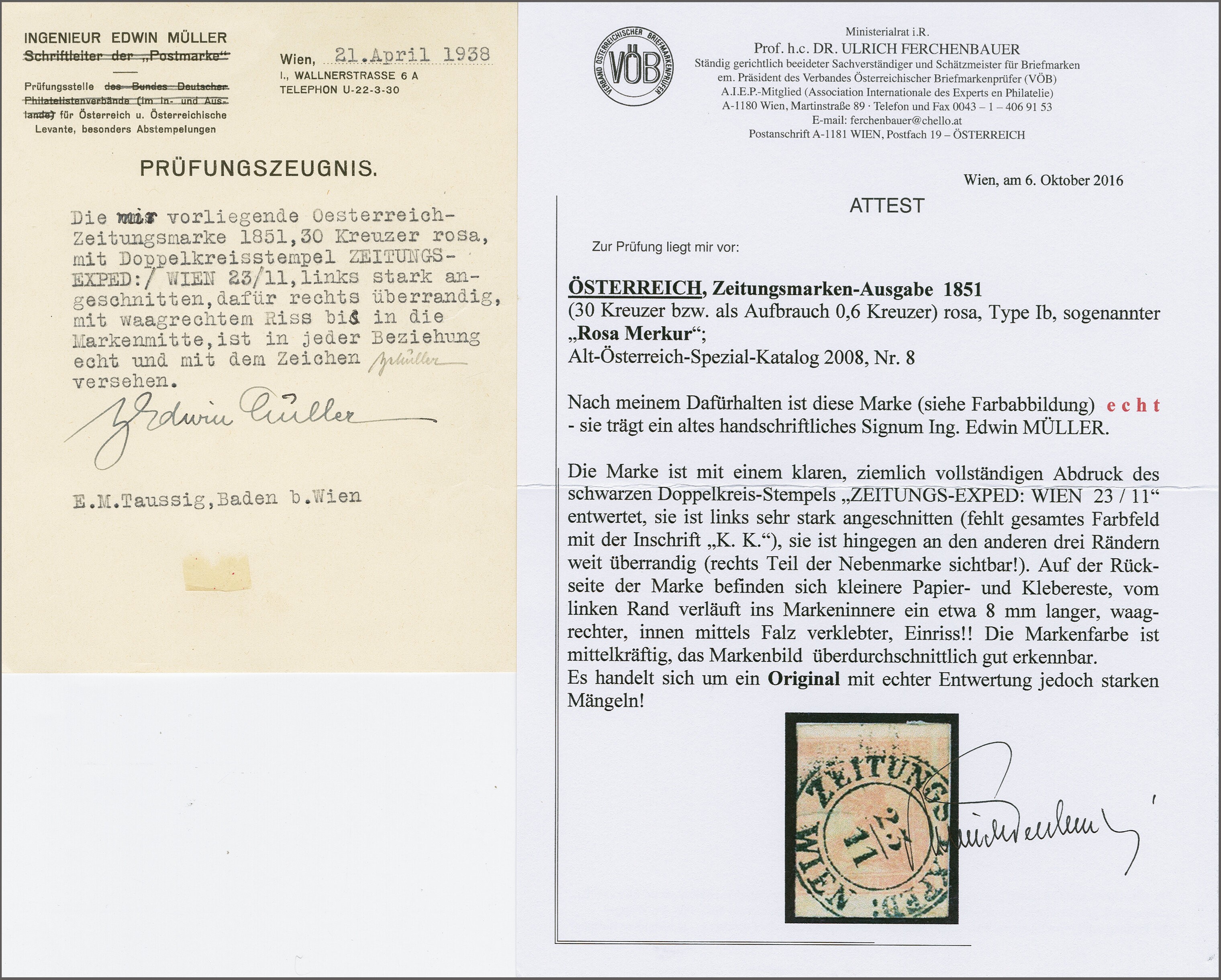 Attest Ferchenbauer (2016) Ferchenbauer = € 17'500. Bemerkung: Philatelie-geschichtlich ein höchst interessantes Attest, ausgestellt von Edwin Müller im April 1938 nach dem 'Anschluss' Österreichs an das Deutsche Reich im März 1938. Edwin Müller war