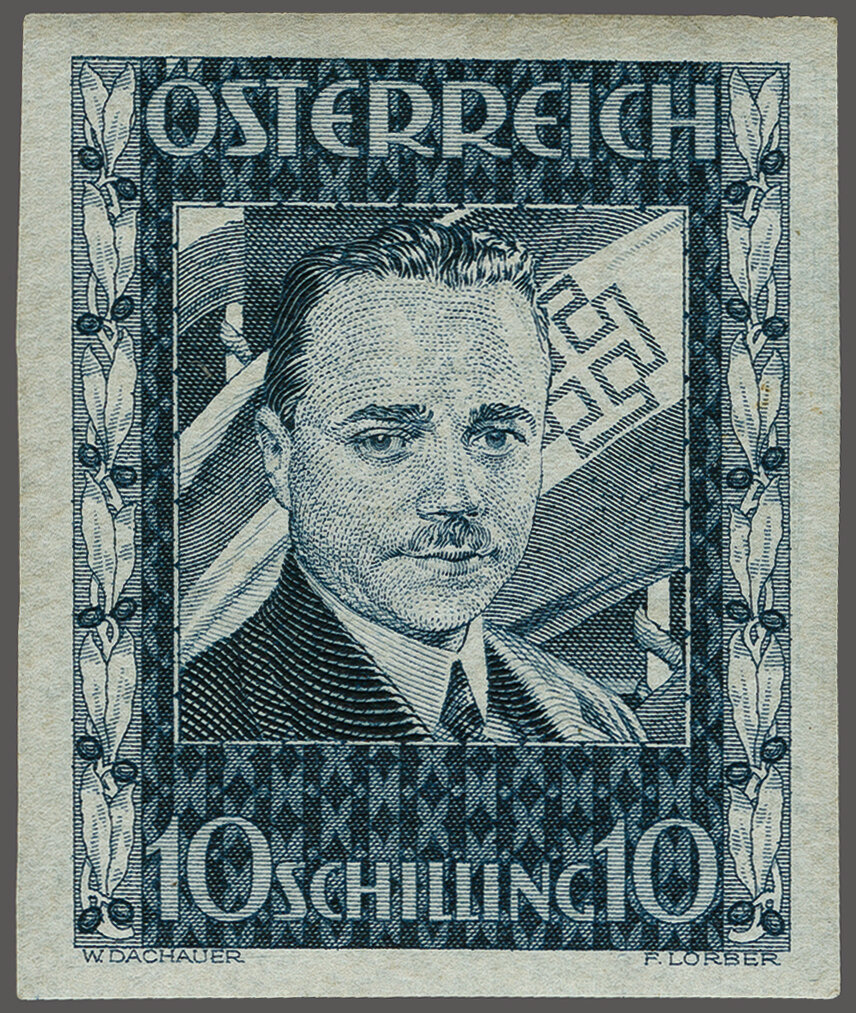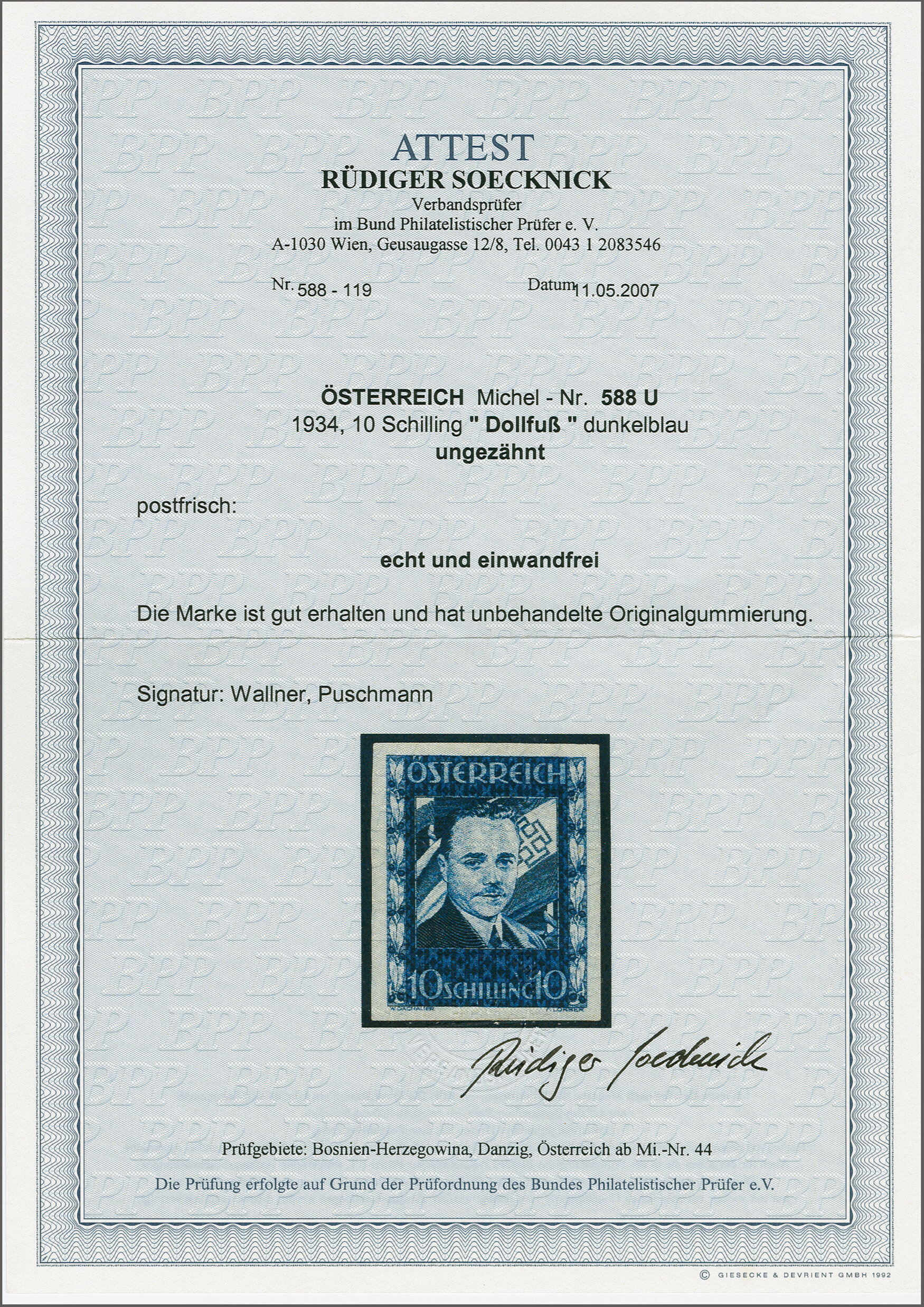 1936: Engelbert Dollfuss, 10 S. schwärzlichviolett / ultramarin, ungezähnt ohne Gummi, ein ebenmässig geschnittenes Prachtstück mit feinen Bleistiftsignaturen Wallner & Puschmann; Attest Soecknick (2007) Mi = € 5'000. (Image 1)