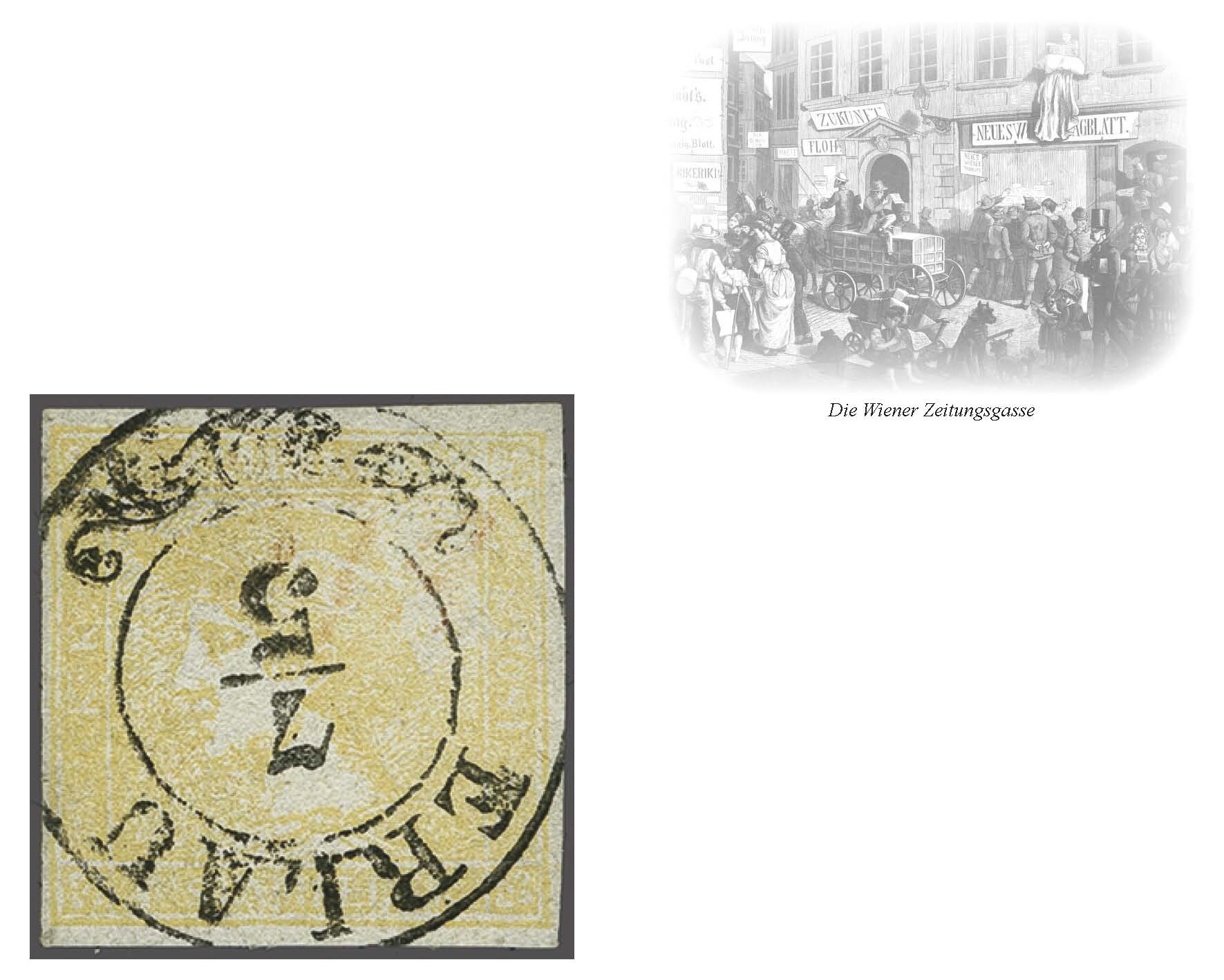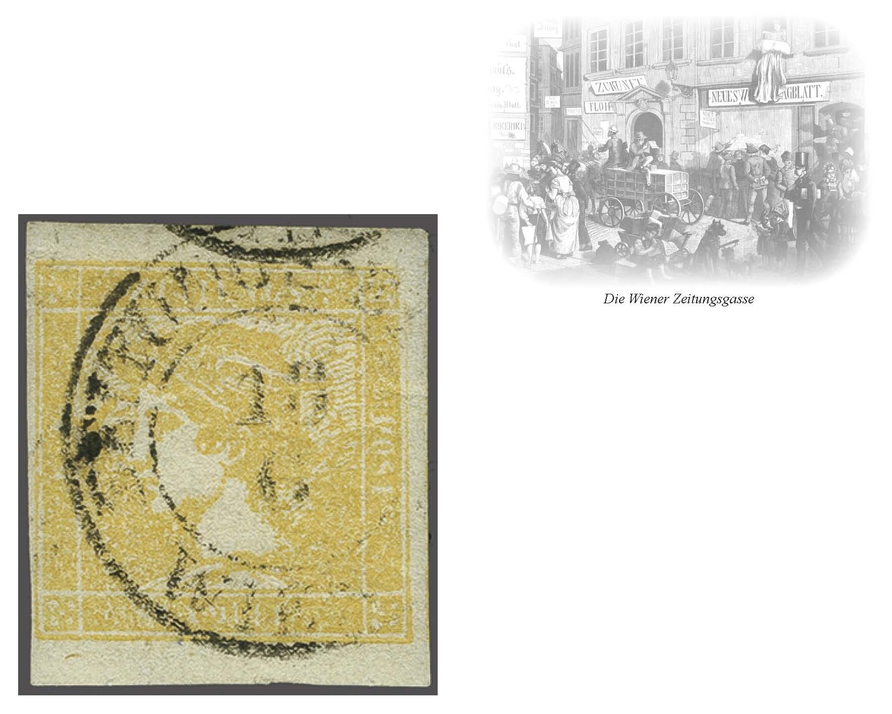 Einriss, rücks. gestützt), ideal klar entw. mit nahezu vollständigem Abschlag des Zweikreisstp. "ZEITUNGS-EXPED: WIEN 23 / 11". Ein trotz seiner Einschränkungen noch sammlungswürdiges Exemplar dieser Rarität, Prüfungszeugnis Edwin Müller (1938).