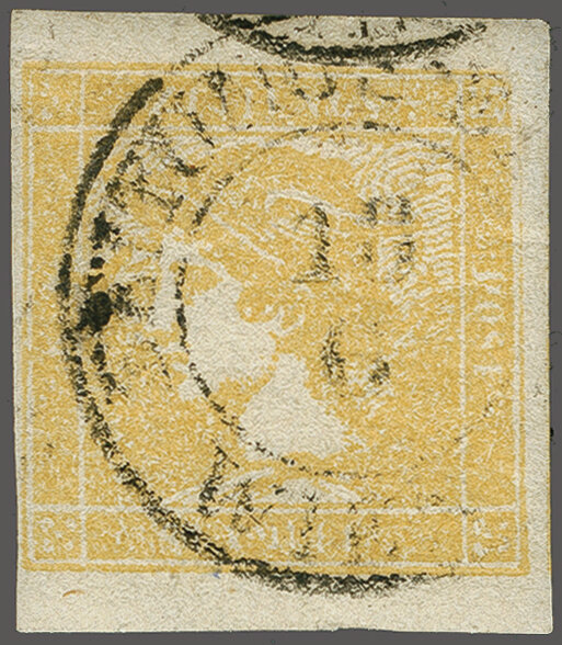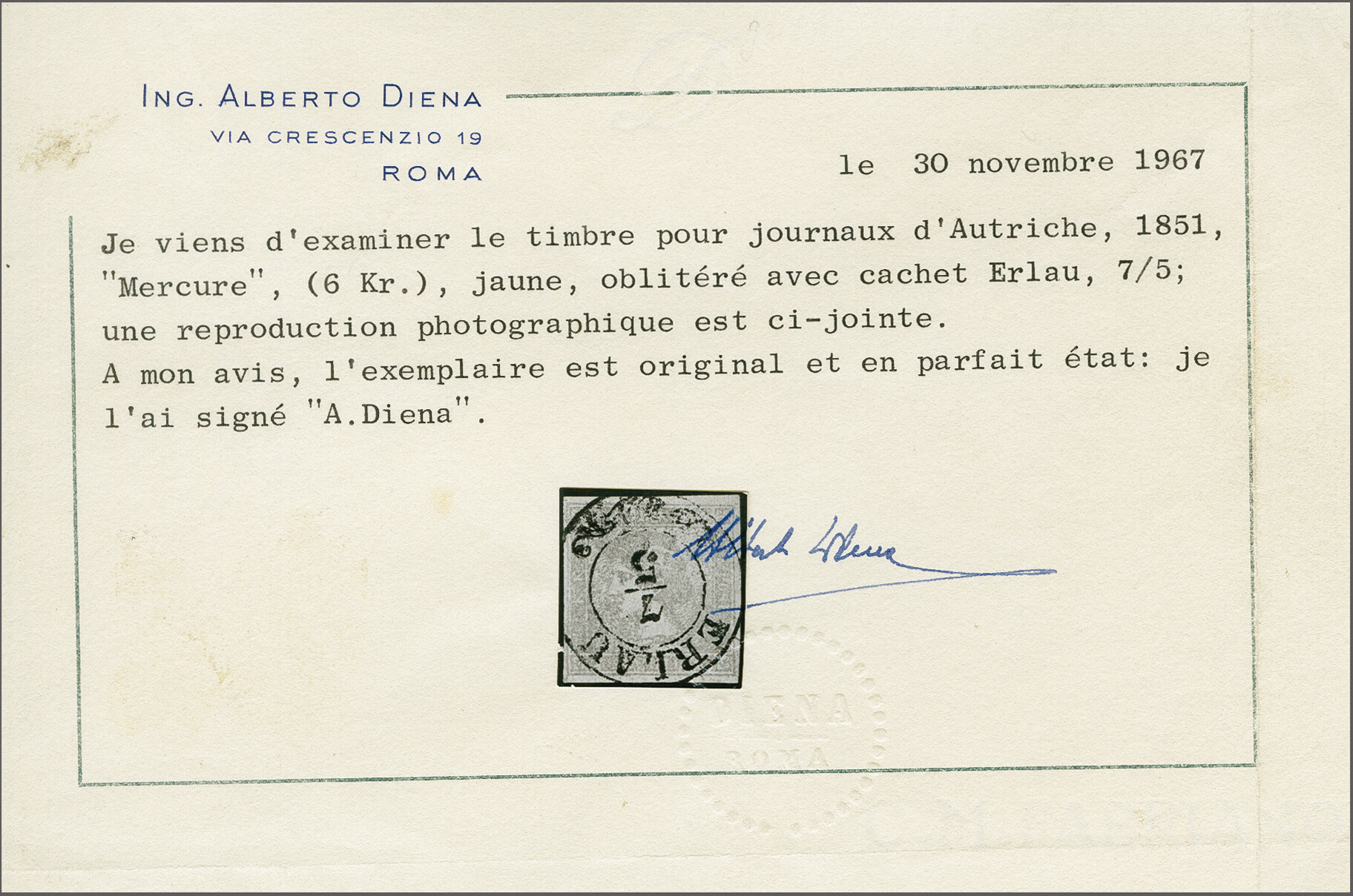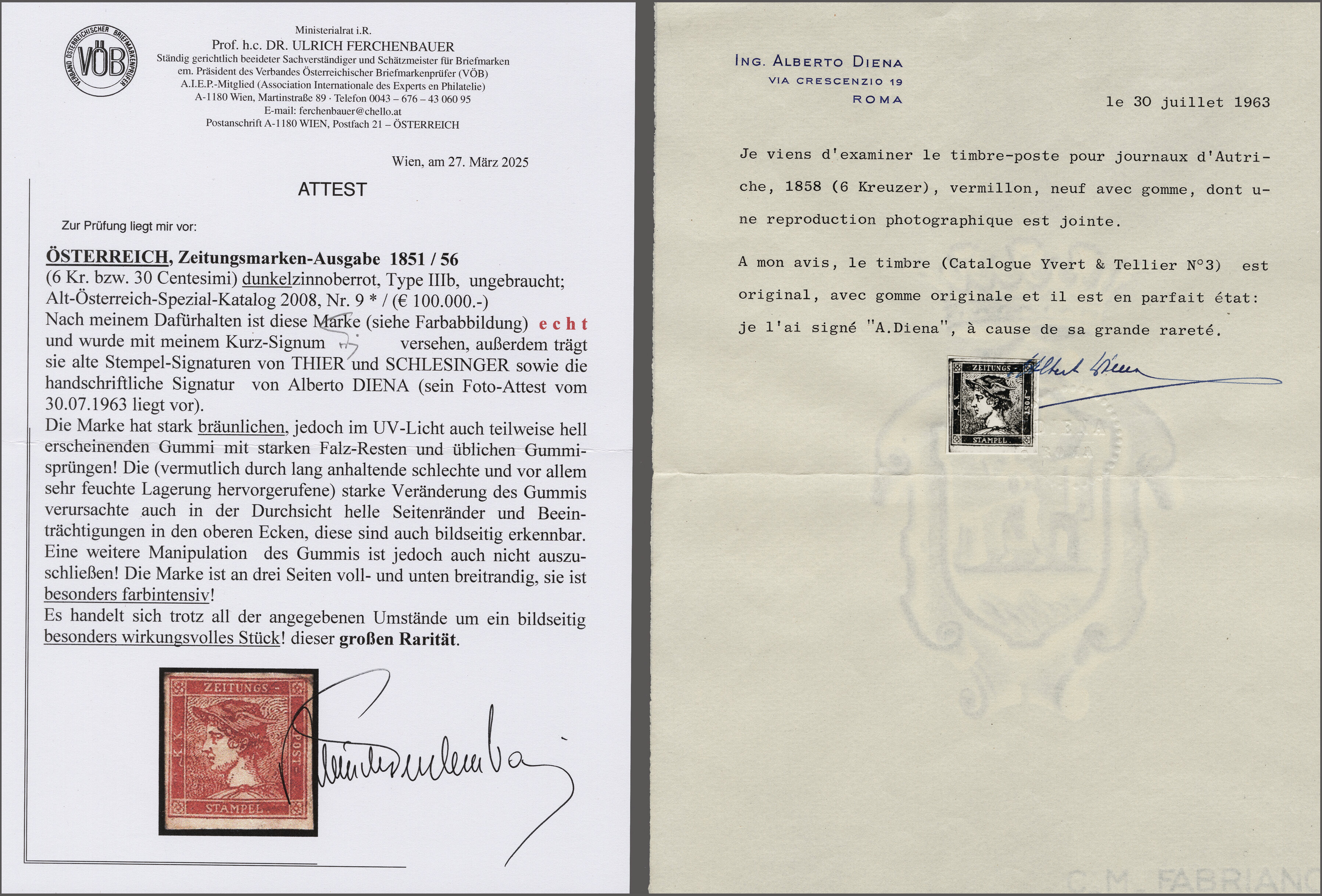 seine ausserordentliche Farbfrische besticht. Signiert Thier & Schlesinger; Atteste A. Diena (1963), Eichele (2006), Ferchenbauer (2025) Ferchenbauer = € 100'000 / Mi = € 80'000 / ANK 9 = 120'000 / Sassone G7 = € 330'000. (Image 1)