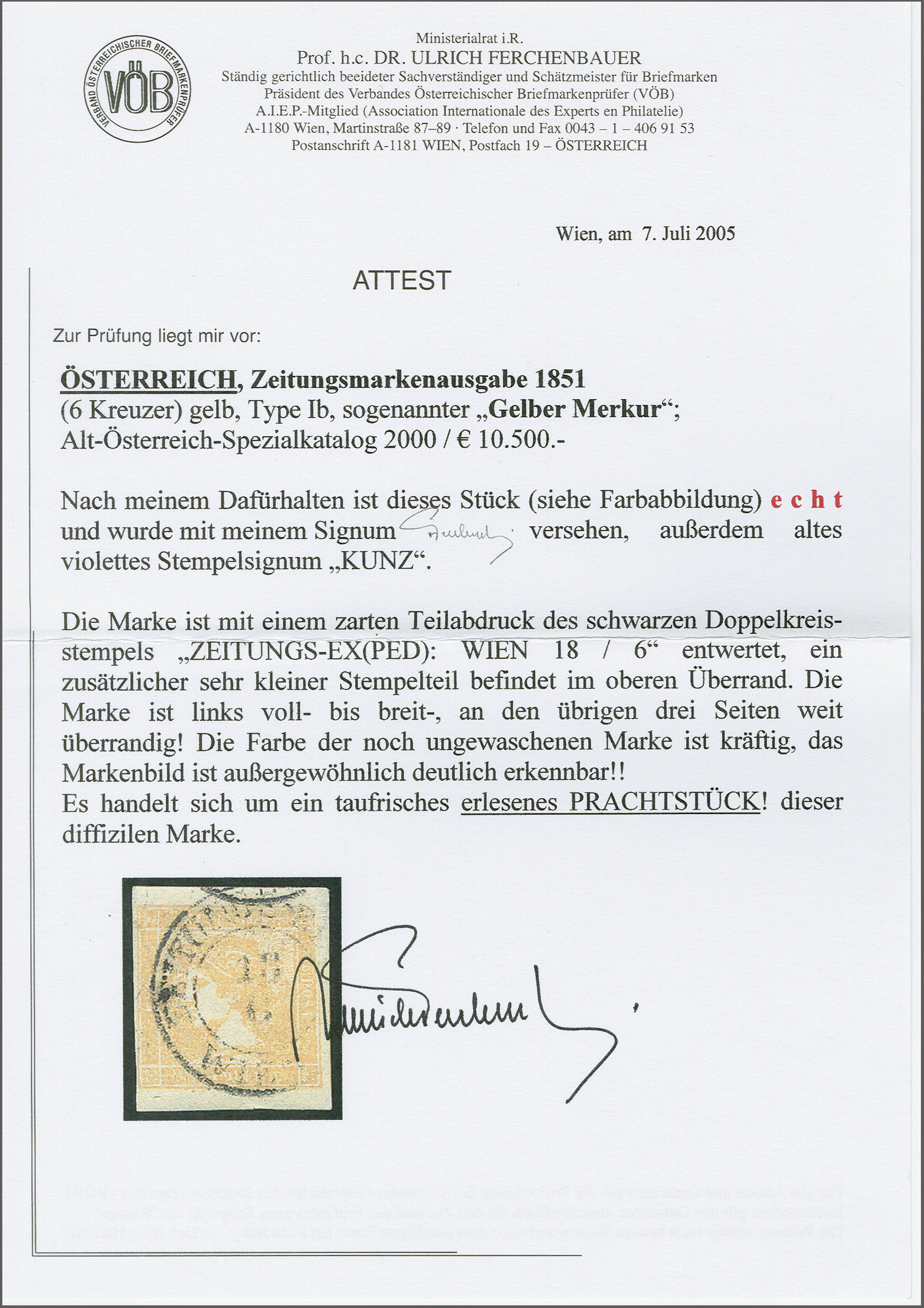 Zeitungsmarke Gelber Merkur (6 Kr.) Type Ib in kräftiger Farbe und mit deutlich erkennbarem Markenbild, links vollrandig, sonst überrandig, zentr. entw. „ZEITUNGS-EX(PED): WIEN 18 / 6". Ein erlesenes Prachtstück dieser