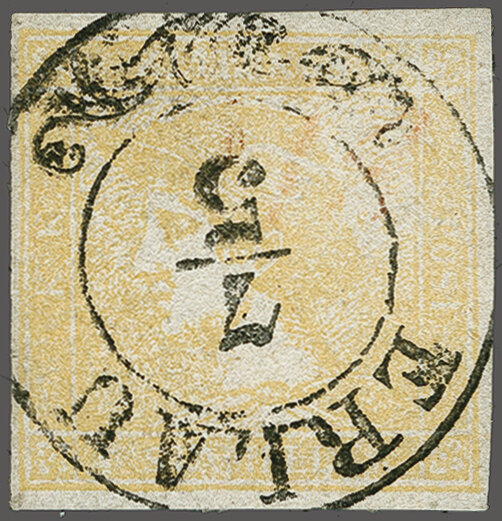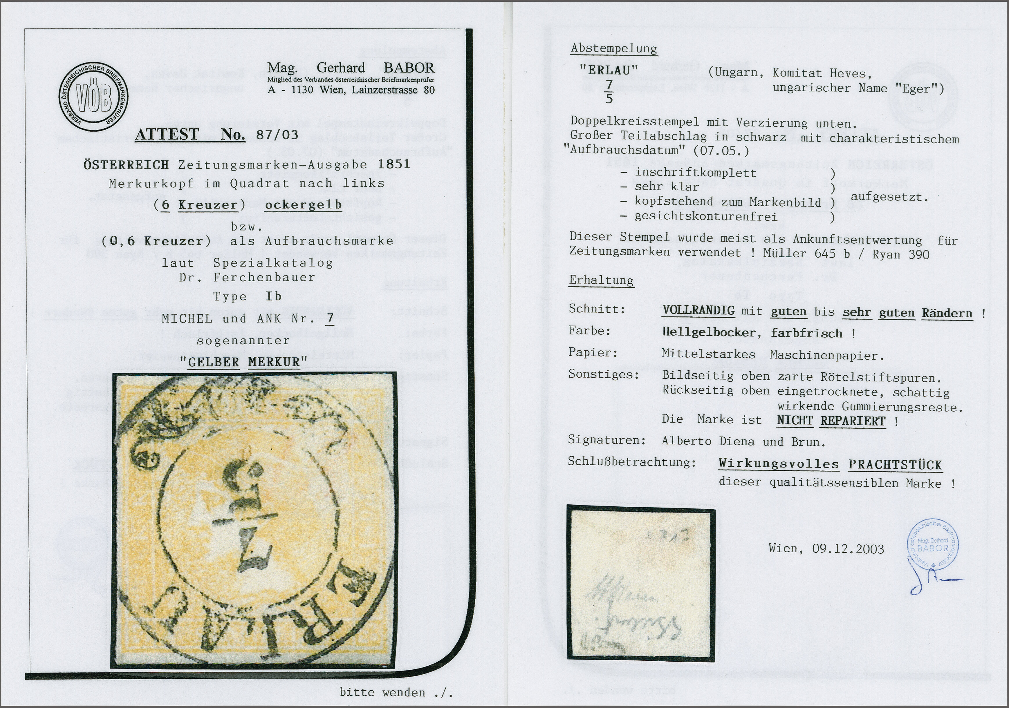 Zeitungsmarke Gelber Merkur (6 Kr.) ockergelb Type Ib, sehr klar und voll- bis überrandig geschnitten, klar, dekorativ und kopfstehend zum Markenbild aufgesetzt entw. mit schwarzem Doppelkreisstp. "ERLAU 7 / 5" (Müller 645b).