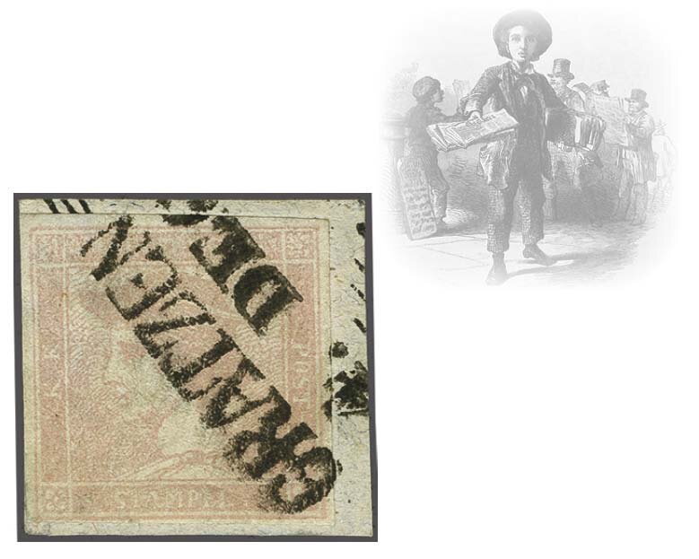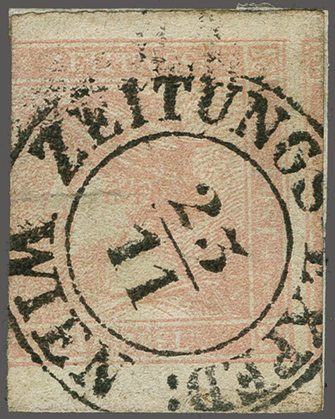 Zeitungsmarke Rosa Merkur (30 Kr.) rosa, Type Ib auf kl. Briefstück, voll bis überrandig geschnitten, sehr sauber entw. mit Zweizeiler "GRATZEN / 4. DEC" (Müller 850a) auf kleinem Zeitungsschleifen-Ausschnitt. Attest Kimmel