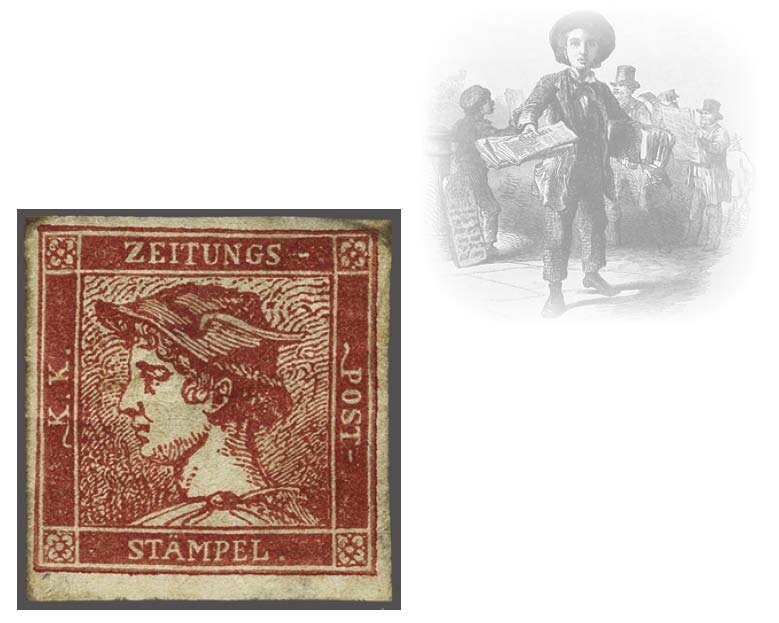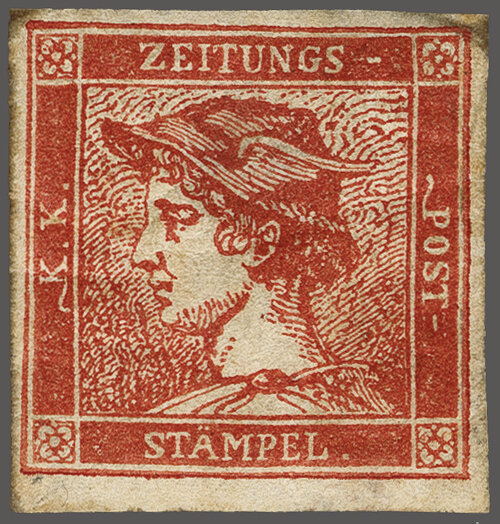 Zeitungsmarke Zinnoberroter Merkur (6 Kr. / 30 C.) in Type IIIb, farbintensiv in der dunklen Nuance und breit bis sehr breit gerandet, ein ungebrauchtes Stück, der Gummi mit den üblichen Krakelierungen, dieser durch schlechte