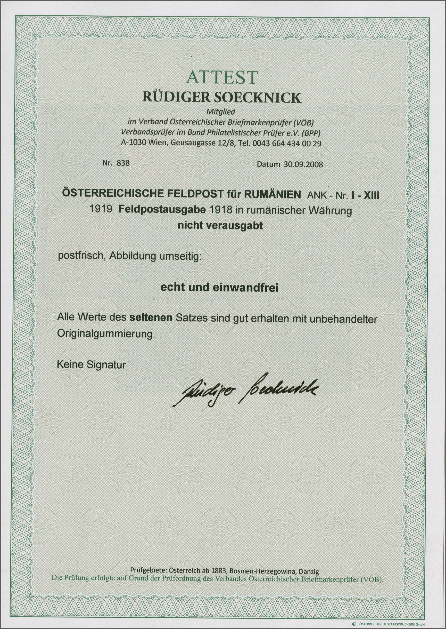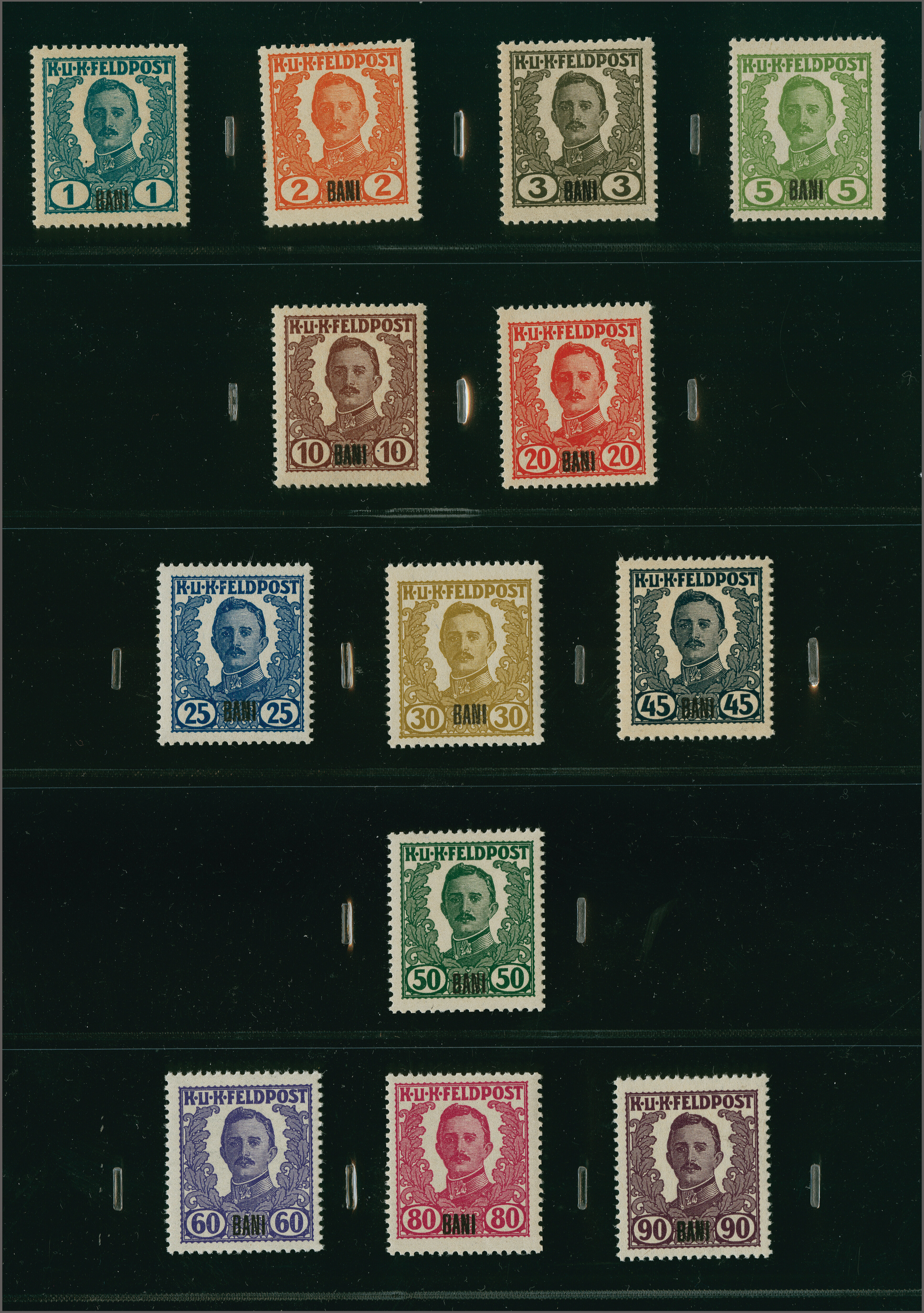 Feldpostmarken, 1918: Österreichische Feldpost für Rumänien, nicht verausgabter, kompletter Satz zu 13 Werten in postfrischer Erhaltung. Attest Soecknick (2008) Mi = € 4'300. (Image 1)