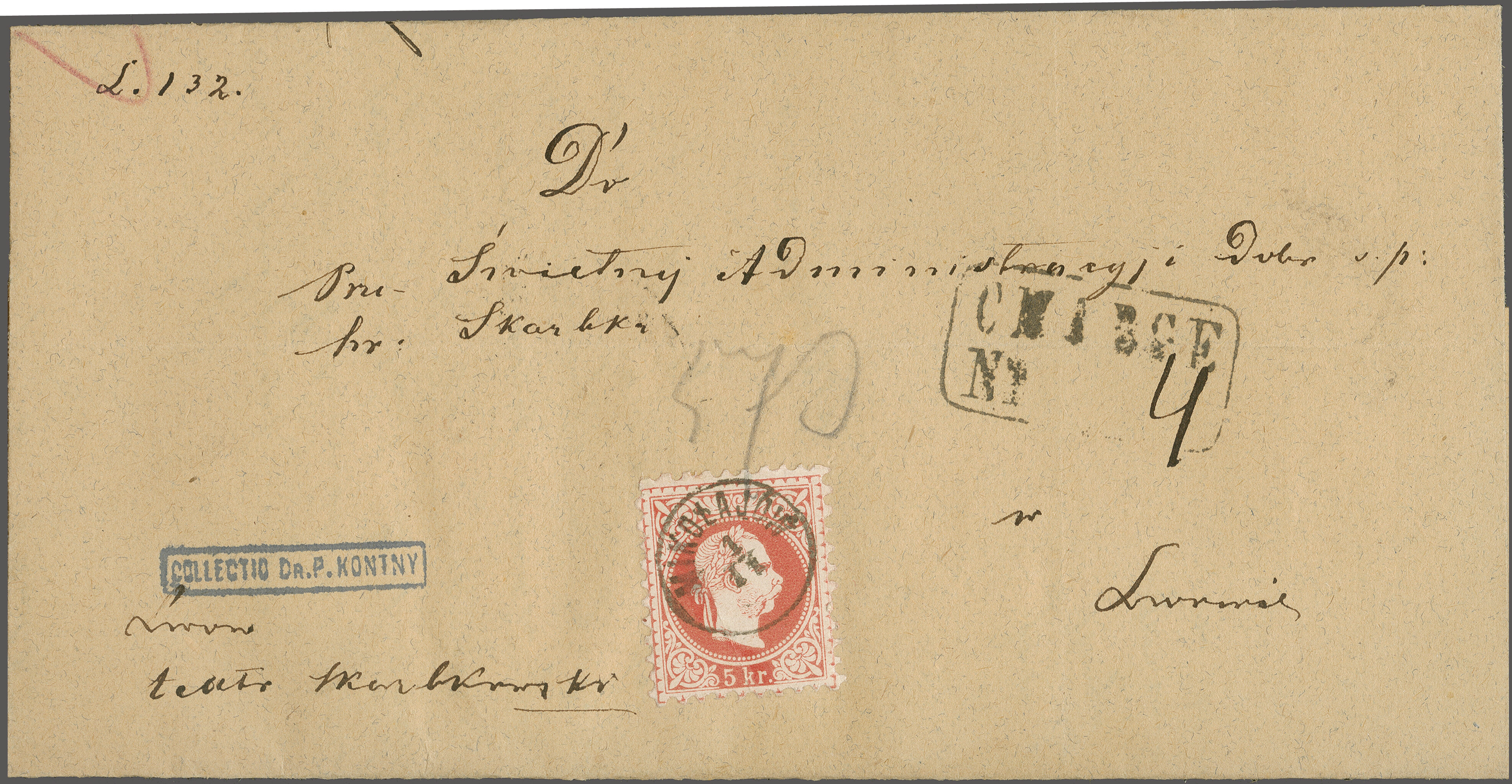 Nebenstempels "CHARGE / No ..." mit handschriftlichem Nummerneintrag (Schubert - Bewertung = 9! von 10) auf vollständigem eingeschriebenem Faltbrief nach Lwow, rücks. auf das Paar übergehender Ankunftsstp. "LEMBERG / LWOW" vom gleichen Tag. Attest