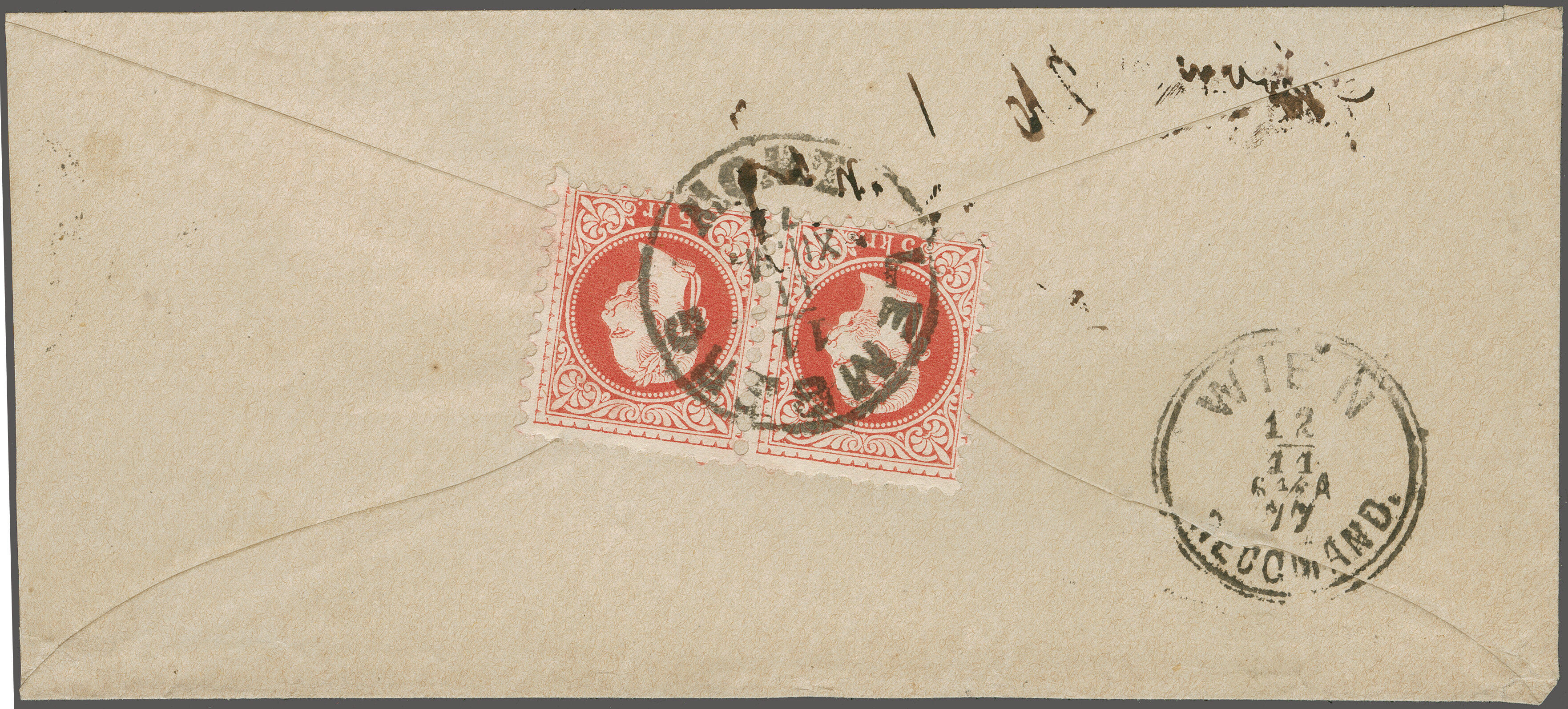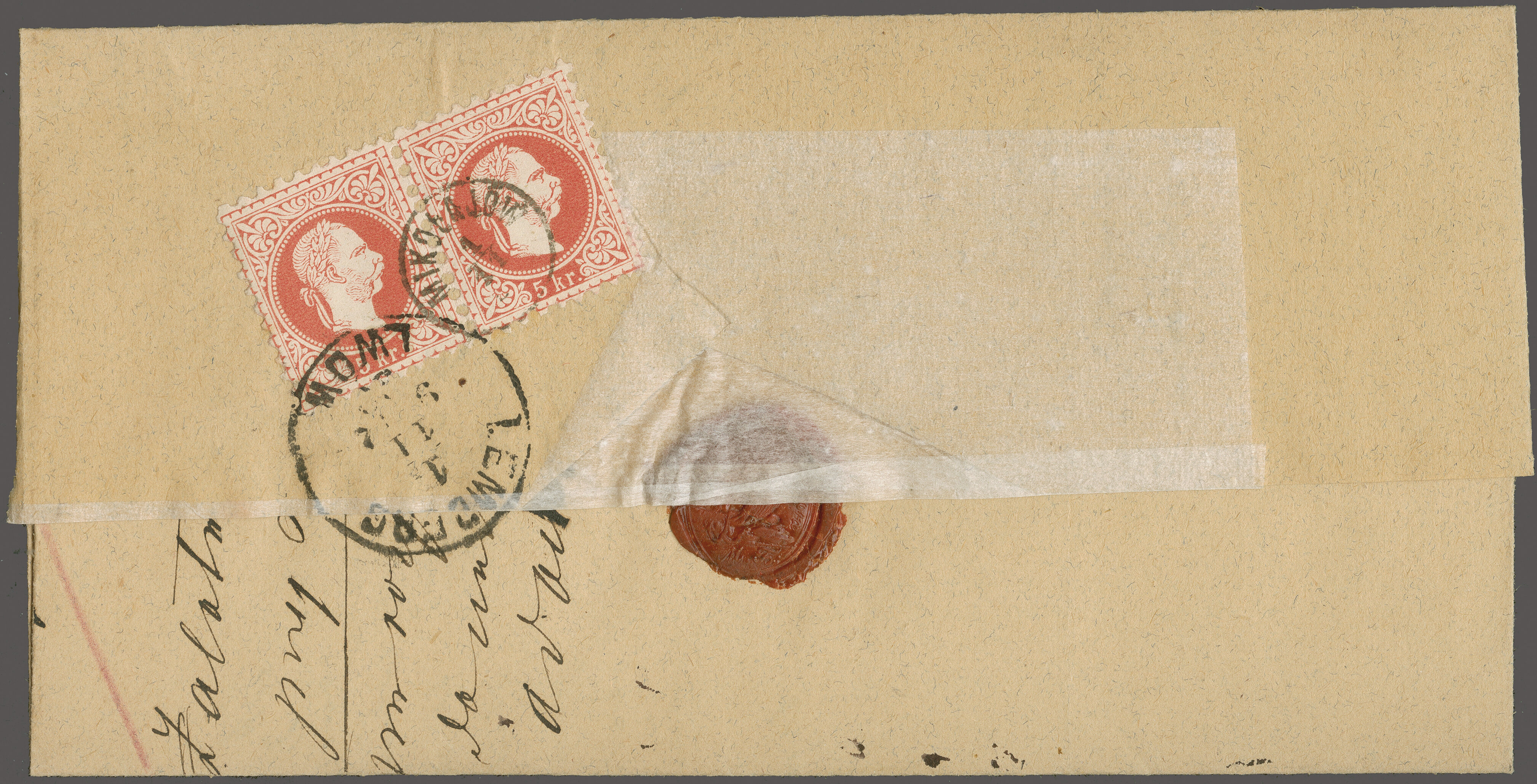 Brief an Kaiser Franz-Joseph: 1867 5 Kr. rot feiner Druck im Paar rückseitig als alleinige Reko-Gebühr, eine farbintensive und vollzähnige Einheit, klar und übergehend entw. mit schwarzem Einkreisstp. "LEMBERG LWOW 11 / 11 /