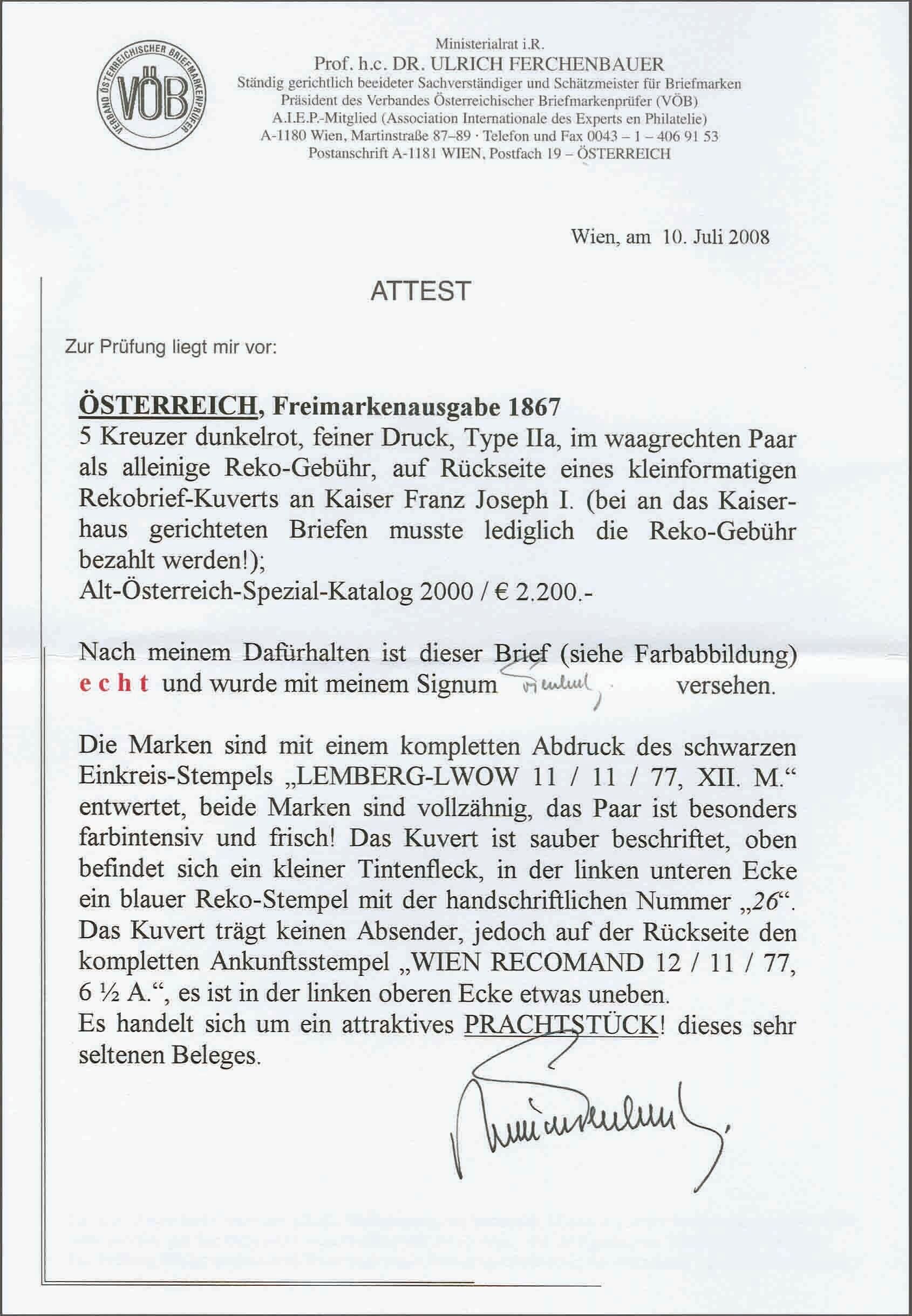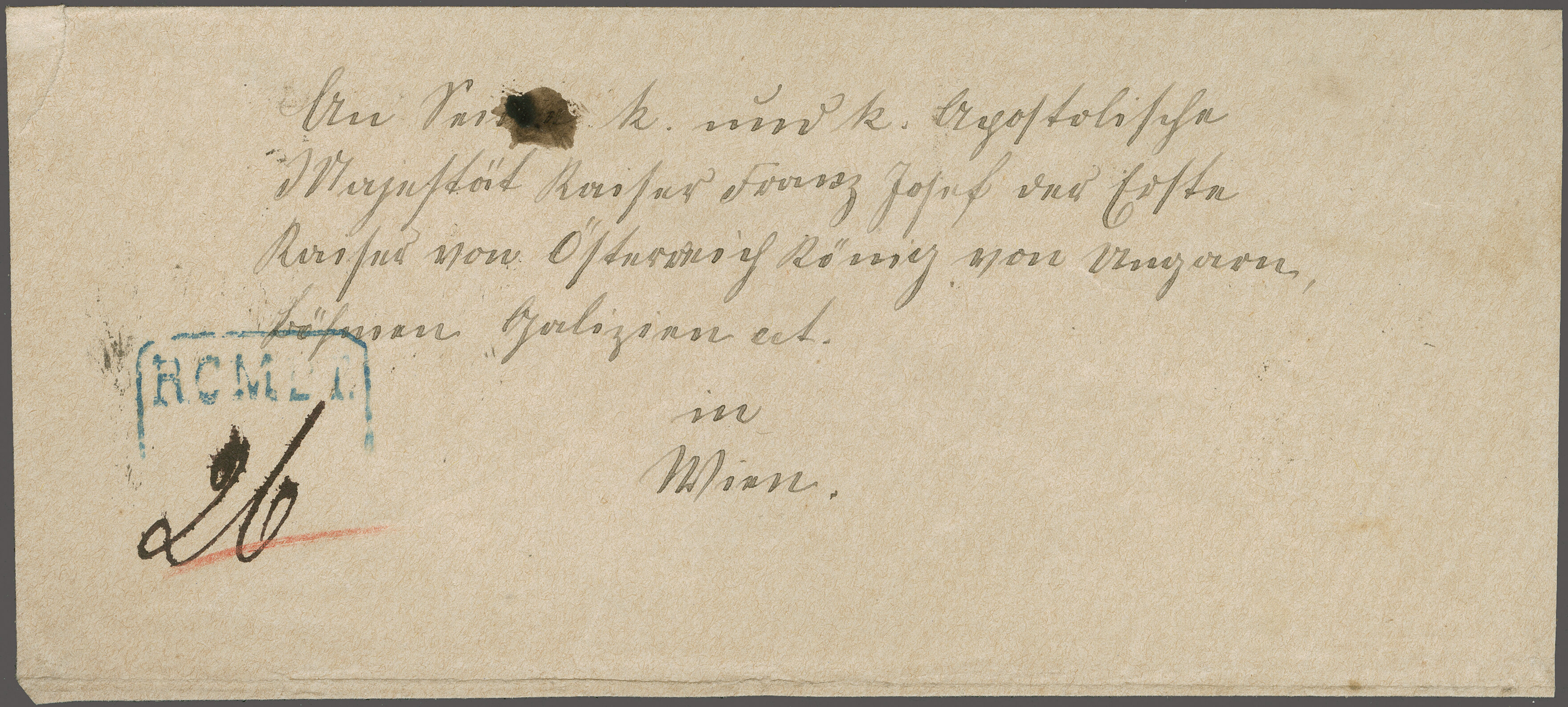 Briefen an das Kaiserhaus musste lediglich die Reko-Gebühr bezahlt werden, Attest Ferchenbauer (2008) Ferchenbauer = € 2'200. Referenz: Abgebildet und diskutiert in Vindobona 2011 auf S. 115. (Image 1)
