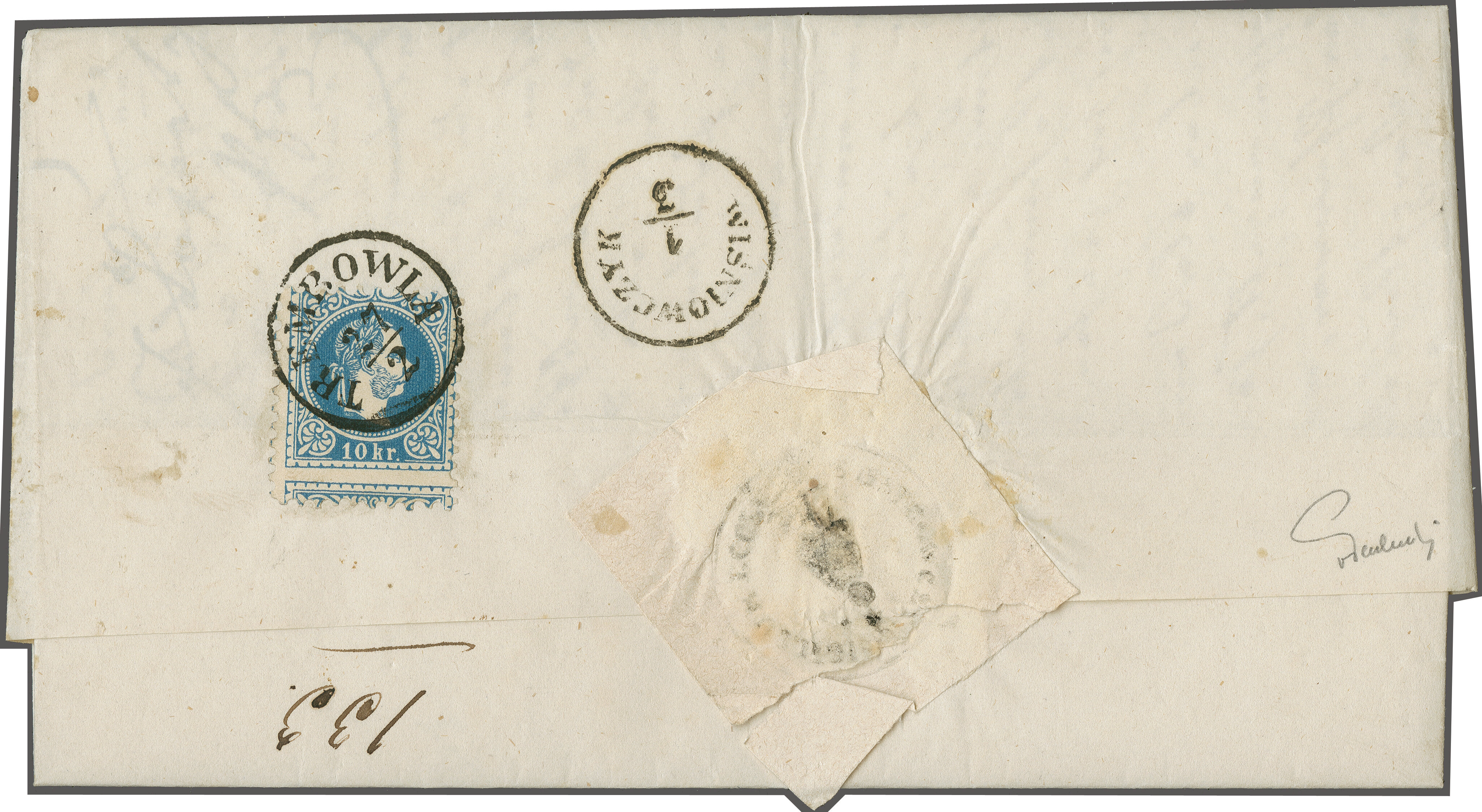 Portobefreites Einschreiben: 1867 10 Kr. blau grober Druck rückseitig als alleinige Reko-Gebühr auf ex offo Brief des Pfarramtes Ostrowczyk an das Trembowler Dekanats-Amt in Zarwanica, die Marke farbfr. und vollzähnig, stark