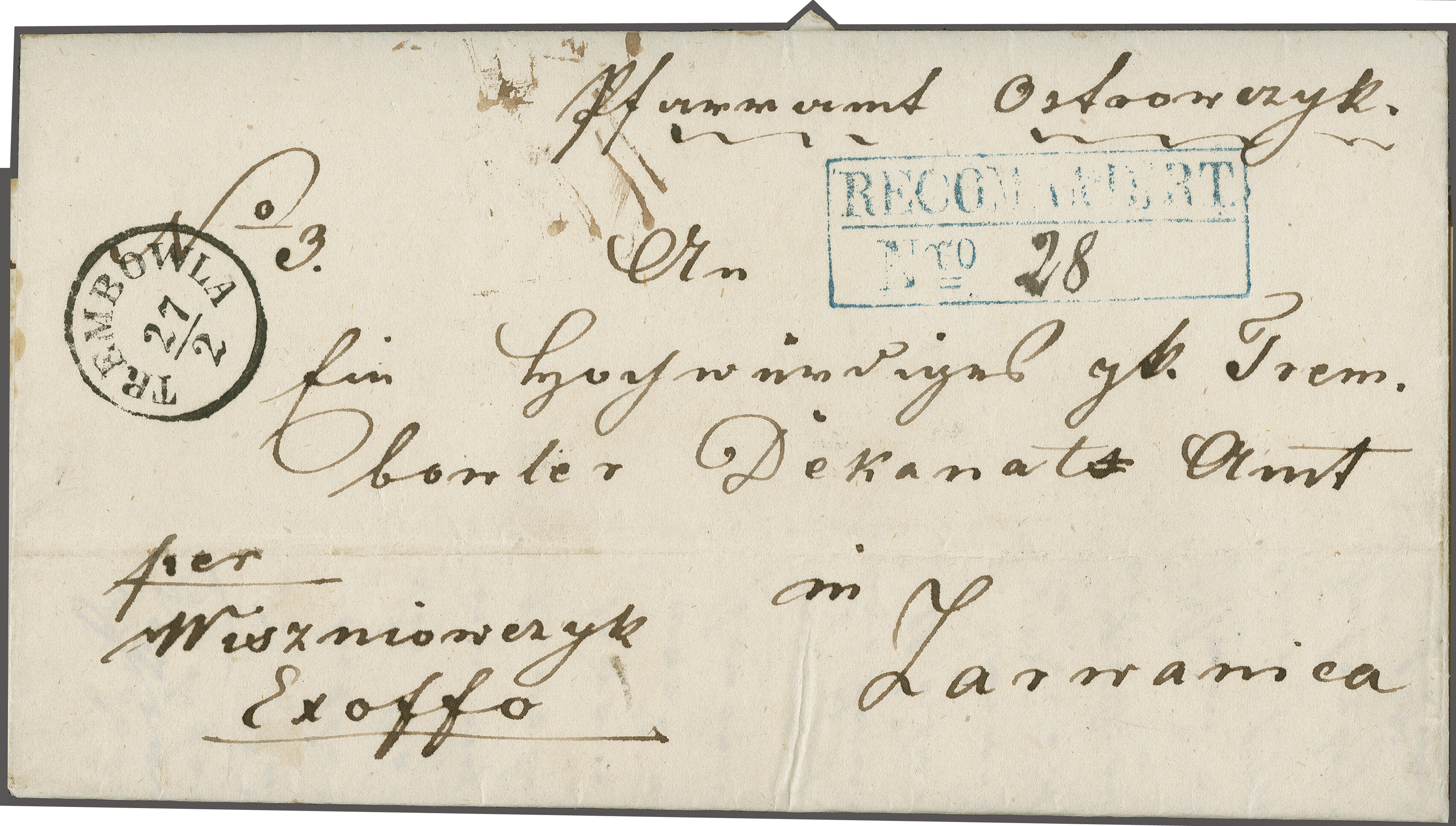 nach oben verzähnt, ideal klar und übergehend entw. mit schwarzem Einkreisstp. "TREMBOWLA 27 / 2", vorders. blauer sehr seltener gefasster Reko - Kastenstempel "RECOMMANDIRT. / Nro" (Schubert - Bewertung = R!!) mit handschriftlichem Nummerneintrag,