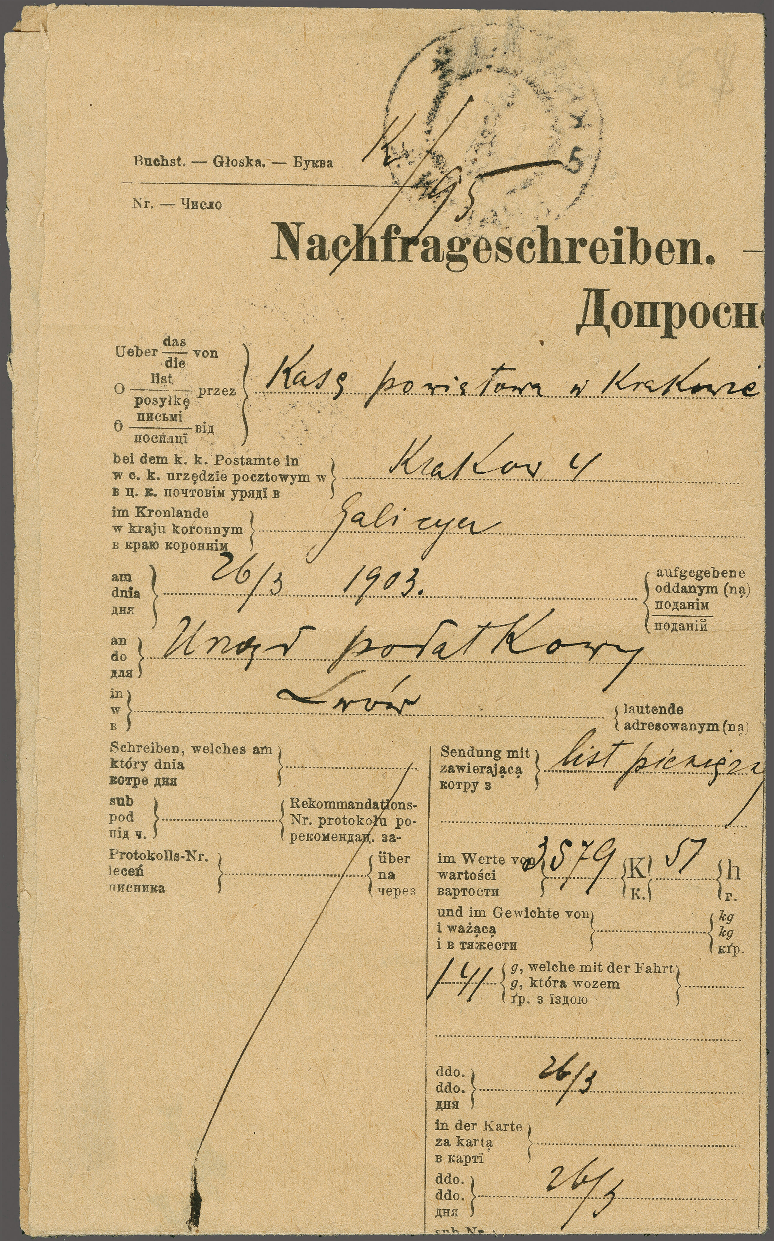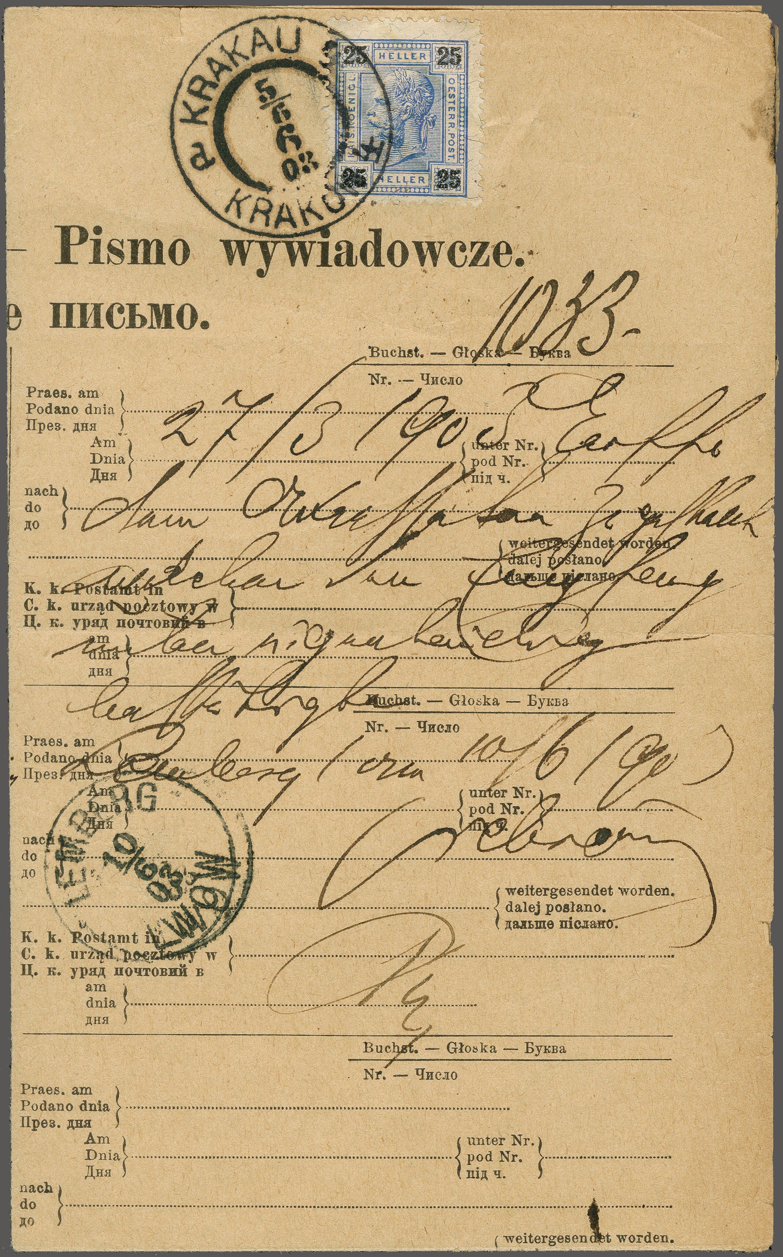1903 (5. Juni): Nachfrageschreiben / Quästionsschreiben, dreisprachig in deutsch, polnisch und ruthenisch frankiert mit 1899 25 H. ultramarin mit Lackschreiben, klar entw. mit zweisprachigem "KRAKAU 4 / KRAKOW 4", das