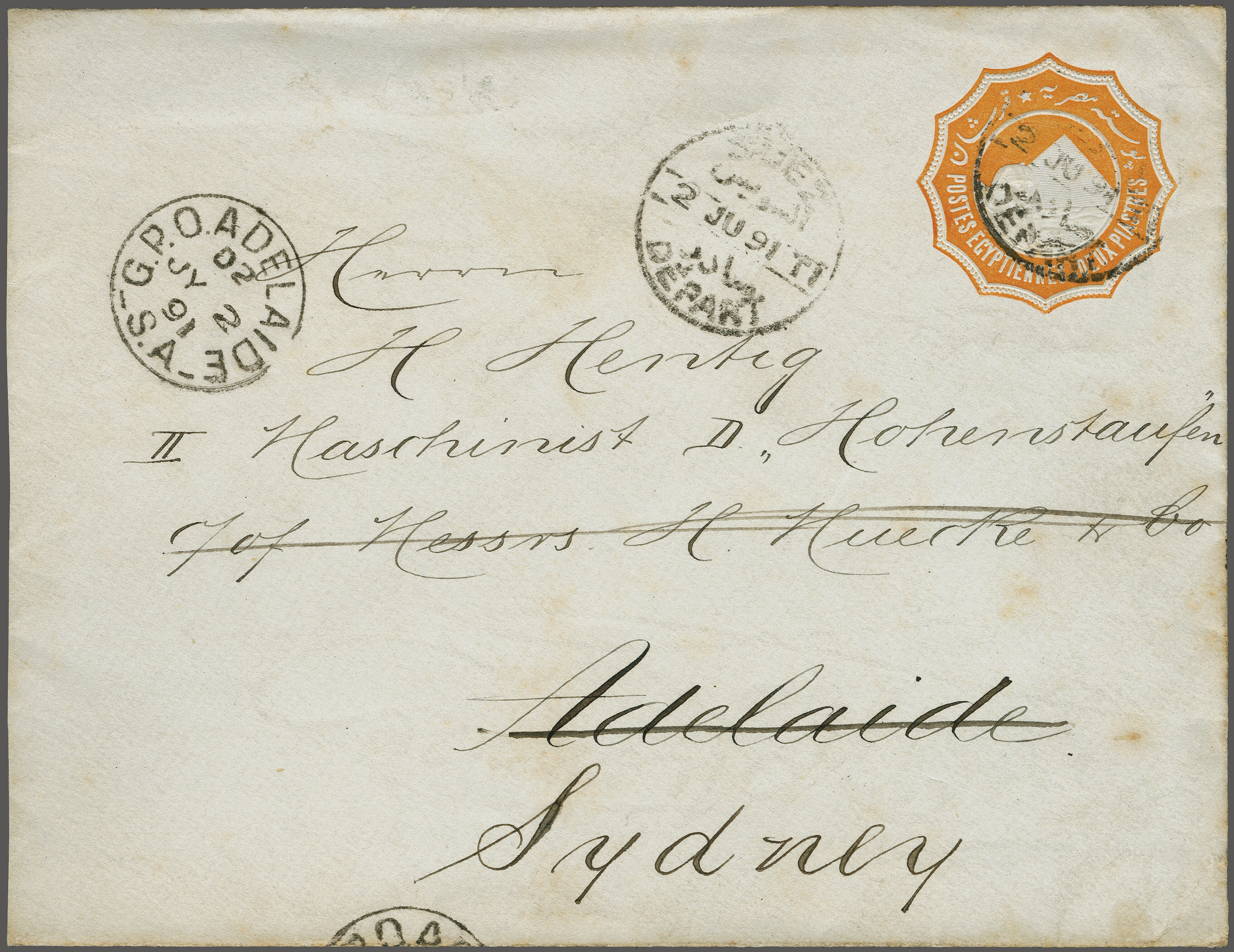 1891: 2 pi. orange postal stationery envelope, a used example to Adelaide, South Australia, cancelled by "SUEZ / DEPART" cds (June 2) with information strike adjacent; "G.P.O. ADELAIDE" arrival cds at left (July 2) and the