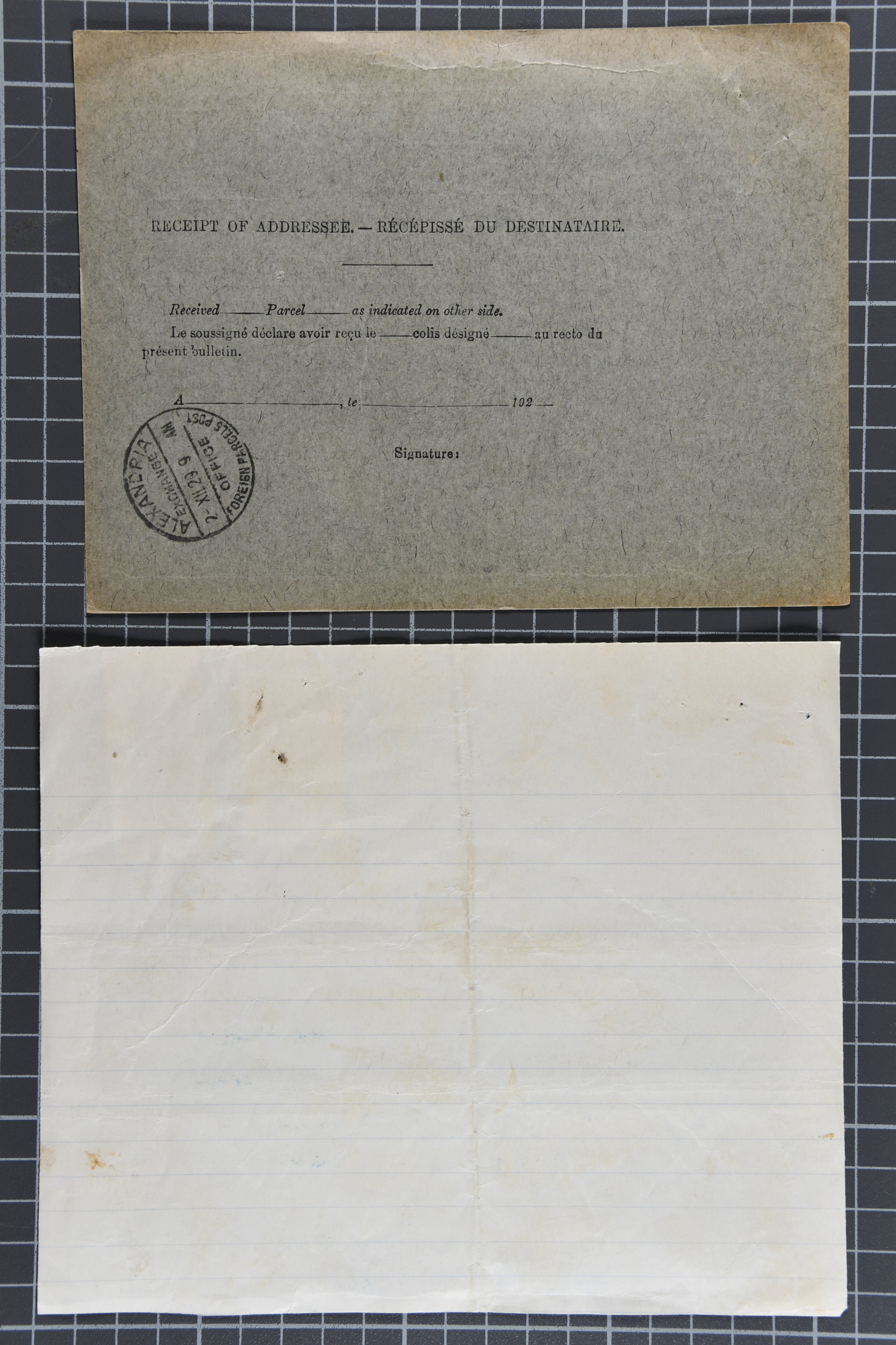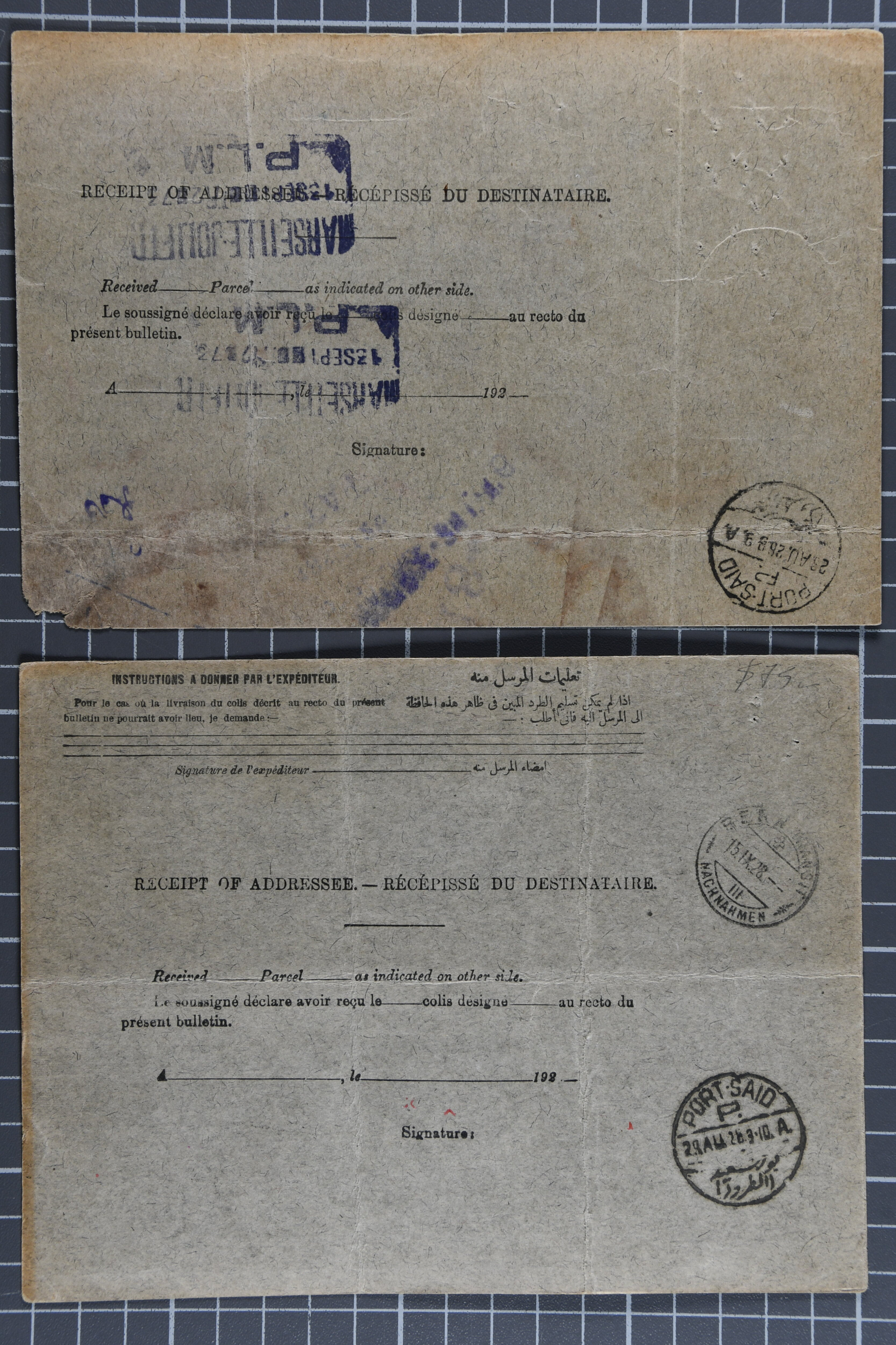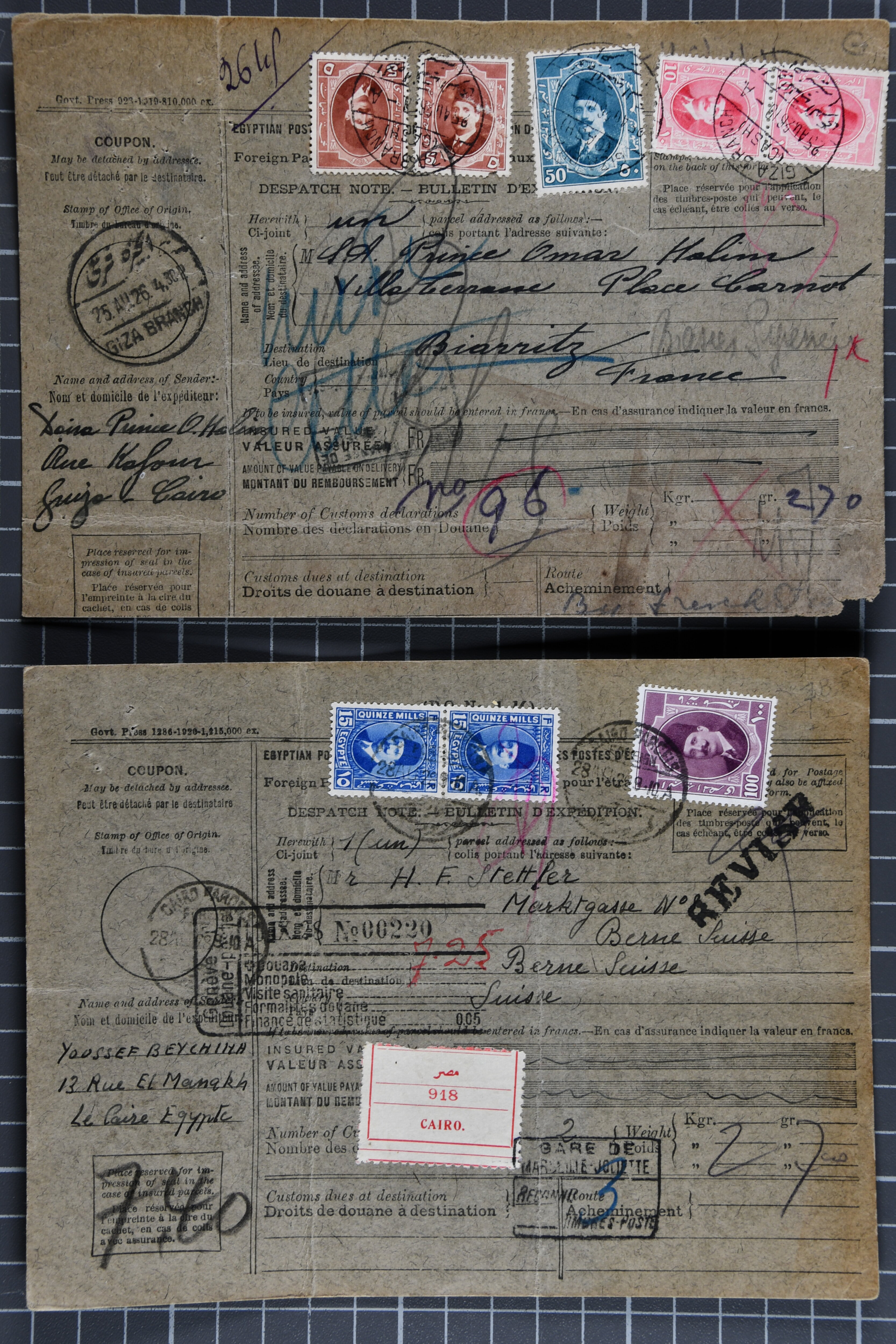 1922/27: Parcel Cards (3) from two different printings, one to Biarritz with 1923 Fuad 5 m. (2), 10 m. pair and single 50m. tid "Giza Branch / Cash" cds's; registered Parcel card from Cairo to Bern, Switzerland