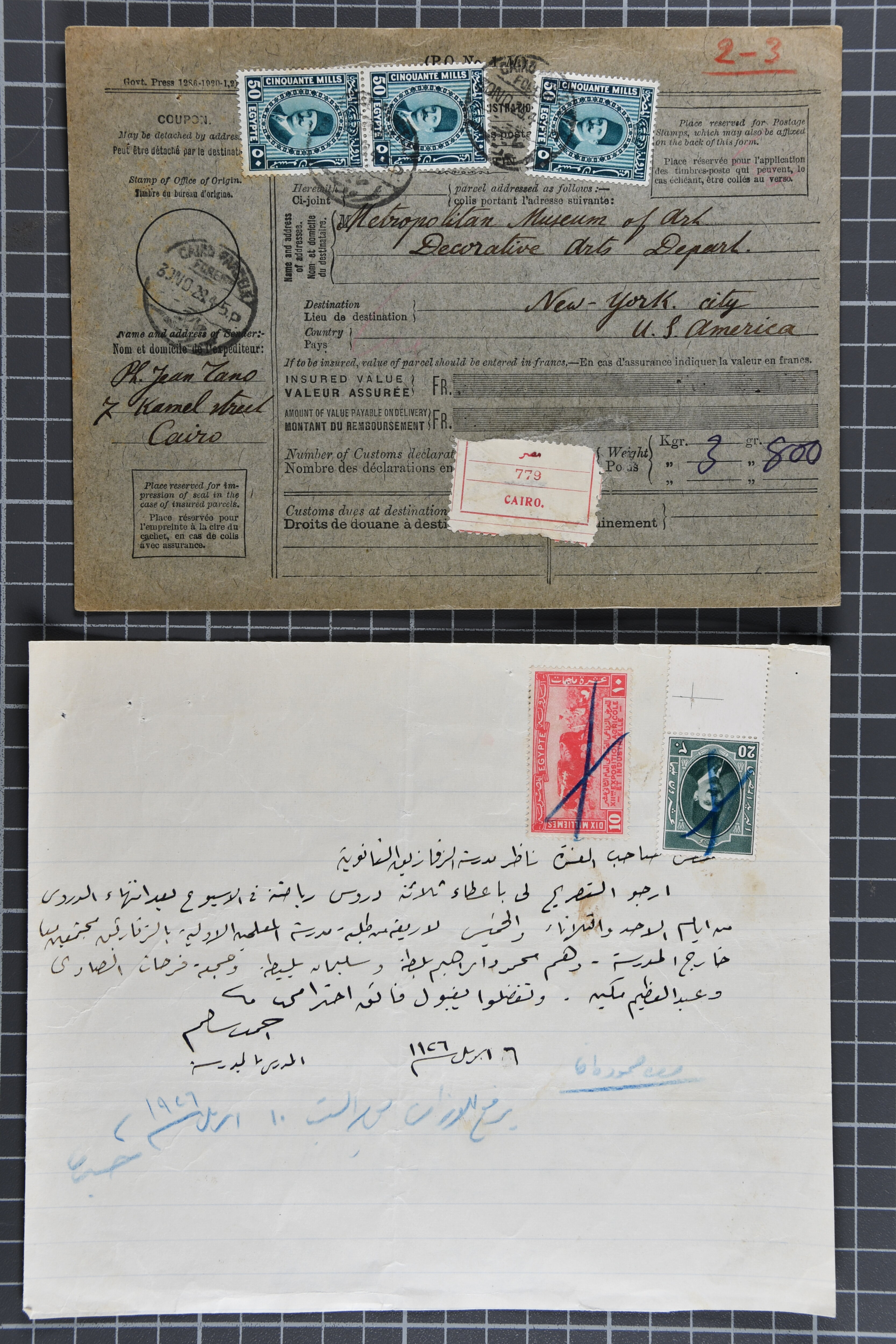 with 1923 100 m. purple and 1927 15 m. blue pair; third card to USA with 1927 50 m. greenish blue (3) used from Cairo to the Metropolitan Museum of Art in New York; together with two stamps on a fiscally used document. (Image 1)