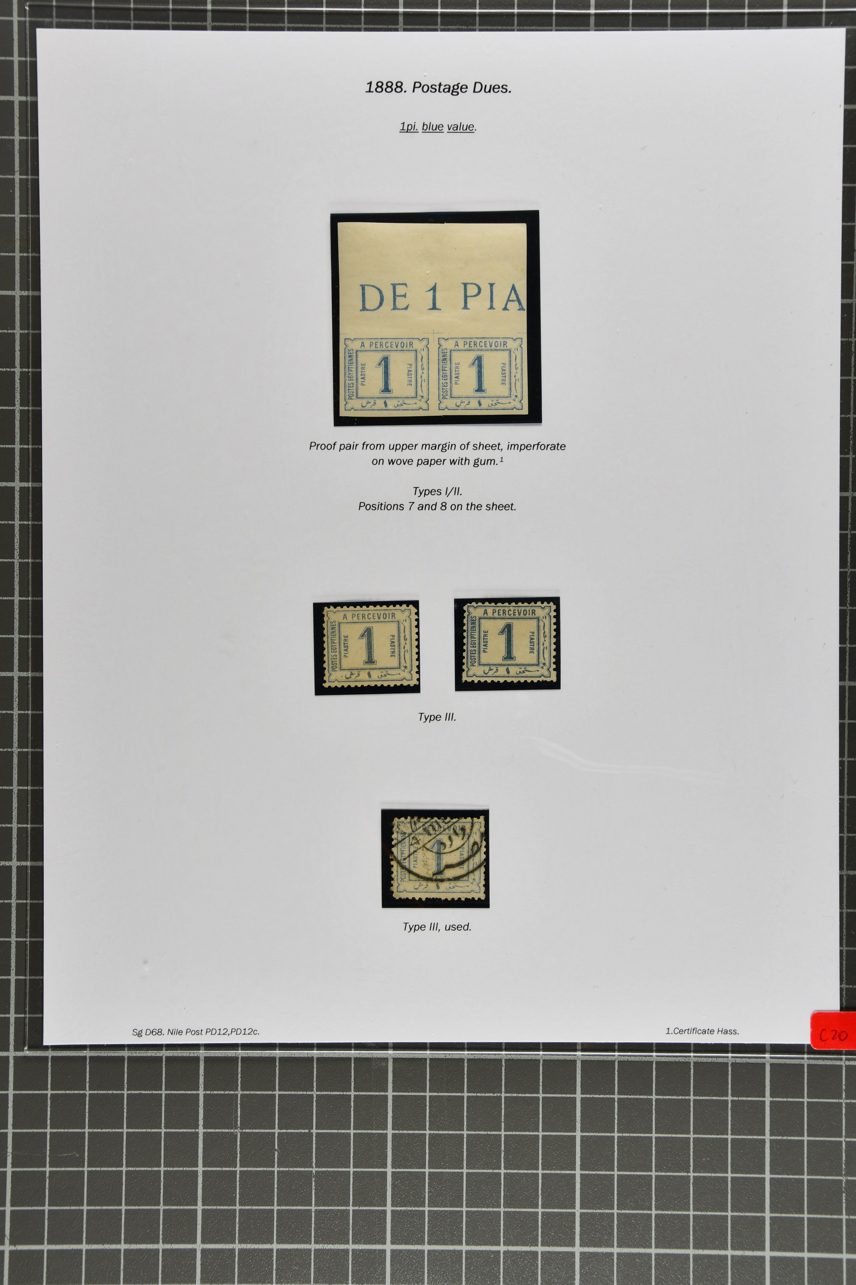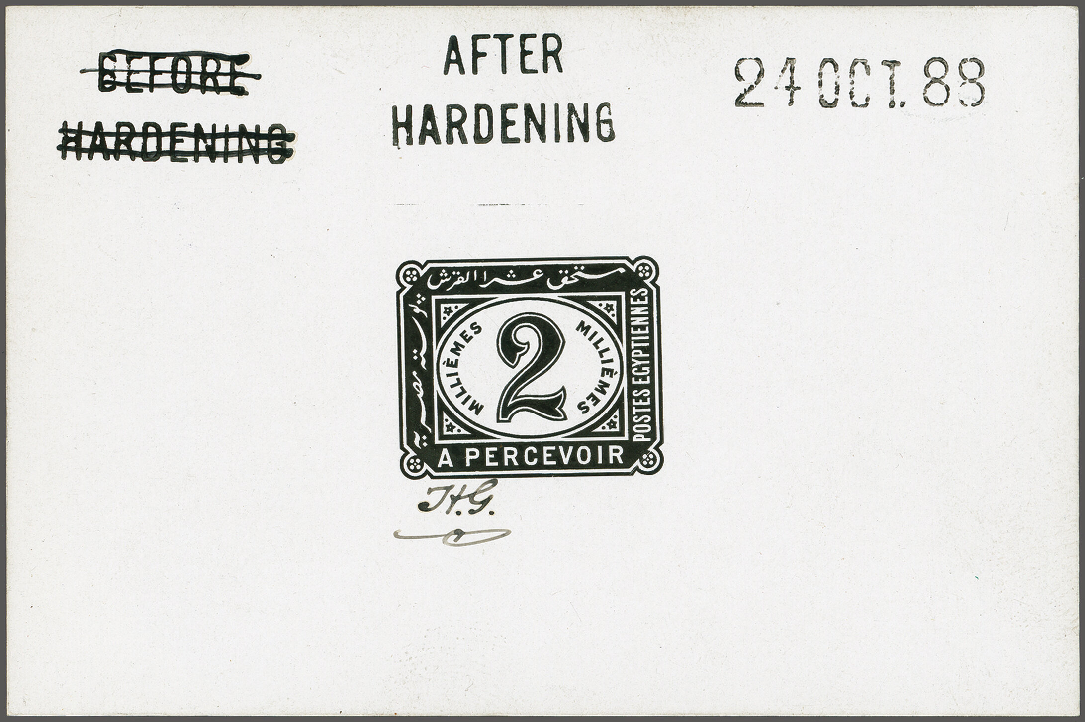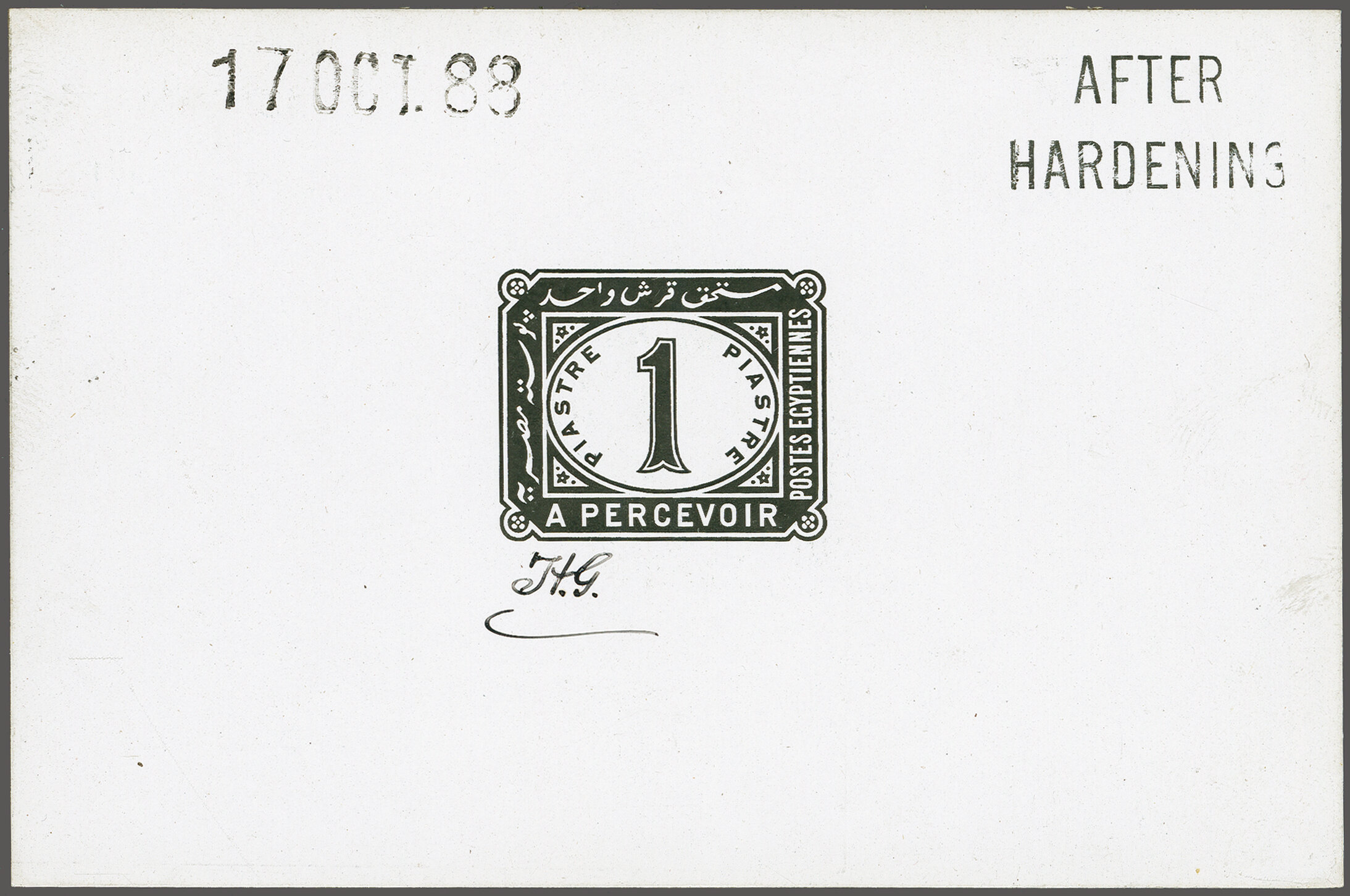 1888: De La Rue Die Proof for 1 pi. value, printed in black on glazed card, struck with AFTER HARDENING and dated at left 17 OCT. 88 in black, initialled 'H.G.' at base. Rare. Signed Todd AIEP Nile Post = $ 600. (Image 1)