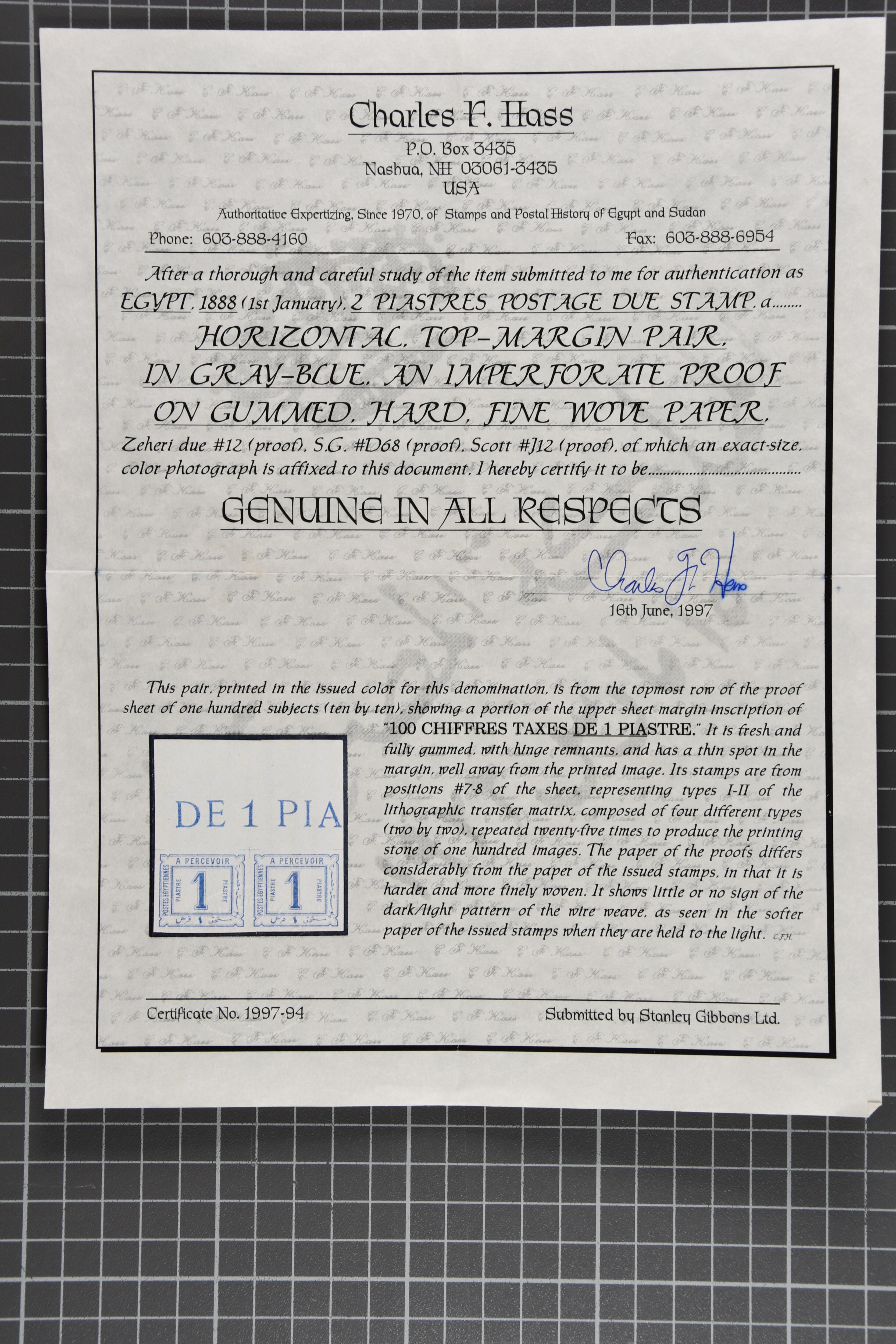 1888: Postage Due 1 pi. blue, the album page with sheet marginal Imperforate Proof pair from top of sheet showing imprint on gummed wove paper (cert. Hass, 1997) and two unused examples of the 1 pi. blue, both