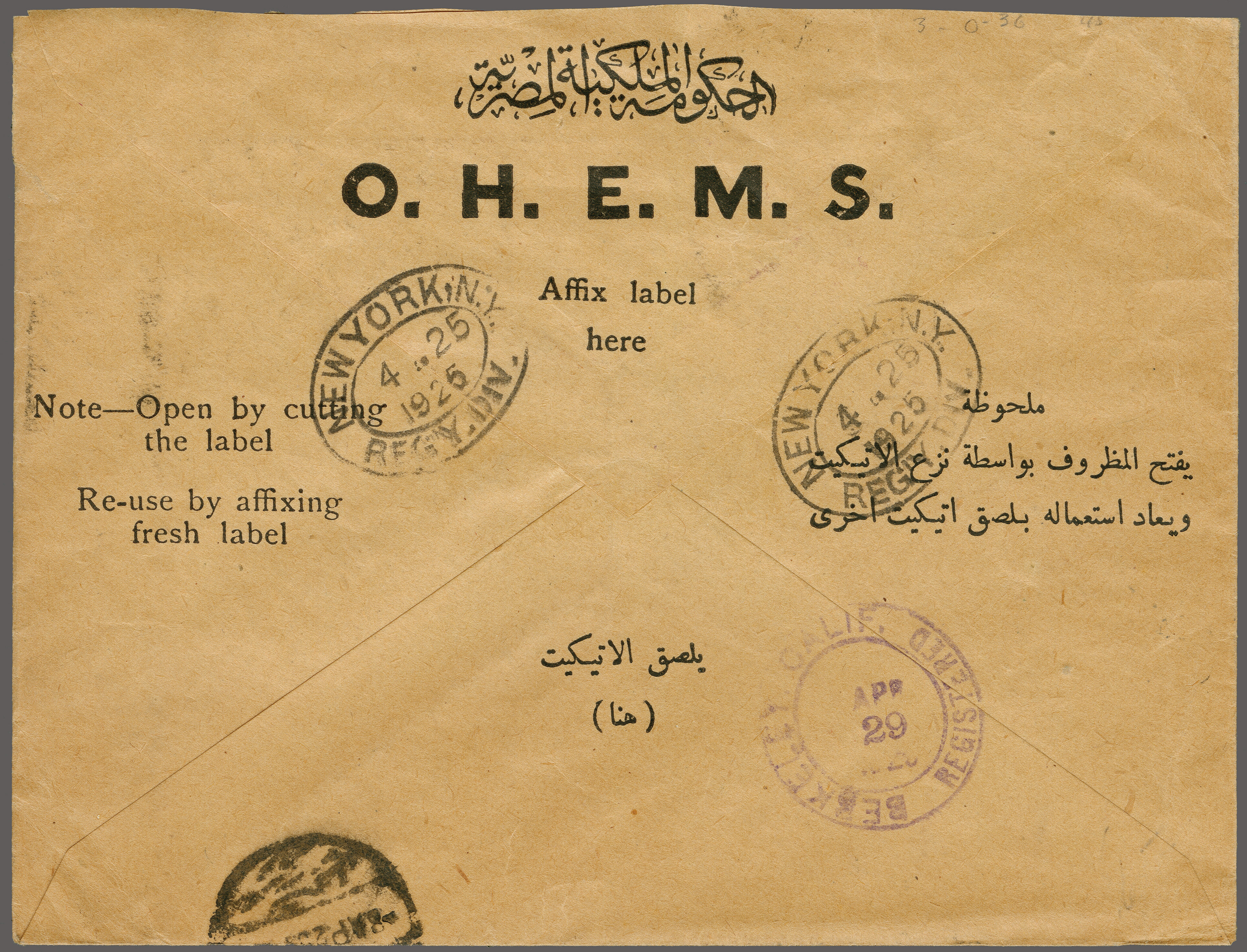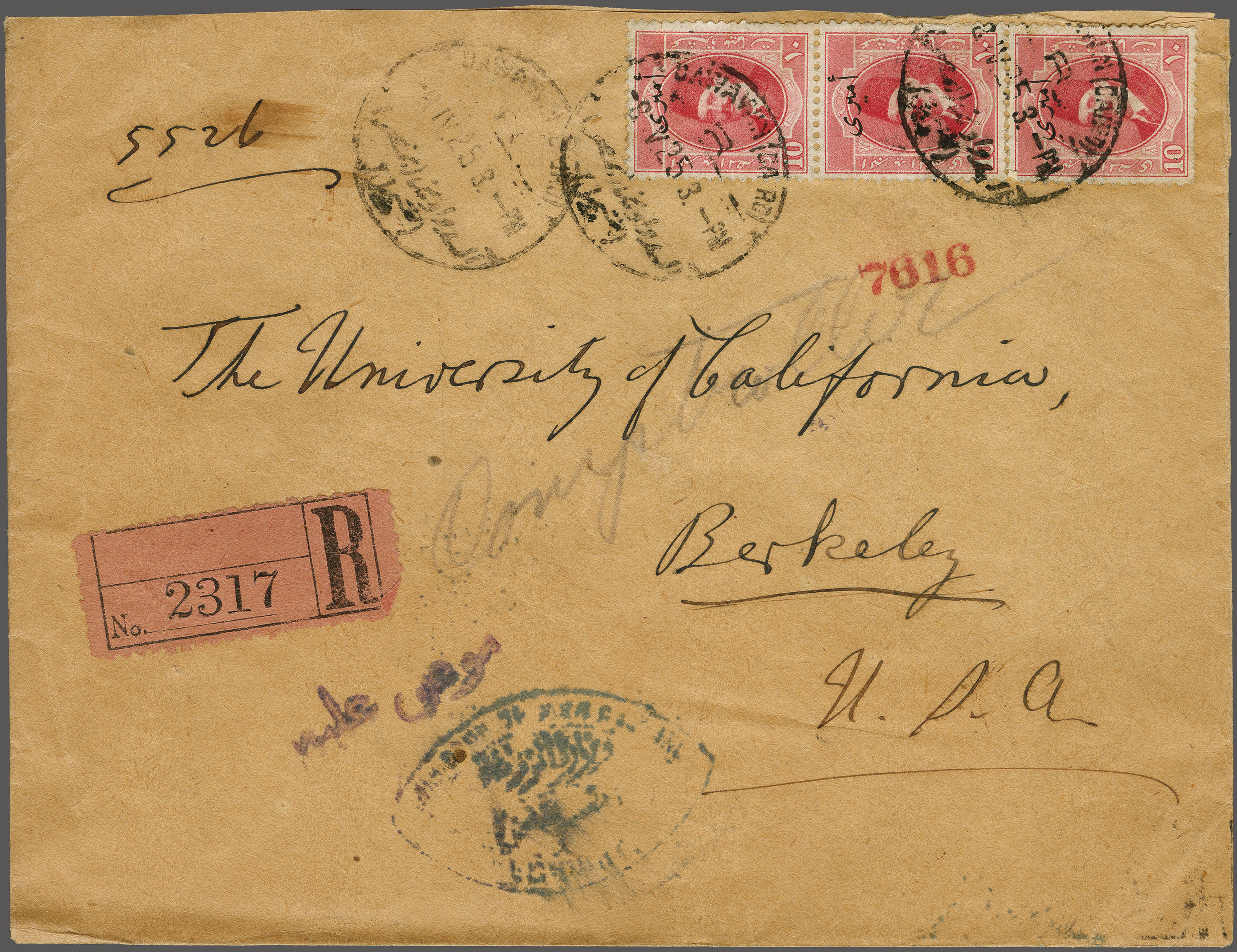 Officials 1923/24: Fuad Official 10 m. bright rose, a vertical strip of three used on registered 1925 cover to Berkeley, USA all tied by "Dawawin (Cairo" cds's (April 8) in black. Registered label at left and reverse (with