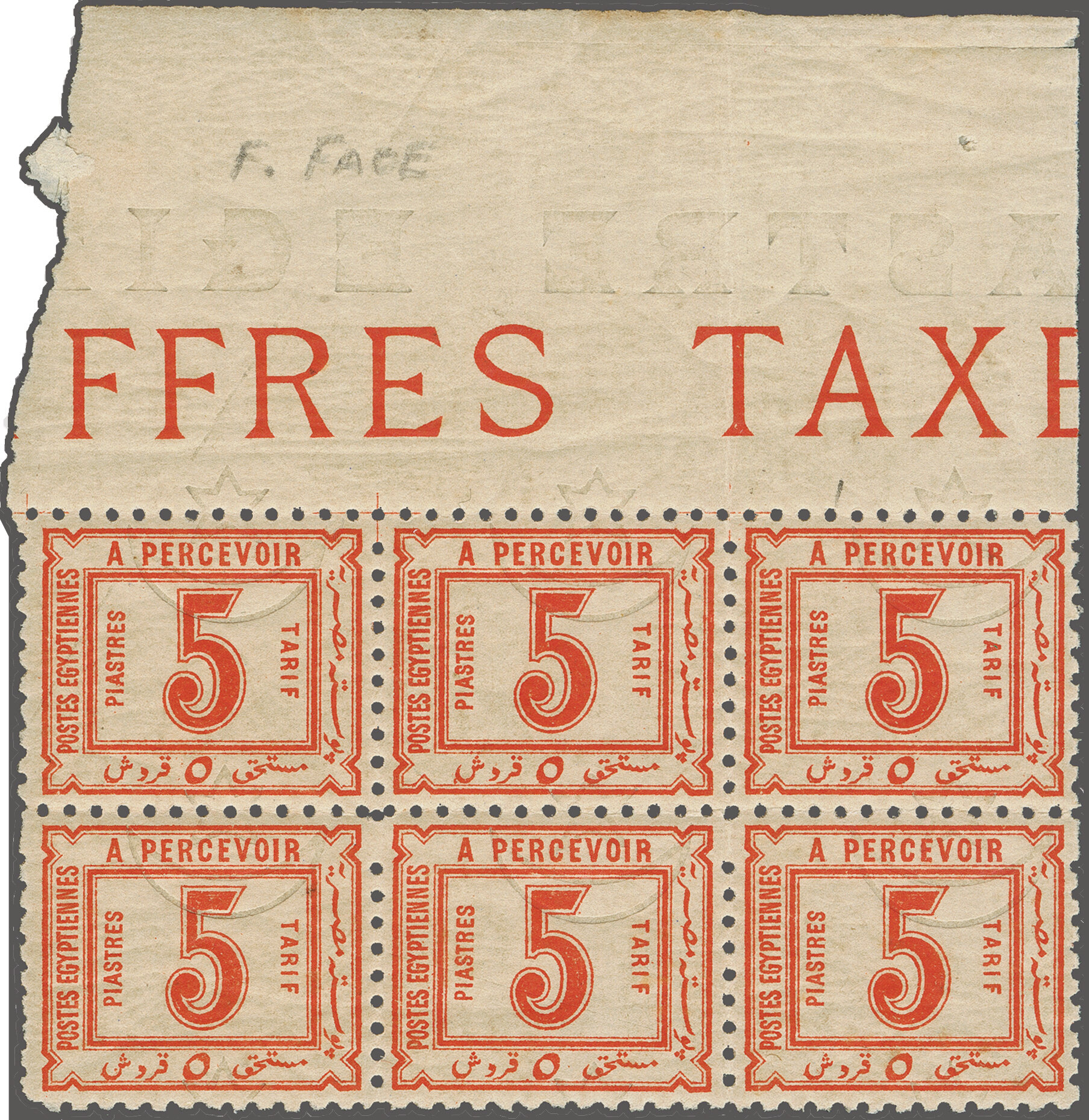 1884 (Jan 1): Postage Due 5 pi. red, an unused block of six (3 x 2), with sheet marginal inscription at top "(CHI)FFRES TAXE(S), variety "watermark en face", fresh and very fine, unmounted og. Scarce multiple. (Image 1)