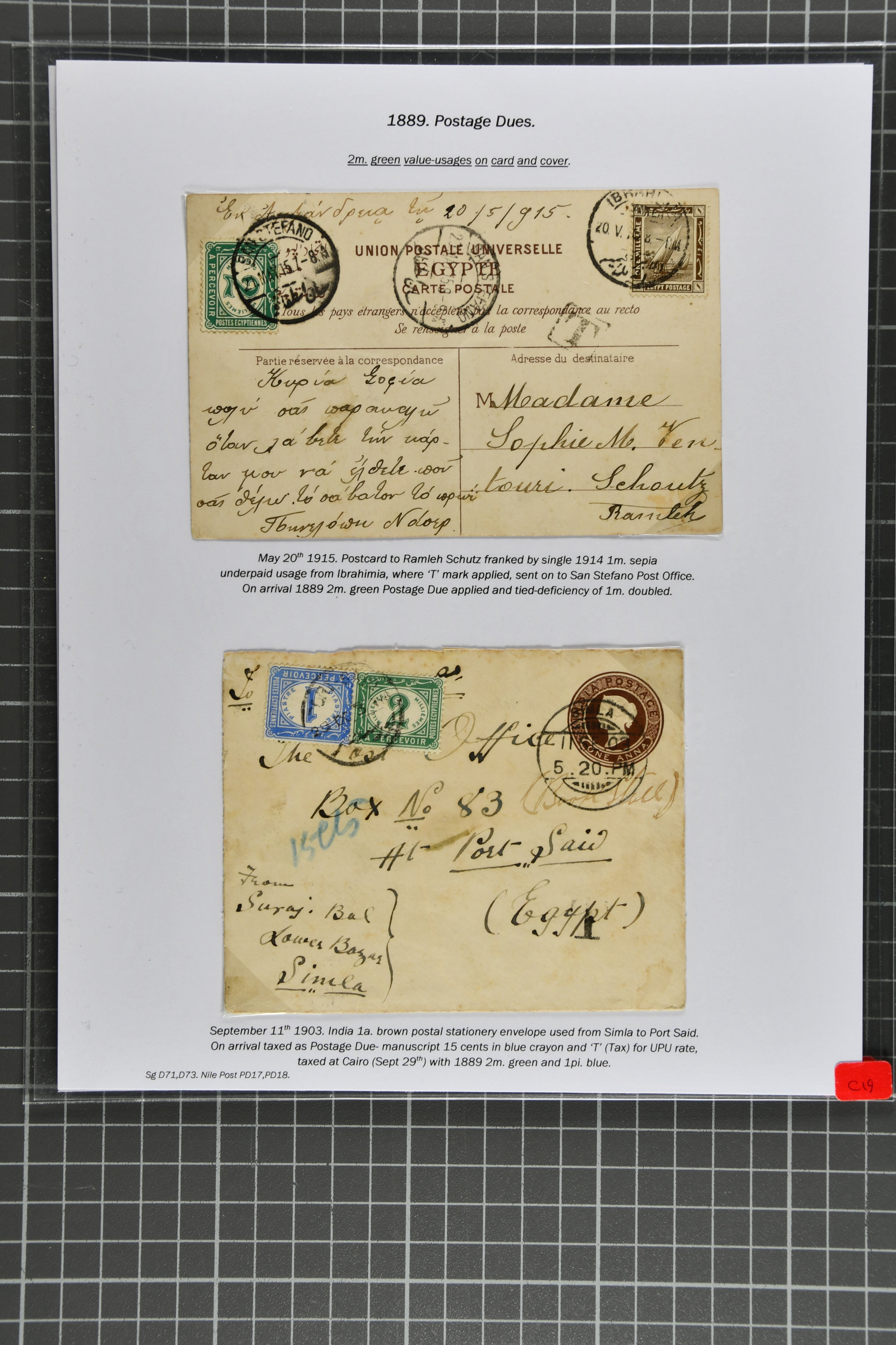 charged at the Soldier's rate of 3 m. with 1889 Postage Due 2 m. green and diagonally bisected 2 m. green tied by 'Alexandrie' cds of arrival (March 1). Some trivial aging but scarce Gi = £ 250/Nile Post PD15a = $ 125 (on piece). Note: 3