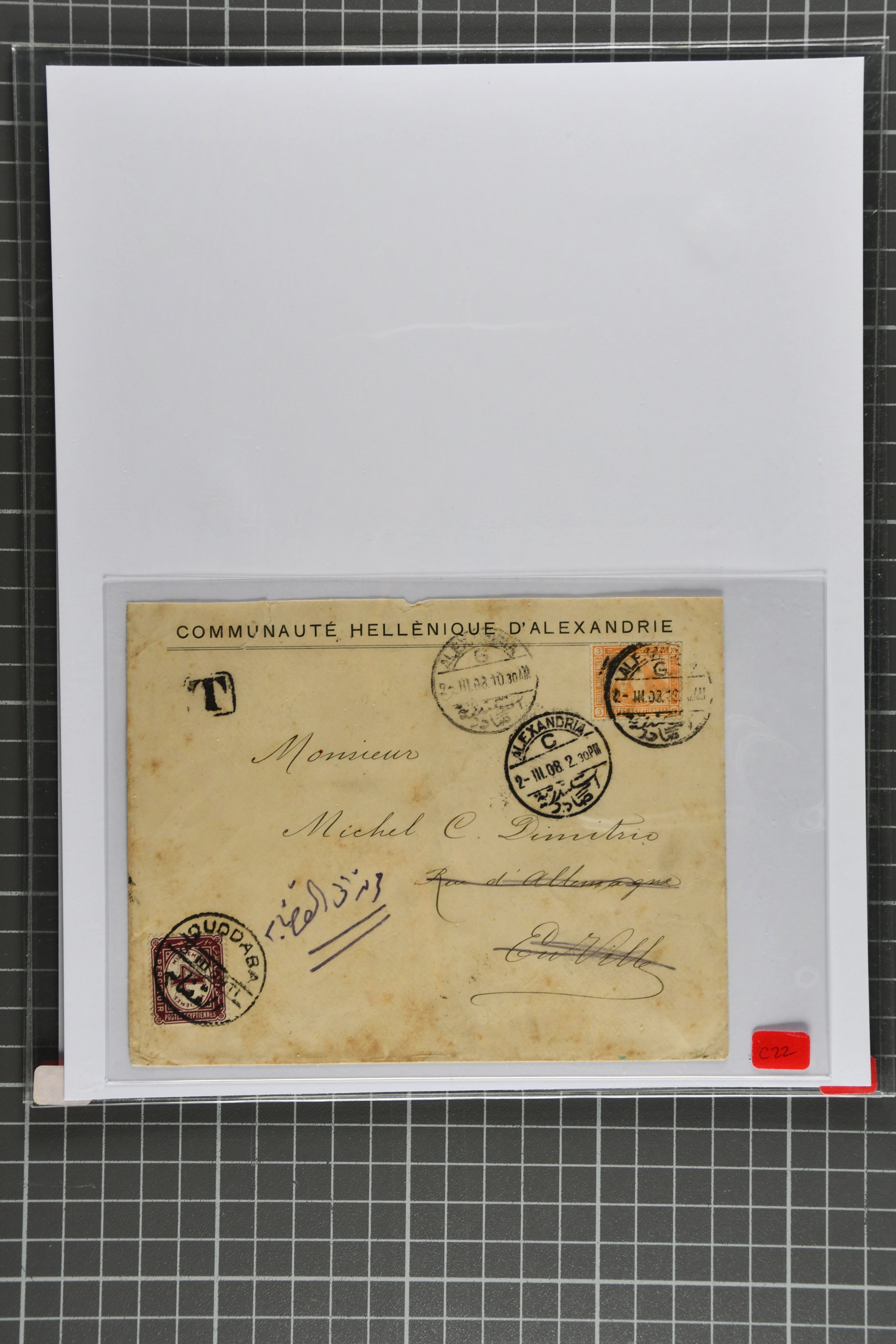 repeated strike of Alexandria cds on reverse. Rate: the cover was above 30 grams, postage of 20 centesemi tripled = 60c / 96 paras. Double the deficiency = 192 paras, rounded up as per regulations to 200 paras = 5 piastres. The Italian Post Office