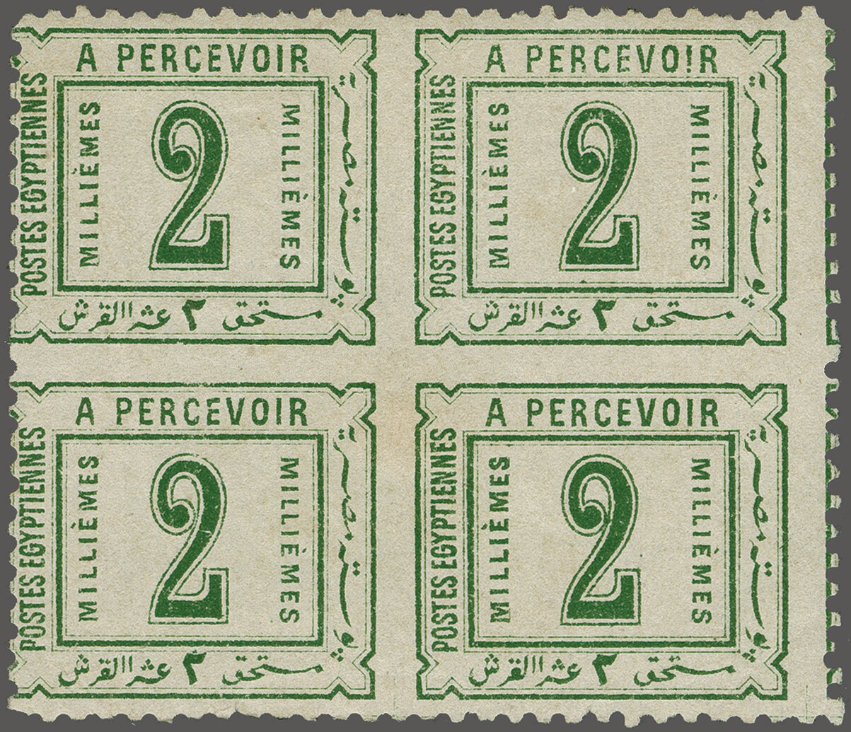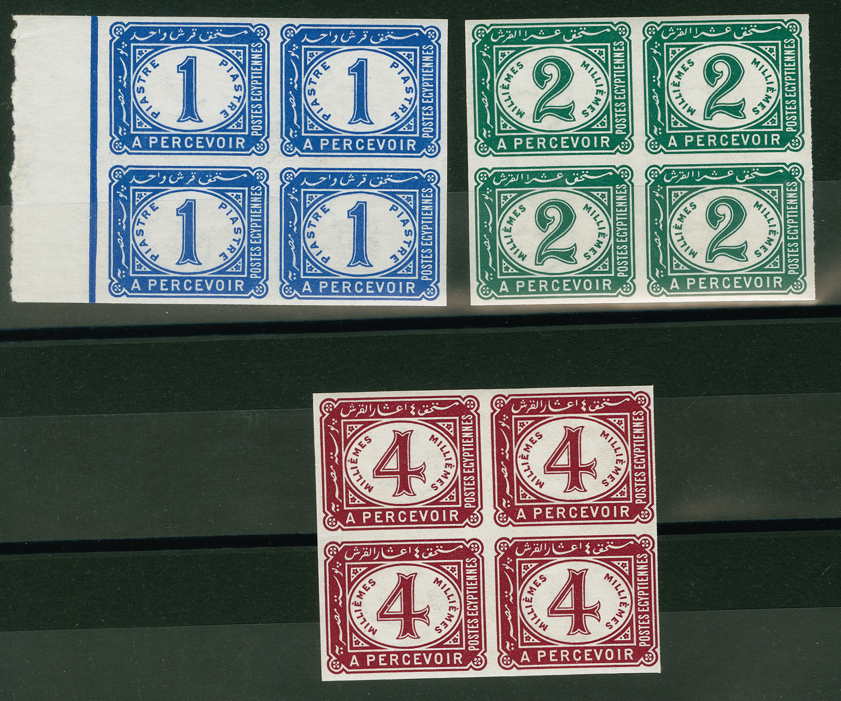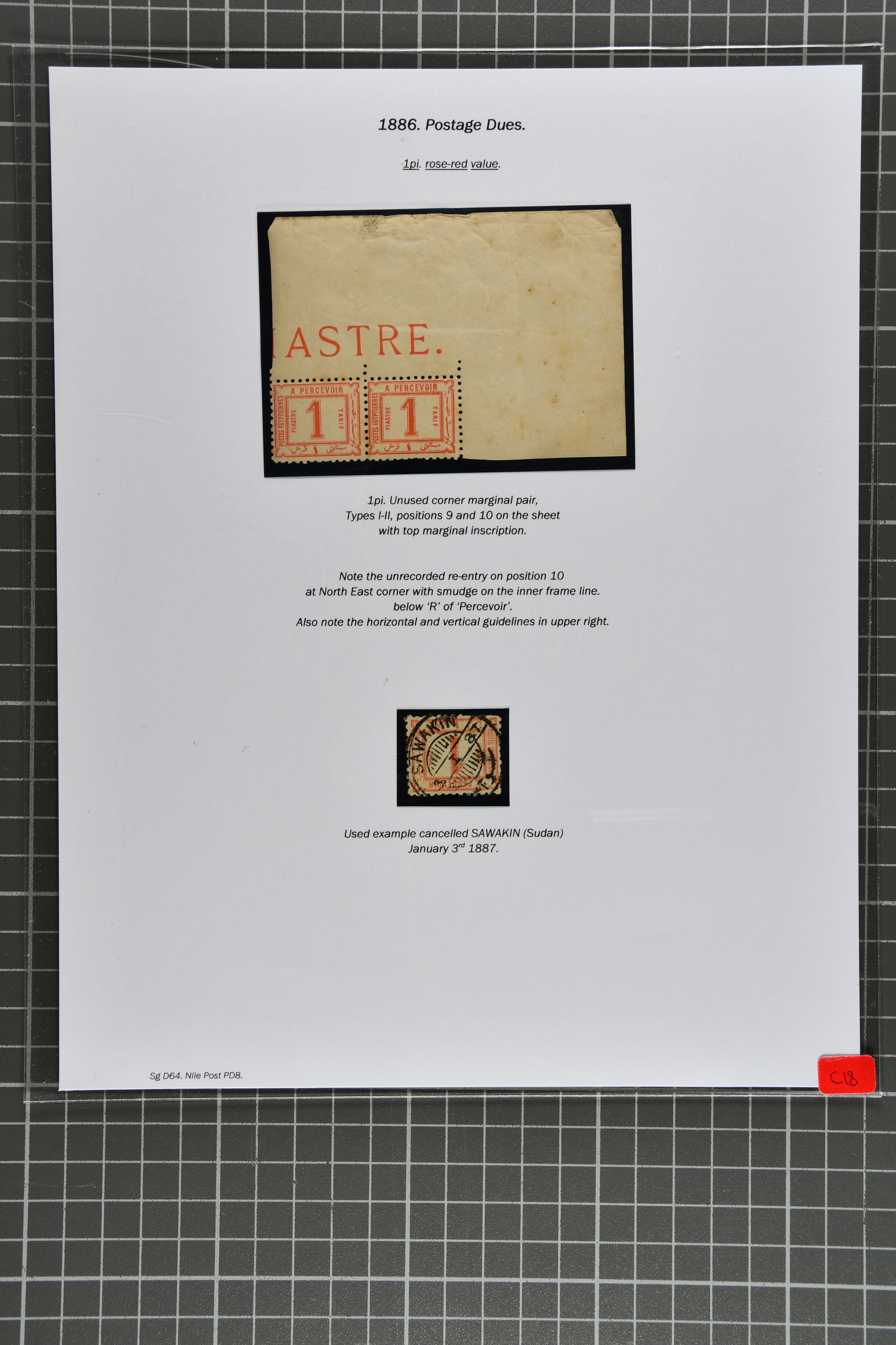 1886/1915: Postage Dues, 1 pi. red unused corner marginal pair from top right of sheet with "(PI)ASTRE" imprint, and a used example cancelled at Sawakin (Sudan); 1888 2 m. green in an unused block of nine, without