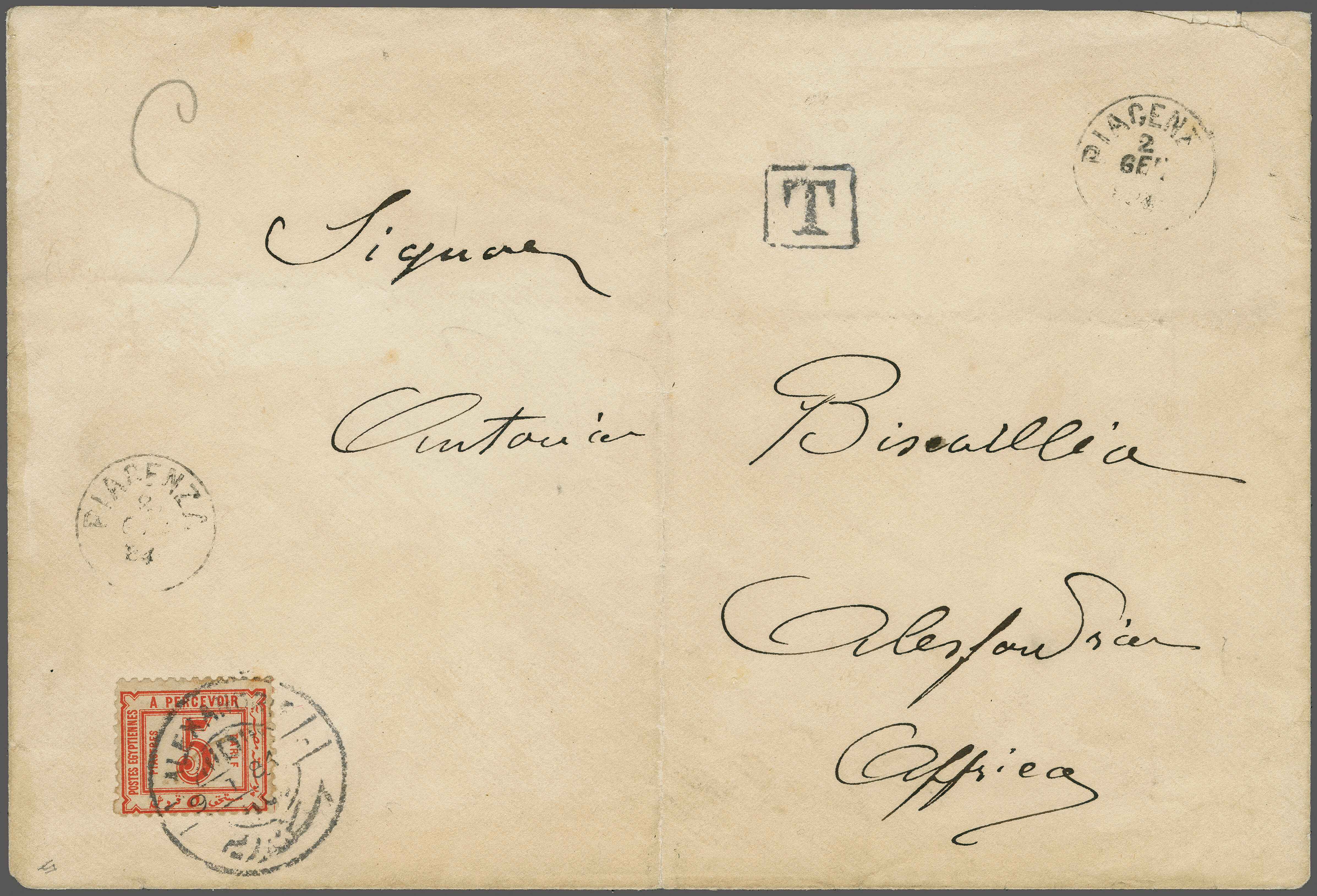 1884: Postage Due 5 pi. red, used on stampless 1884 cover from Piacenza (Jan 2), with manuscript '5' in pencil at upper left and the adhesive tied by ALEXANDRIE datestamp (Jan 9) in black. Framed 'T' marking on front and