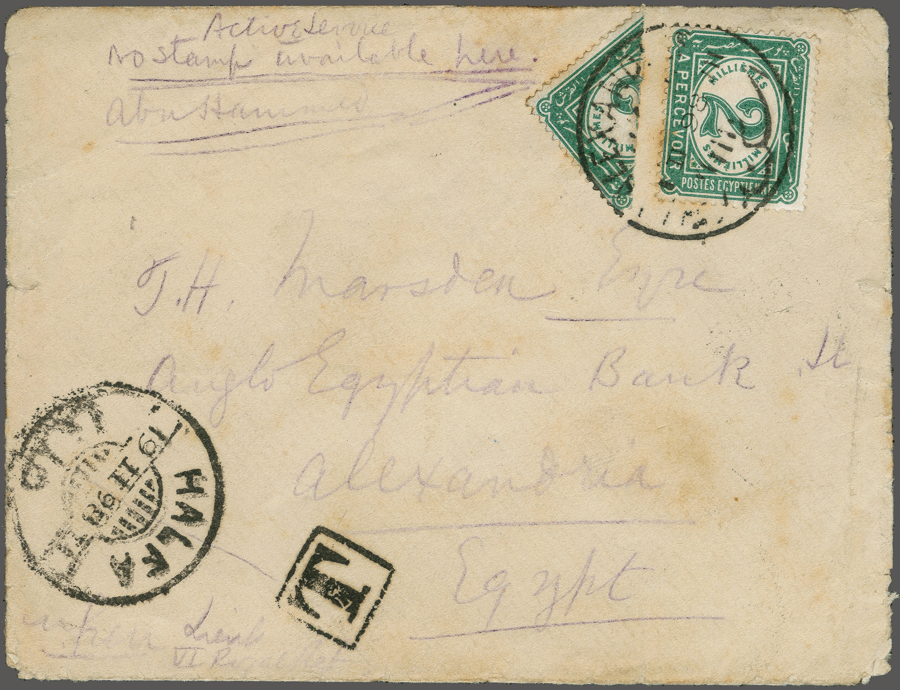 1898 (Feb 19): Cover endorsed 'Active Service, No Stamps Available here, Abu Hamad', mailed from the Sudan to Alexandria by a Lieutenant (signed at lower left), struck with HALFA cds of despatch with framed 'T' mark alongside,
