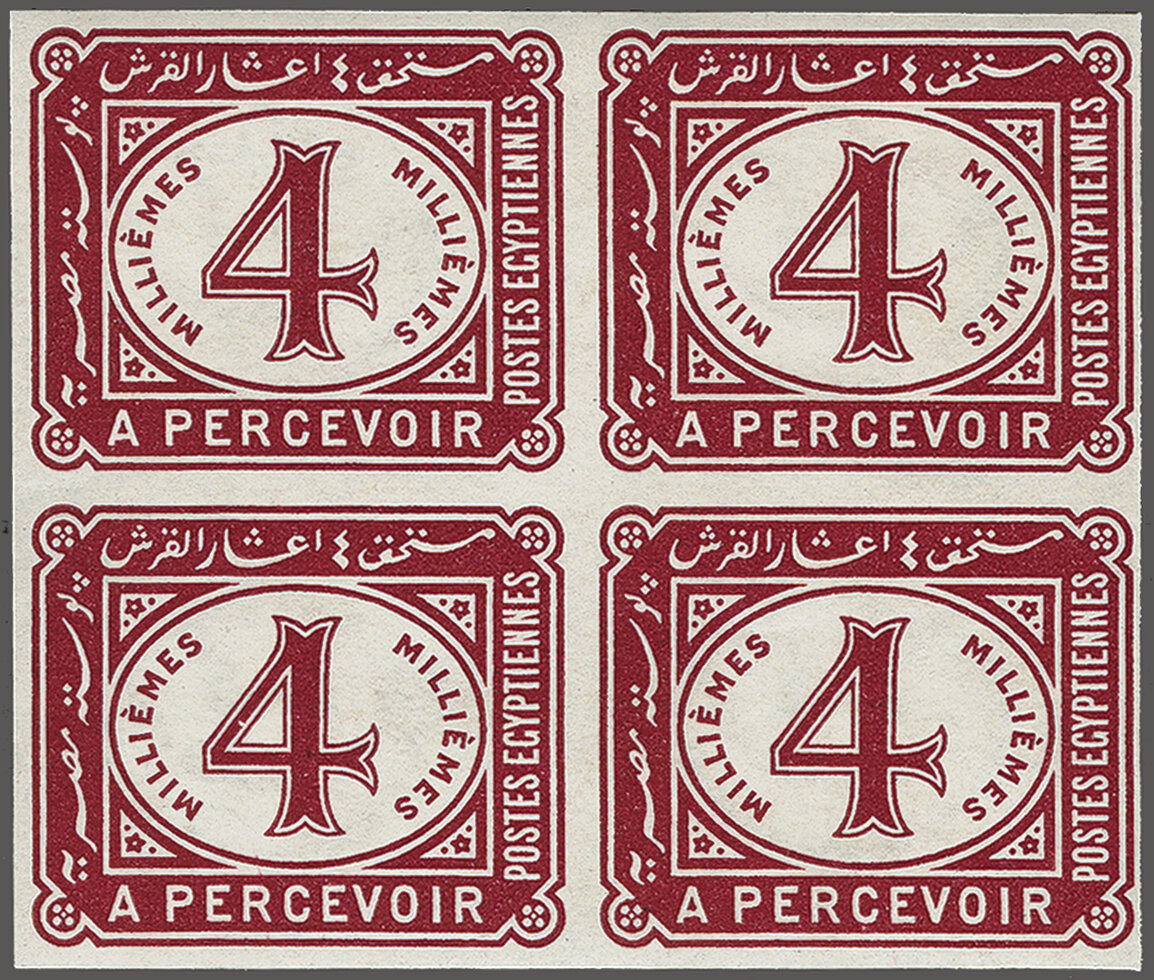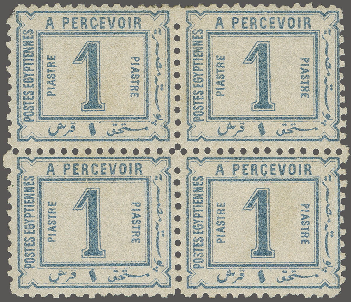 1888 (Jan 1): 1 pi. blue, mint block of four showing all types IV-III/II-I, fresh and very fine, superb colour, large part og. Signed Todd AIEP Gi = £ 520+/Nile Post PD12 = $ 1'000. (Image 1)