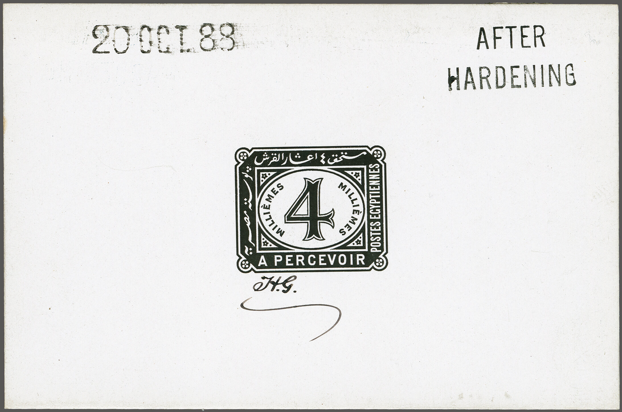 1888: De La Rue Die Proof for 4 m. value, printed in black on glazed card, struck with AFTER HARDENING and dated at left 20 OCT. 88 in black, initialled 'H.G.' at base. Rare. Signed Todd AIEP Nile Post = $ 600. (Image 1)
