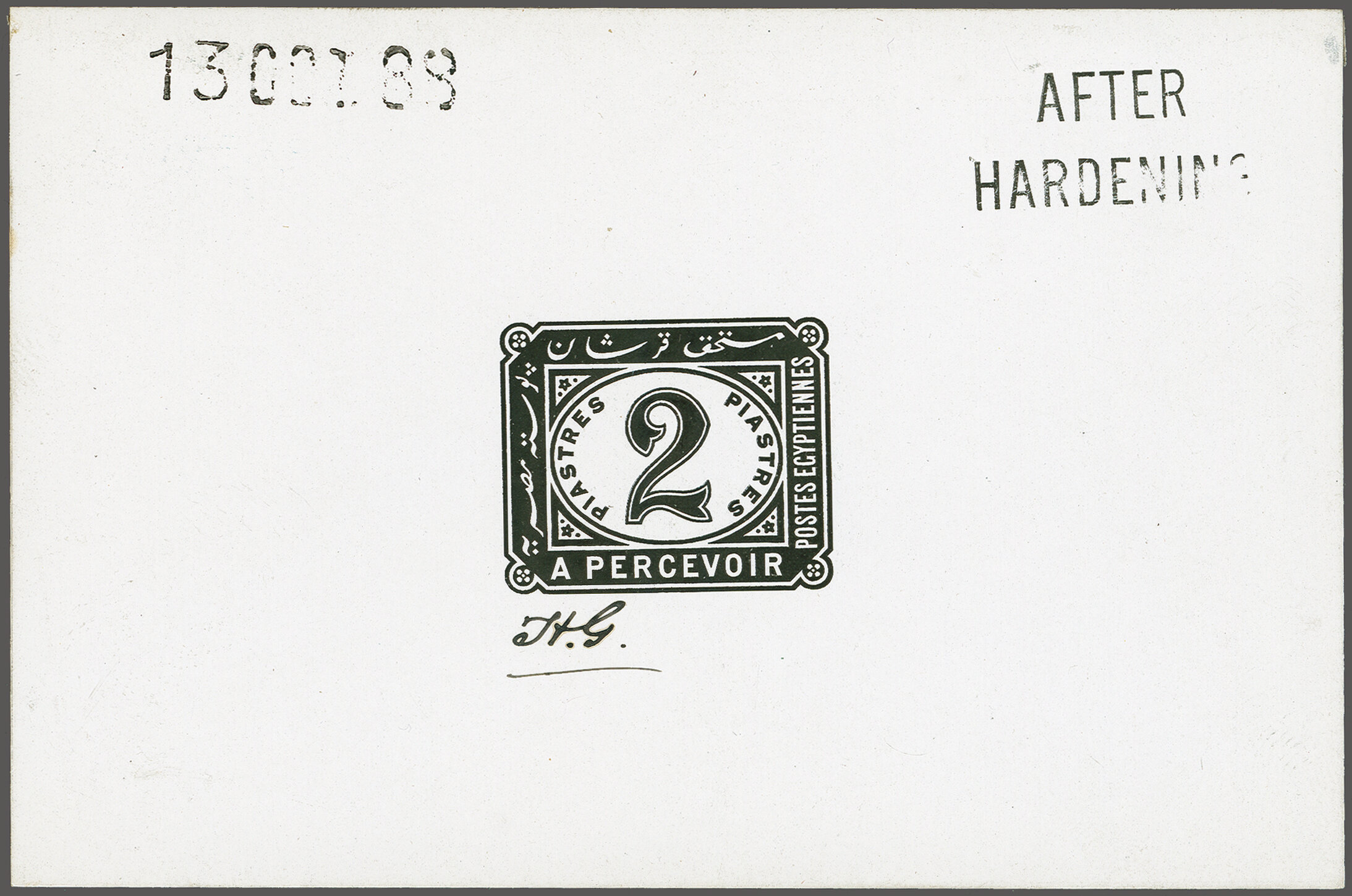 1888: De La Rue Die Proof for 2 pi. value, printed in black on glazed card, struck with AFTER HARDENING and dated at left 13 OCT. 88 in black, initialled 'H.G.' at base. Rare. Signed Todd AIEP Nile Post = $ 600. (Image 1)